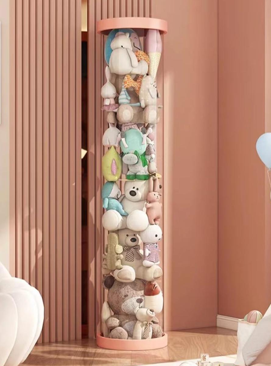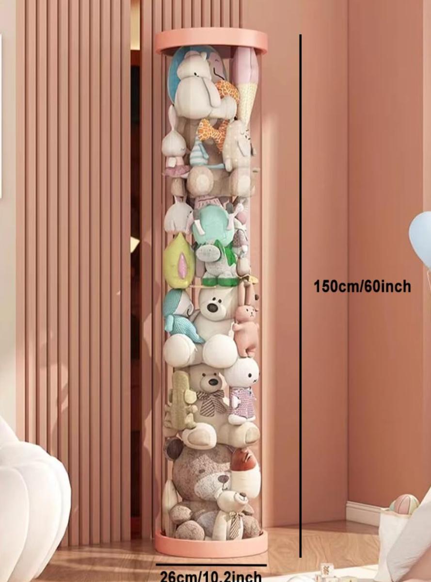 Pink Premium Stuffed Animal Storage Tube, Plush Toy Organizer, Clear Bucket with Zipper for Children's Toy Storage w/Lid