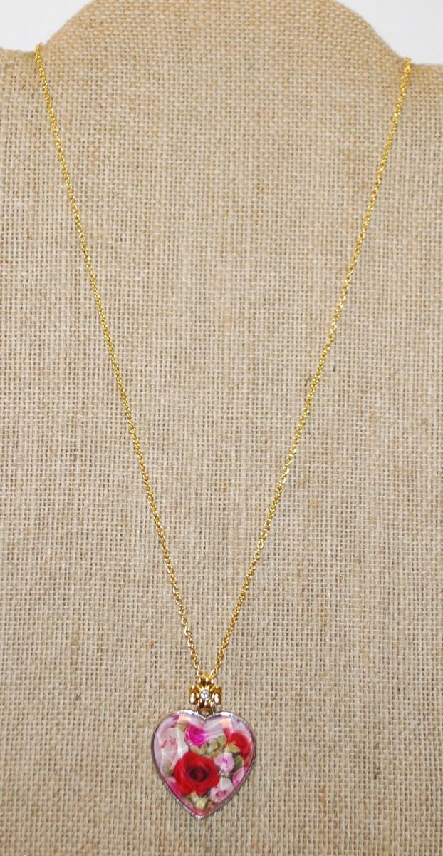 Pink & Red Roses Faceted Covered Heart PENDANT (1½" x 1") on a Gold Tone Necklace Chain 18" L