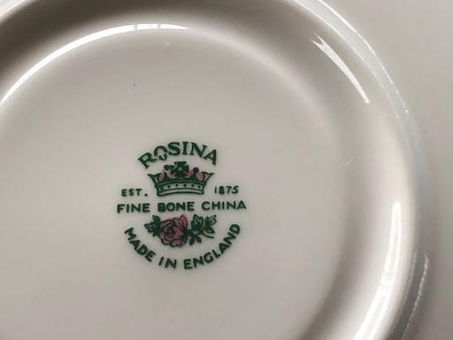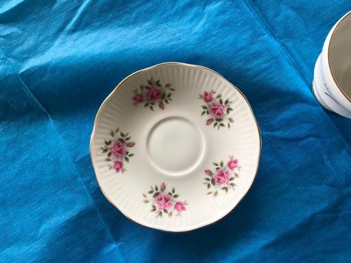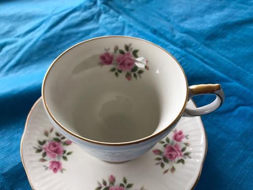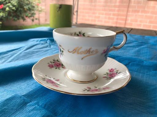 Rosina Fina Bone China Teacuop & Saucer. Pink roses and the word "Mother" across the front.