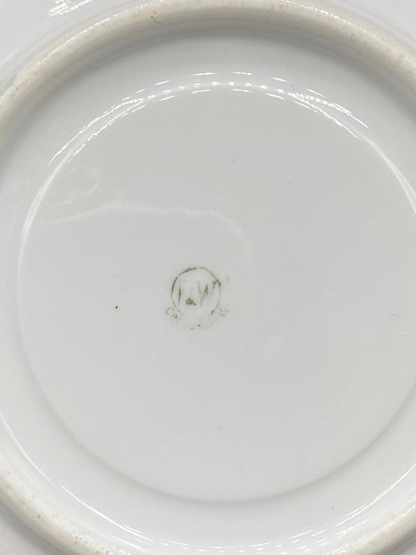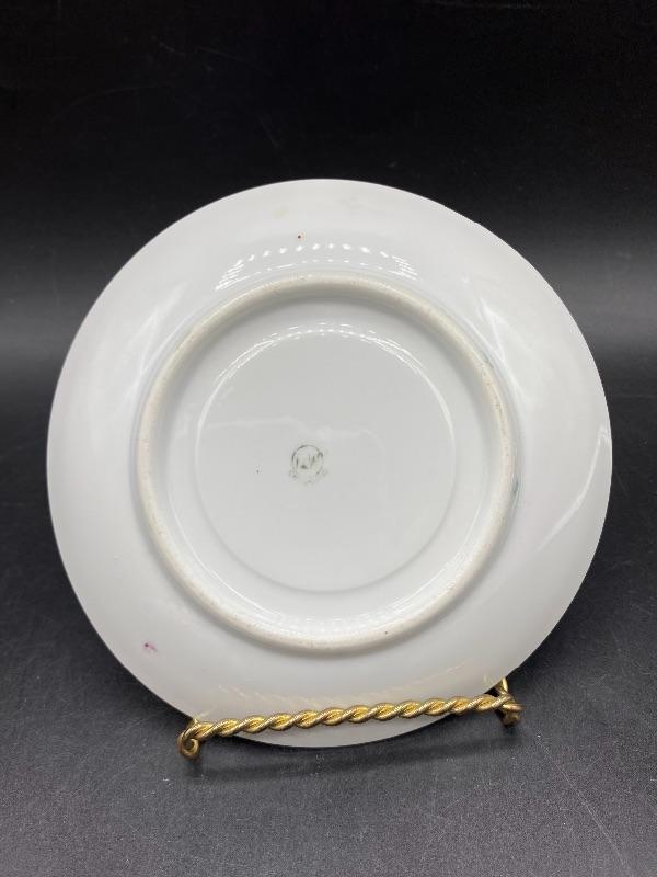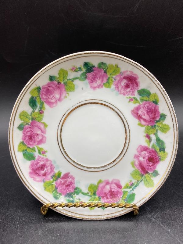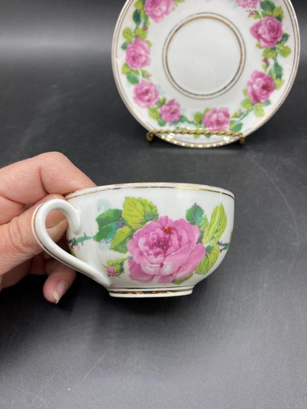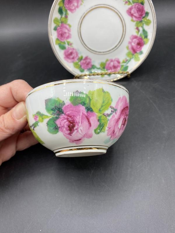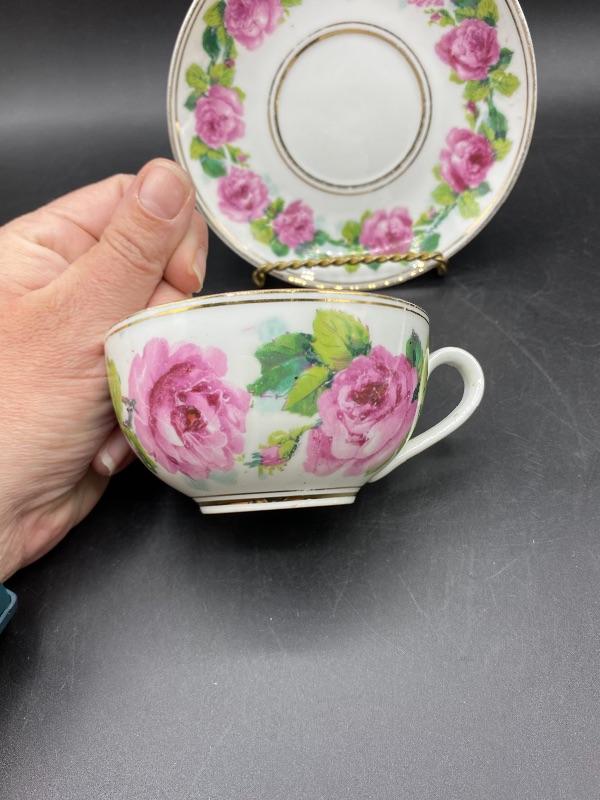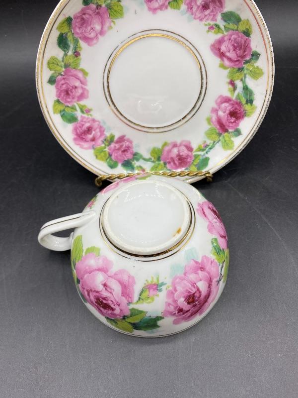Pink roses tea cup and saucer. Gold accent lines. Light wear from age. The cup is unmarked but there is a faint mark on saucer, looks like FW possibly. No chips.