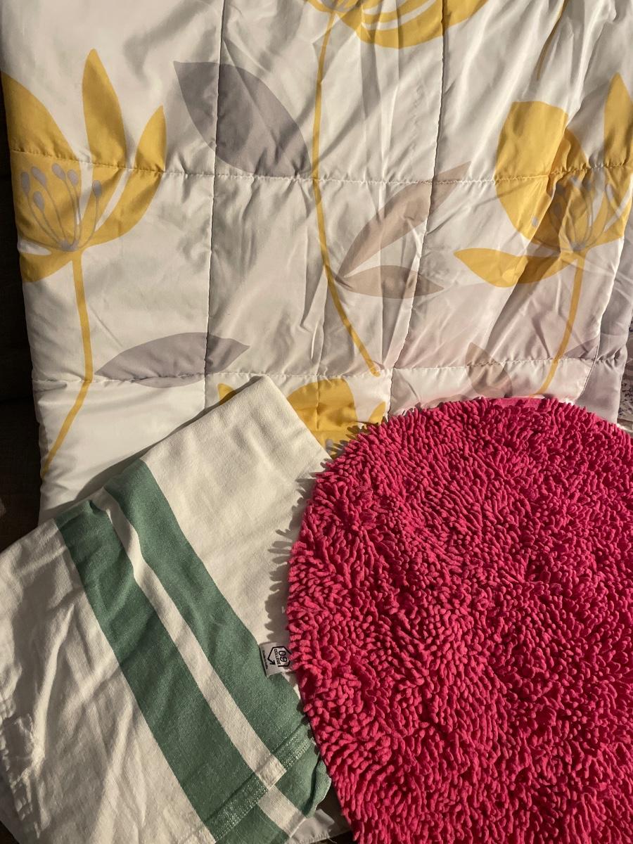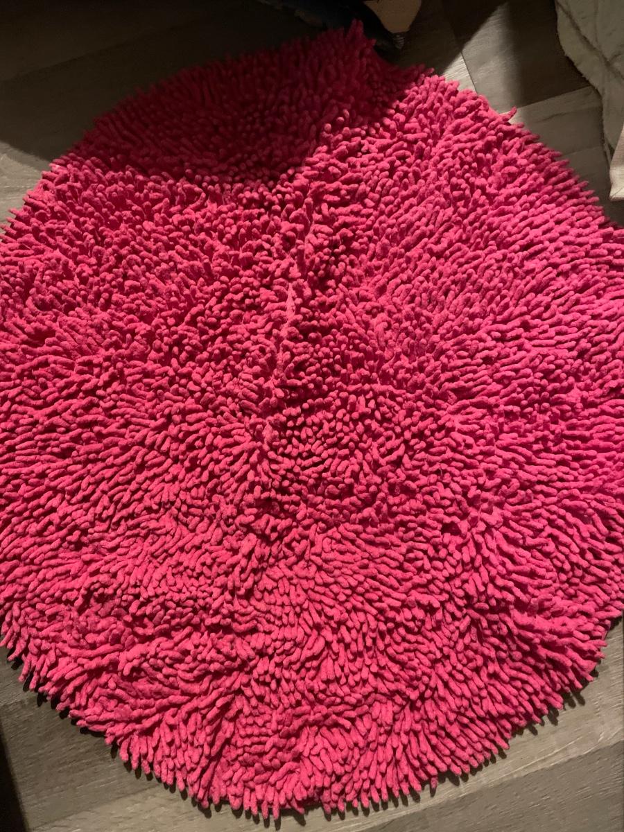 Pink round bath rug with comforter and blanket