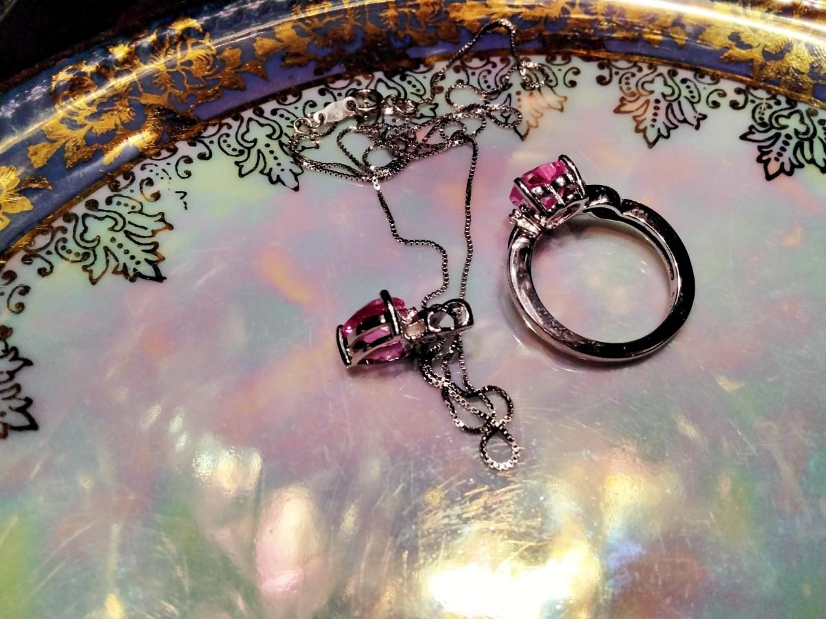 This is a brand new from factory vault necklace and ring set. The sterling is all plated with genuine Rhodium and will never tarnish. Rhodium is MORE expensive than gold or platinum! The stones are gorgeous flawless lab grown pink sapprire measuring 9mm. They are beautiful, expertly cut and polished. The ring is a good heavy cast sterling silver and in addition to the heart stone has two small genuine diamond accent stones and the pendant has one genuine diamond accent stone. The ring is size 7. The Necklace chain is fine box chain measuring 18 inches long.