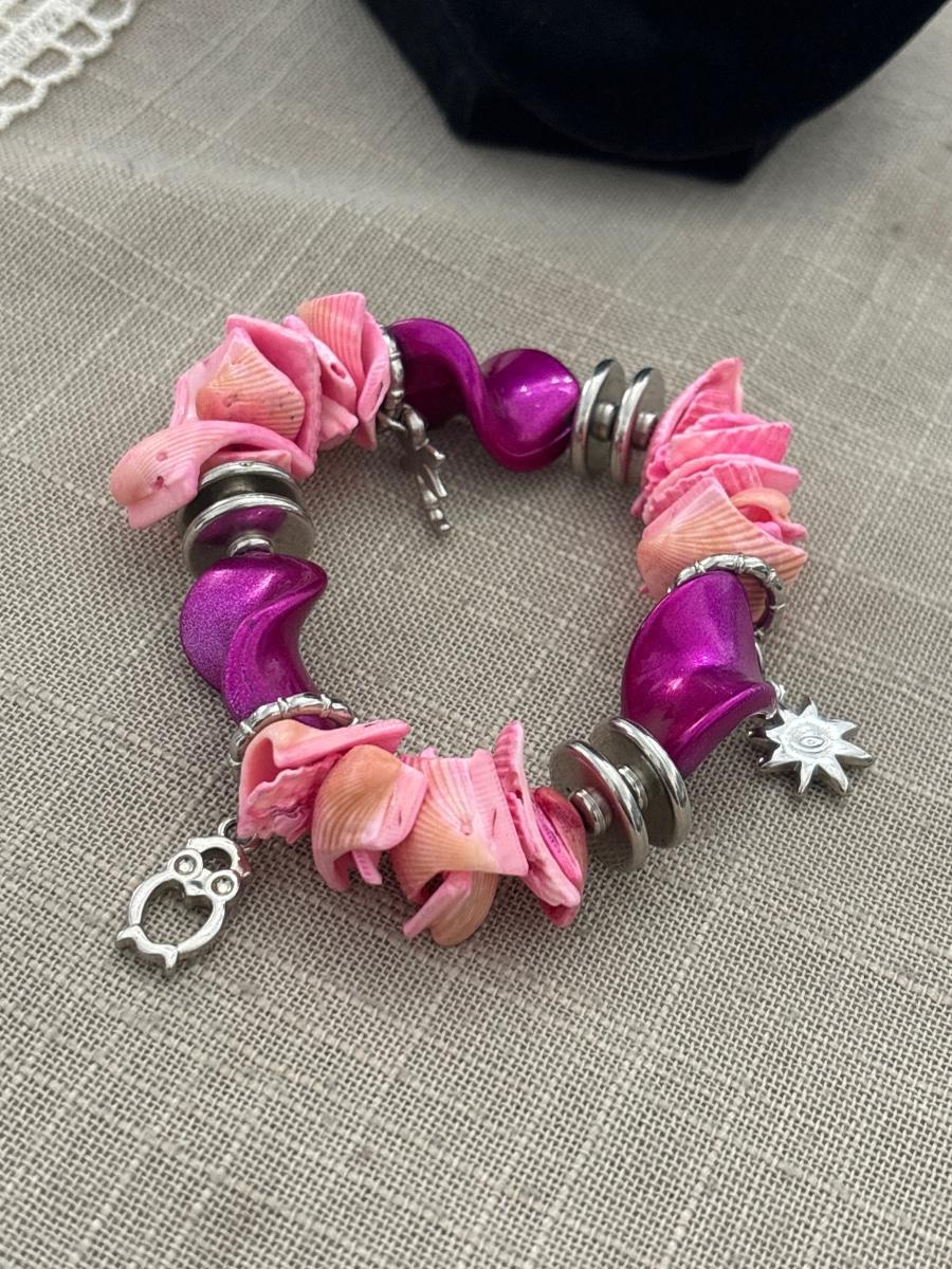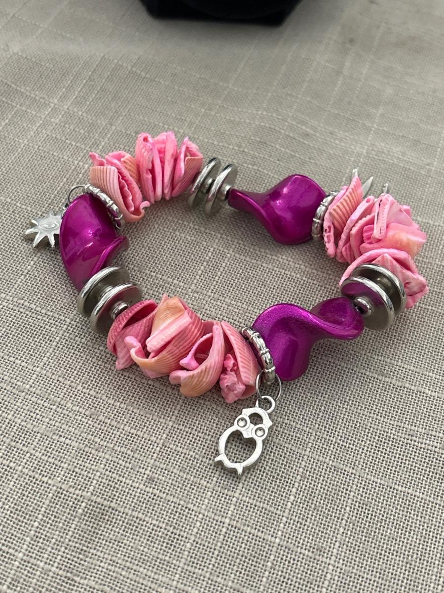 Pink Shell Nugget, Ceramic Bead, Burnt Silver Metal Charm Flex Bracelet