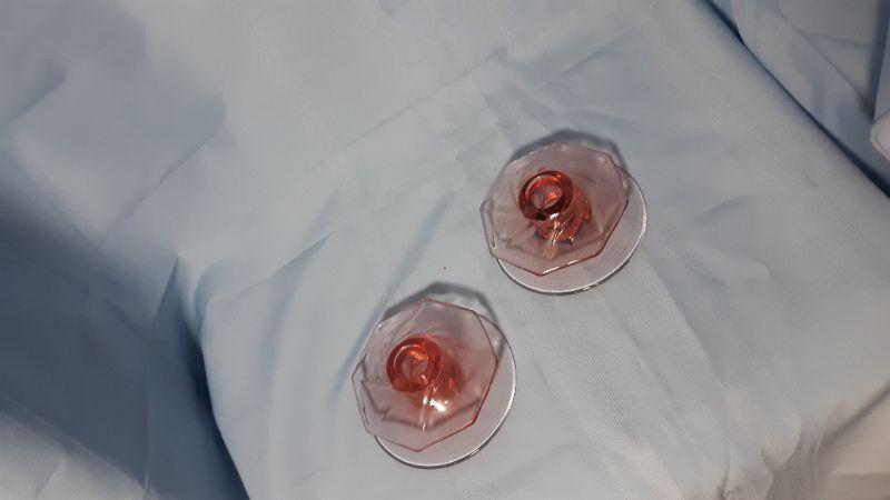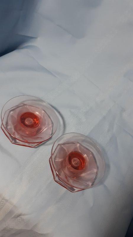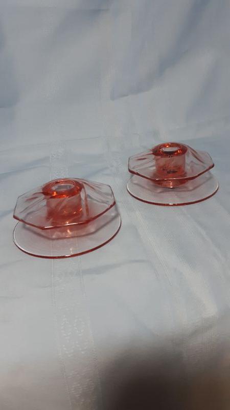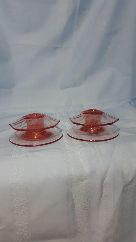 Pink spinning glass low candlesticks, 4"W x 2"H