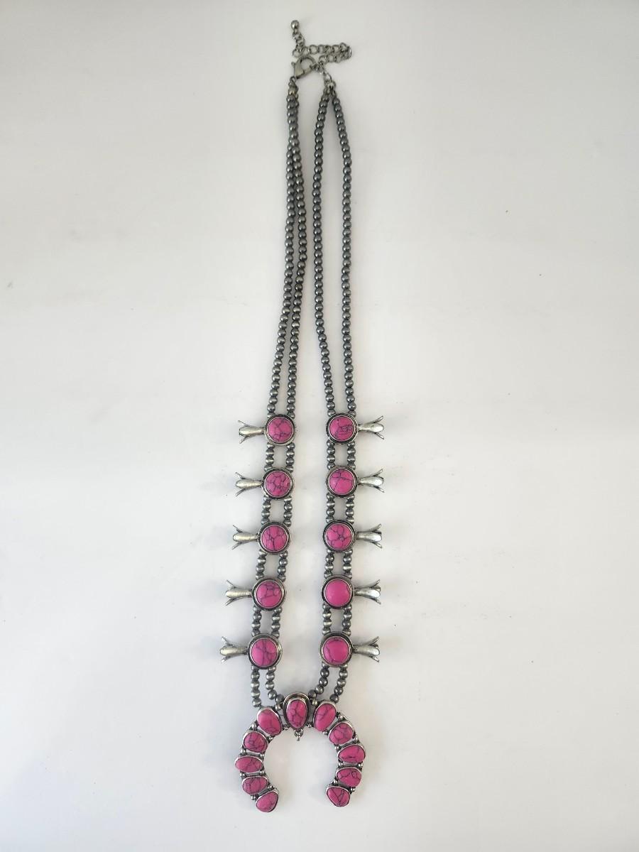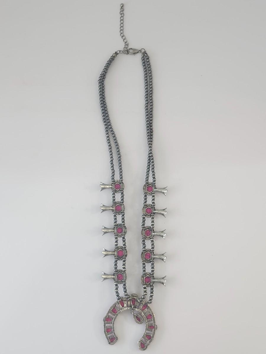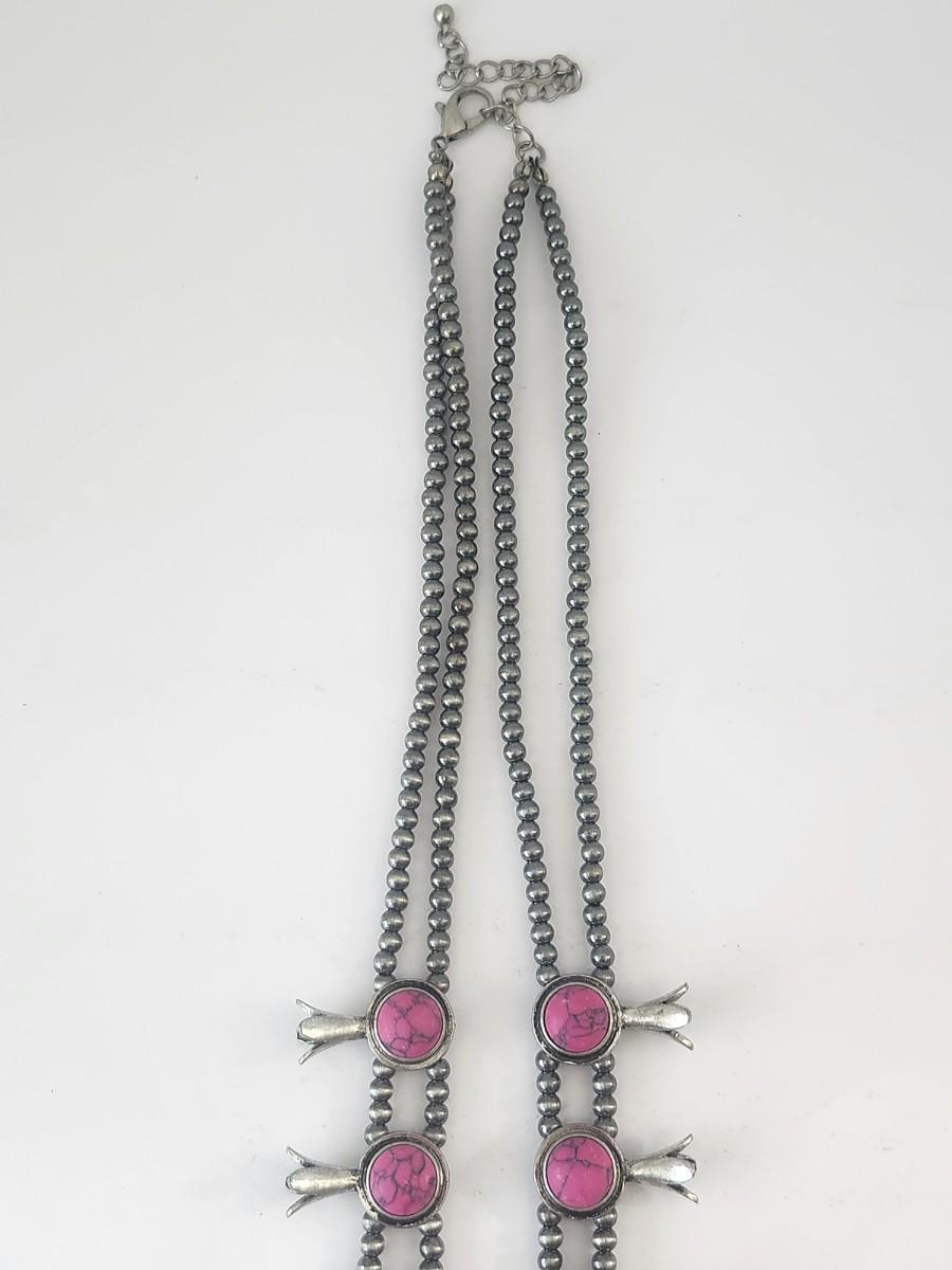 Pink Stone Crescent Pendant Double Strand Beaded Necklace Silver Tone Southwestern Style Statement