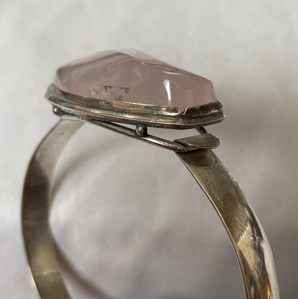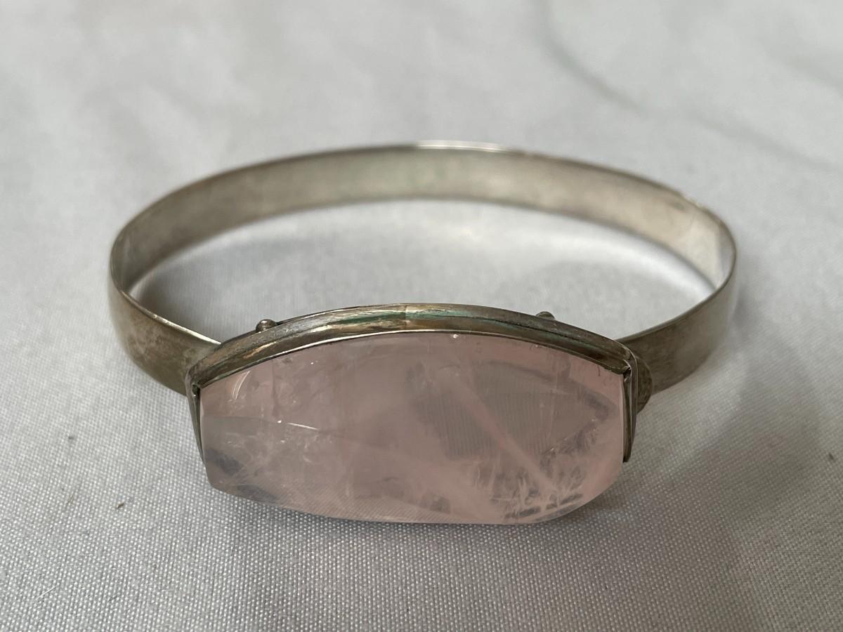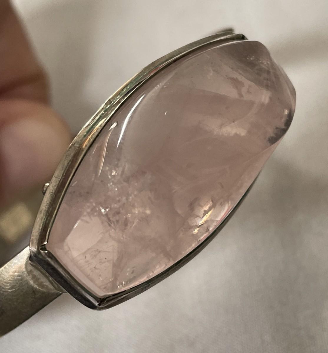 The bracelet doesn't have any markings, but it has the appearance of sterling silver. The stone is a light pink possibly rose quartz, highly polished with a little bit of faceting. It will fit a large wrist.