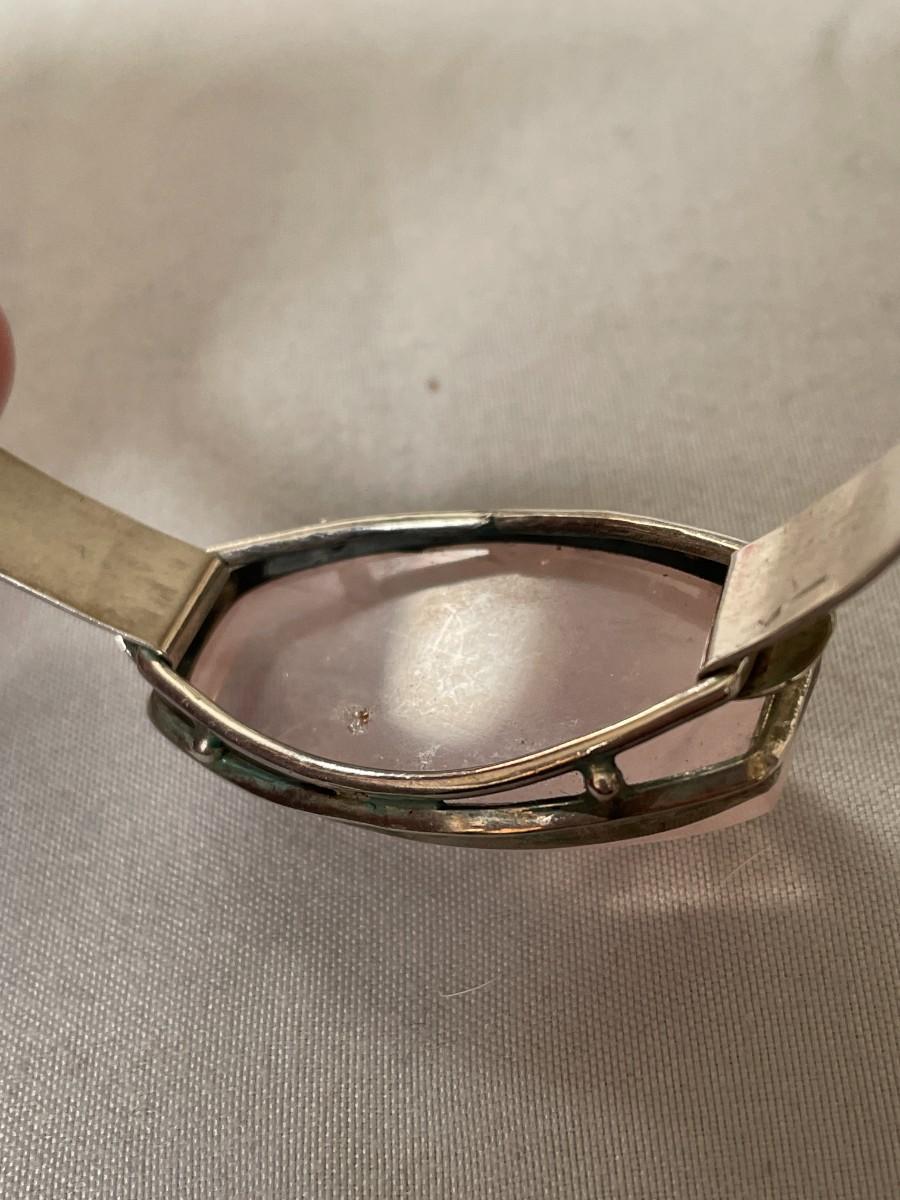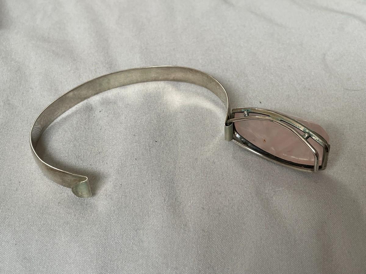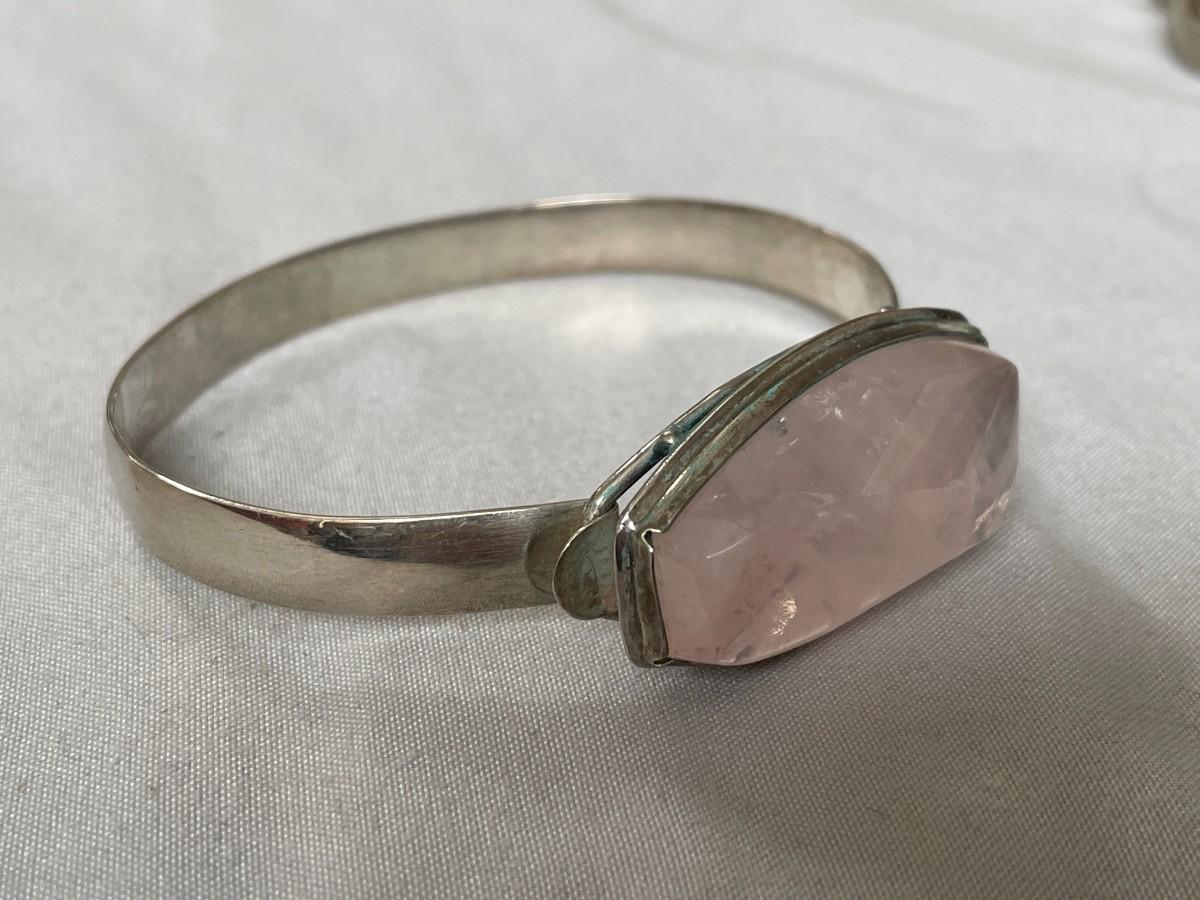 The bracelet doesn't have any markings, but it has the appearance of sterling silver. The stone is a light pink possibly rose quartz, highly polished with a little bit of faceting. It will fit a large wrist.