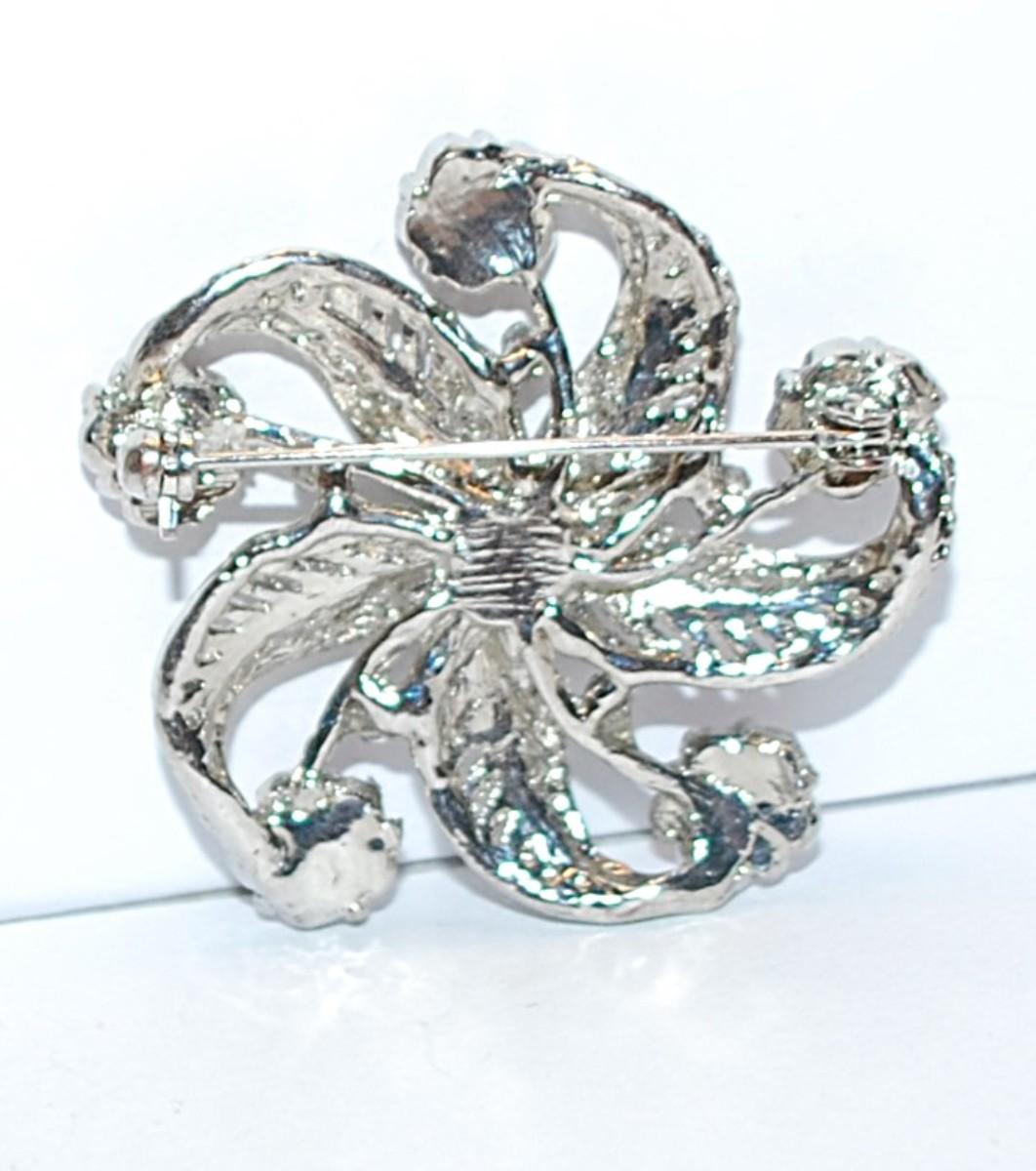 PINK Swirl Flower BROOCH (1½" Diam.) with 5 Curved Leaves & 36 Round Pink Stones on a Silver Tone Setting
