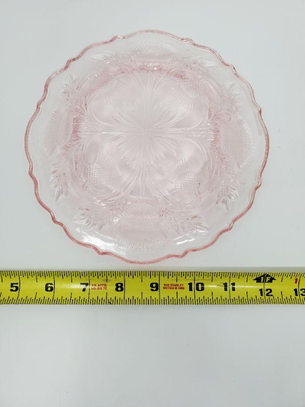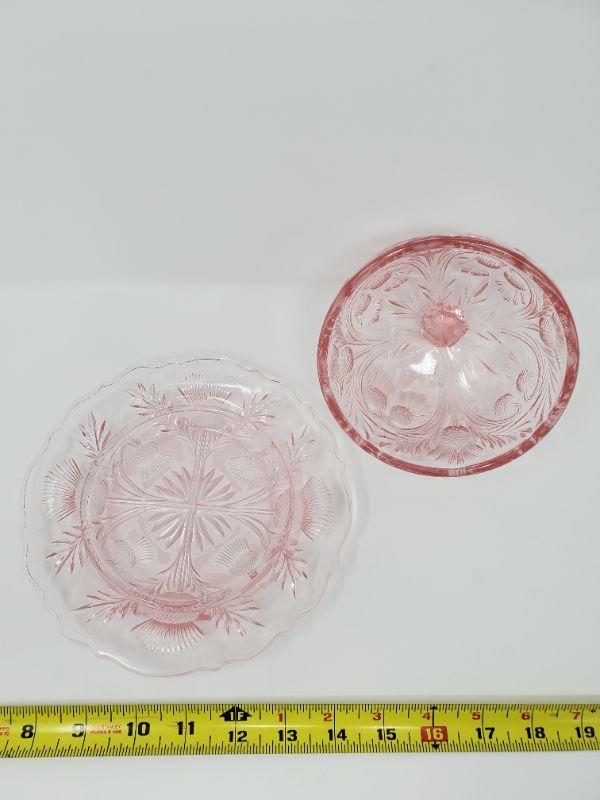 Pink glass with inverted thistle design, scalloped edge and dome lid.