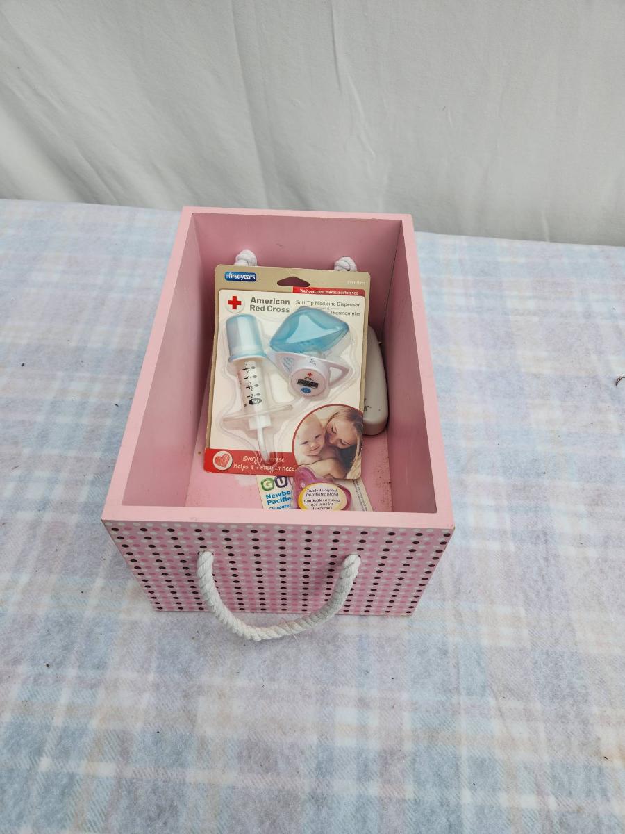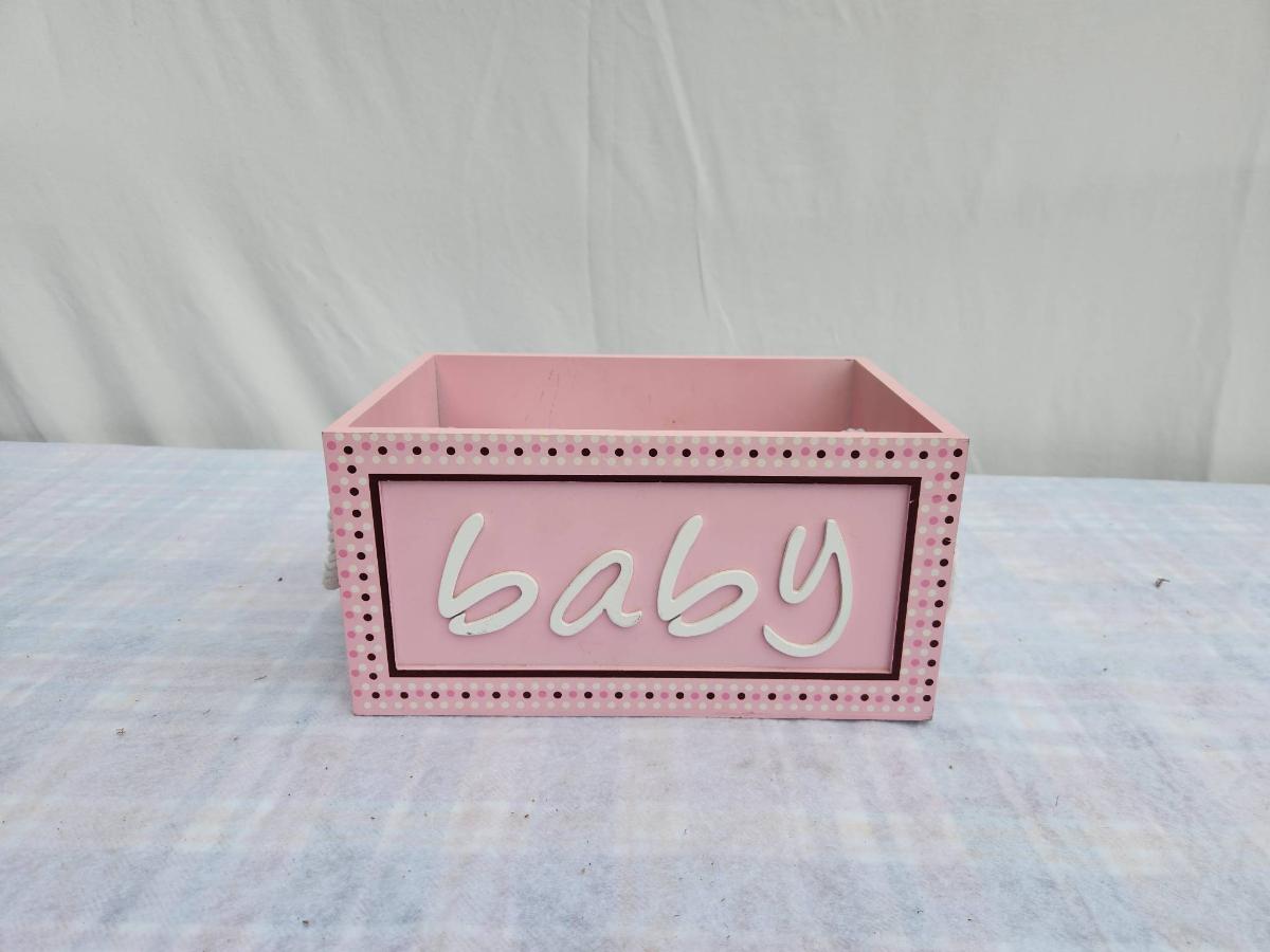 Pink wooden storage box featuring a decorative 'baby' sign in white lettering and a polka dot border. Includes white rope handles for easy carrying. Comes with baby care items including an American Red Cross bulb syringe and nasal aspirator. Practical for organizing baby essentials.
