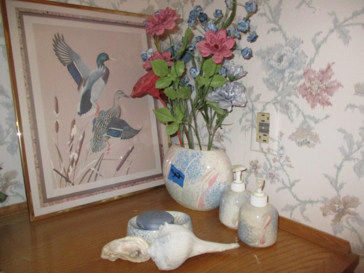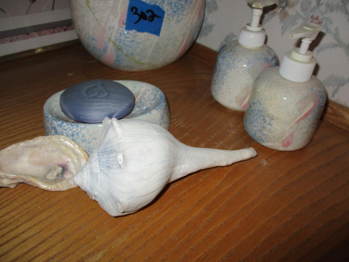 Dispensers. Vase has a crack. Picture. Shells. Soap dish