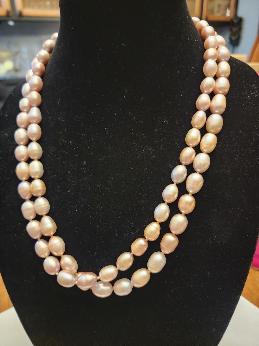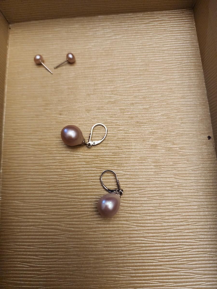 Pink purple colors. 36 in strand. Both sets earrings. Back missing on the studs.
