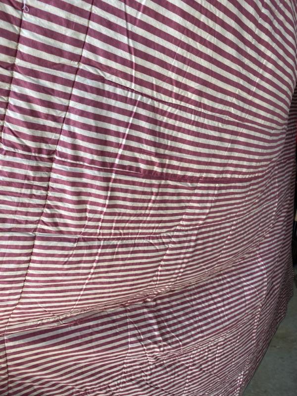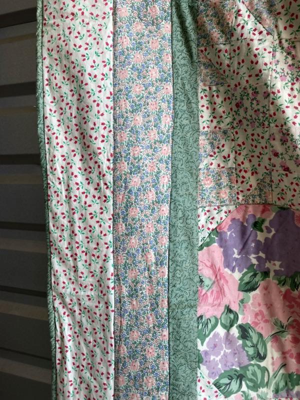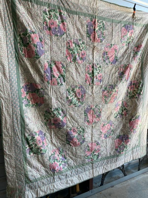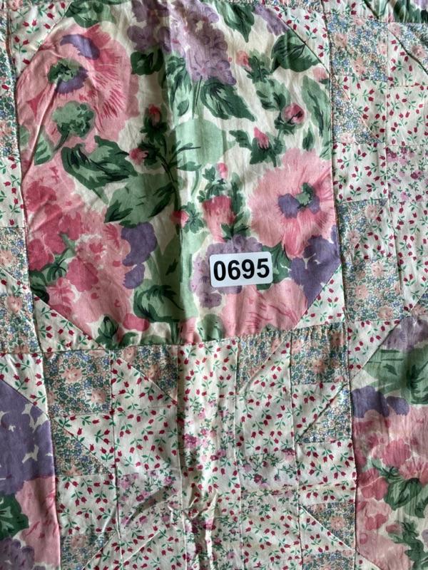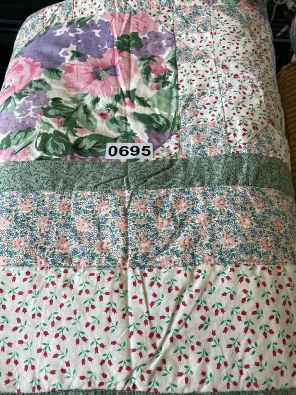 Pink/Purple/Green Floral Squares/Pink and White Stripe Back Quilt 80x80-Lot 695