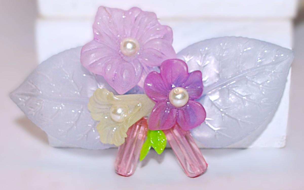 PINKS & YELLOW Acrylic BROOCH (3¾" x 2") with Faux Pearl Centers and Silver Tone Pin Back