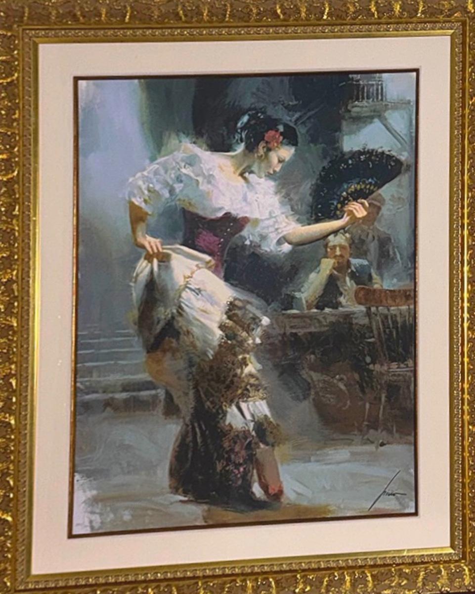 This original oil on canvas portrays a Spanish flamenco dancer in mid-performance, beautifully rendered with Pino’s expressive brushstrokes and masterful use of light and color.
