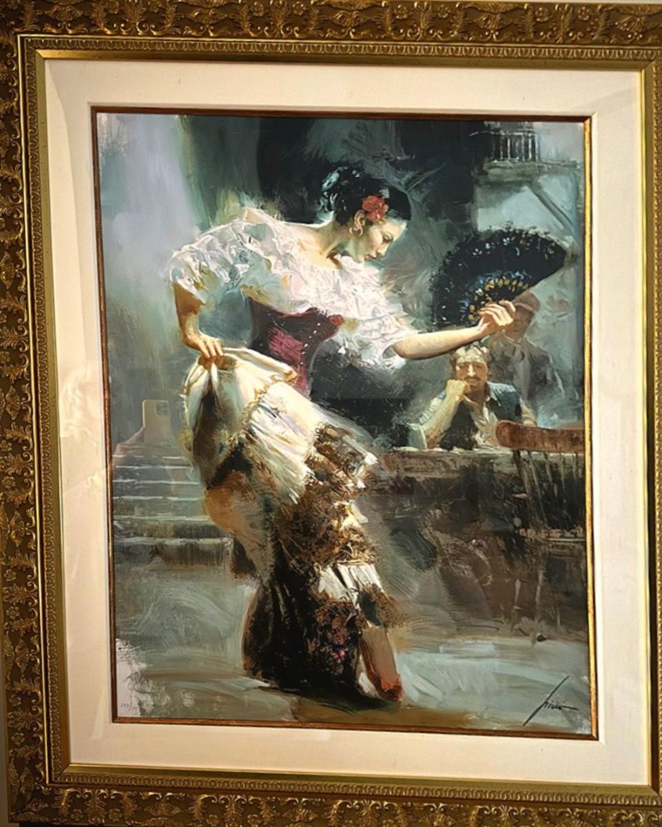 This original oil on canvas portrays a Spanish flamenco dancer in mid-performance, beautifully rendered with Pino’s expressive brushstrokes and masterful use of light and color.