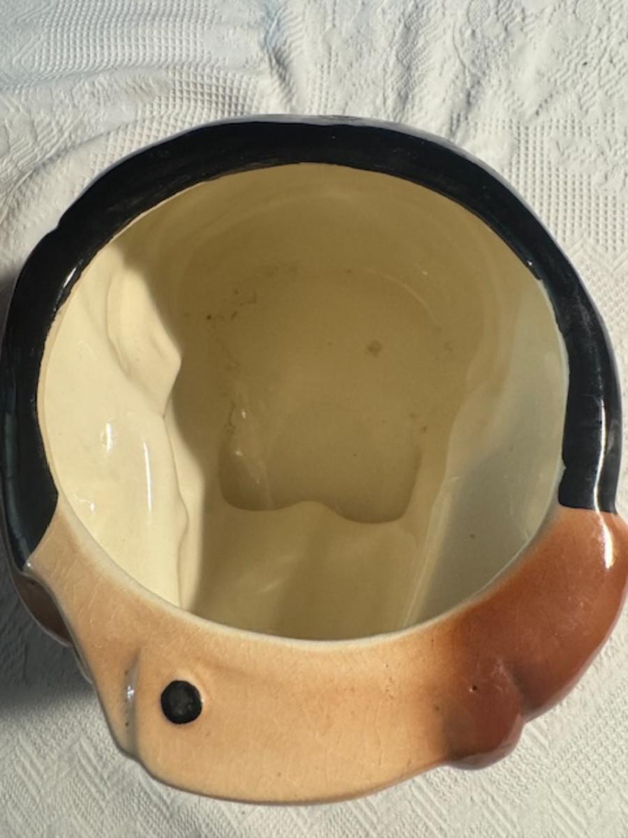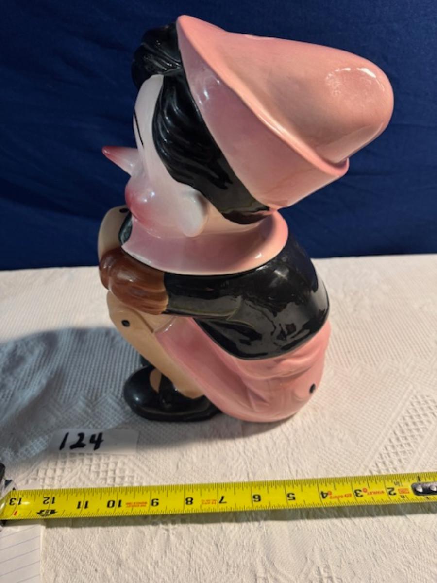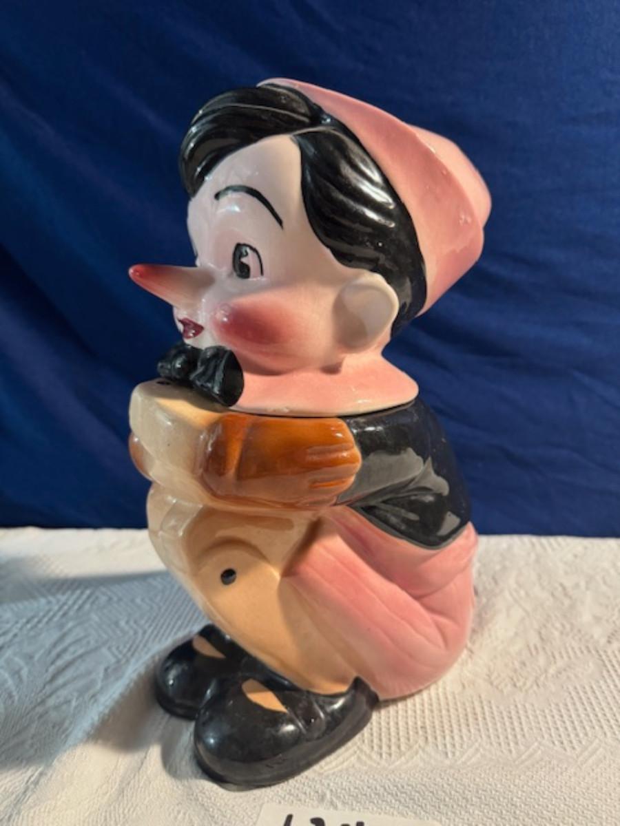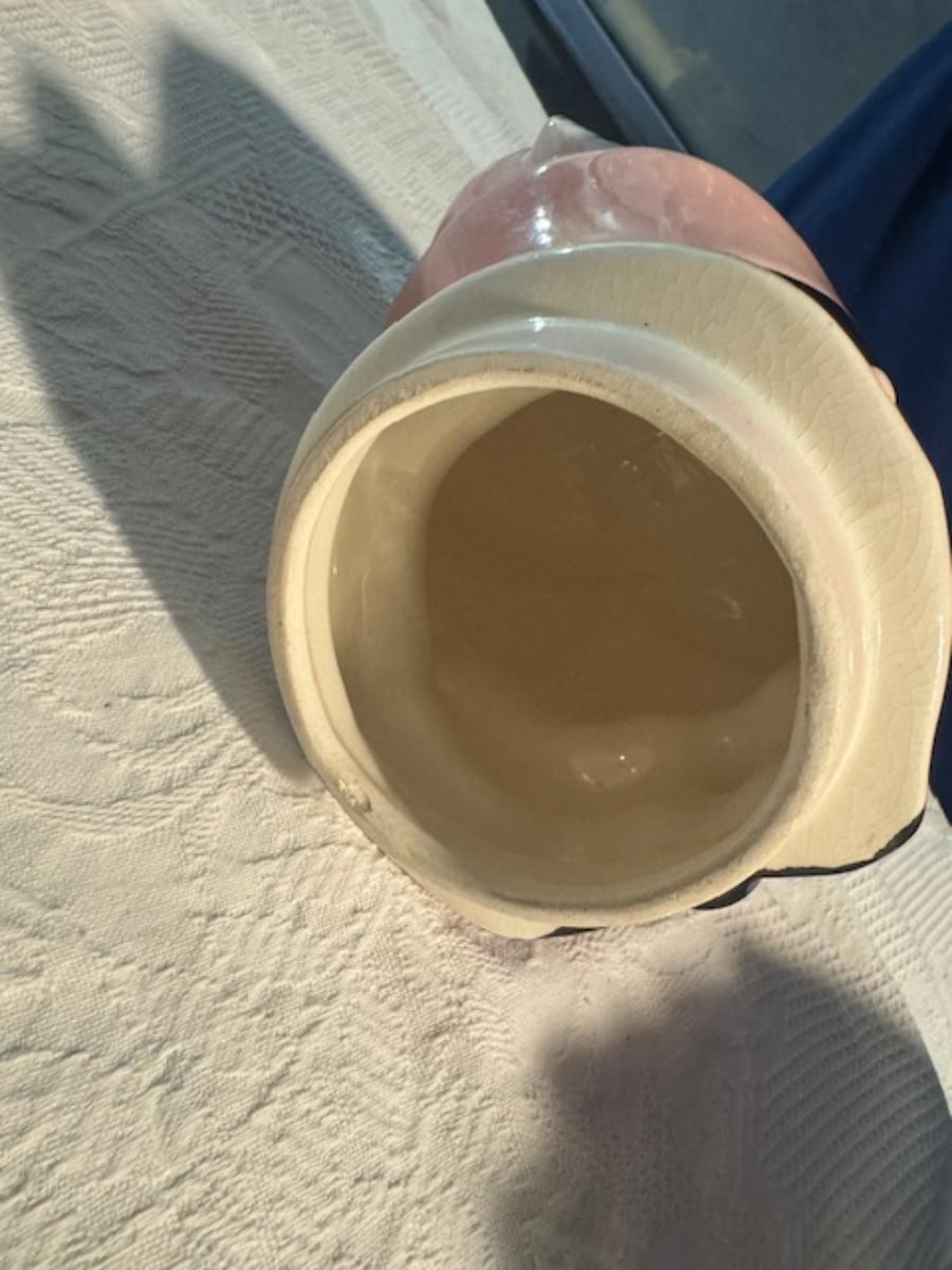 Very cute cookie jar as found. Slight crazing, and a couple of small chips see pics for more details. 8" x 12" x 6"