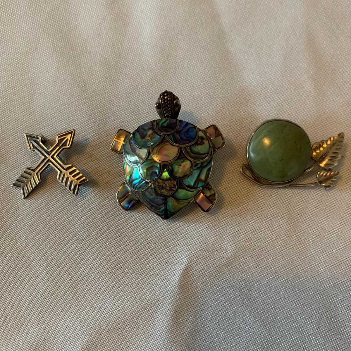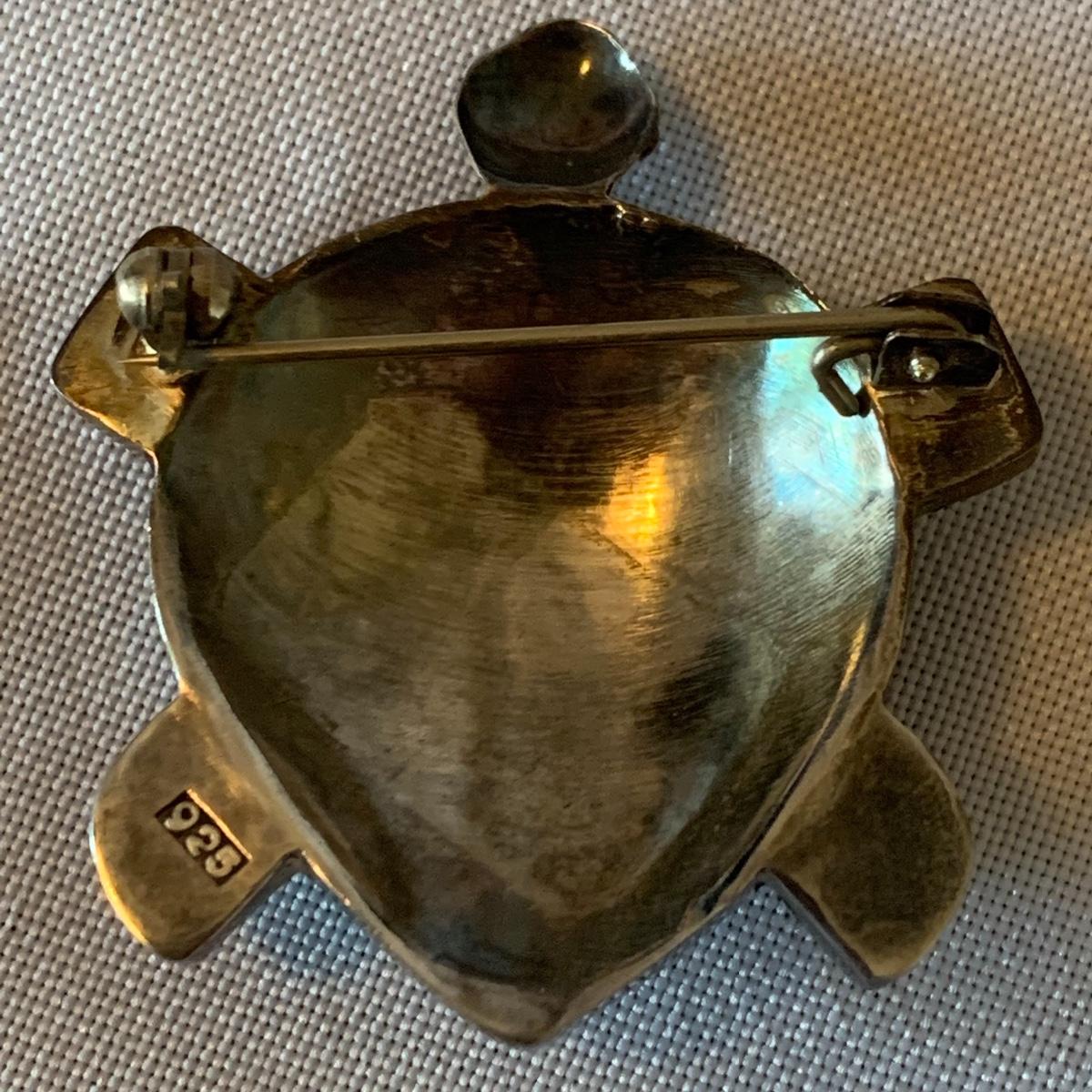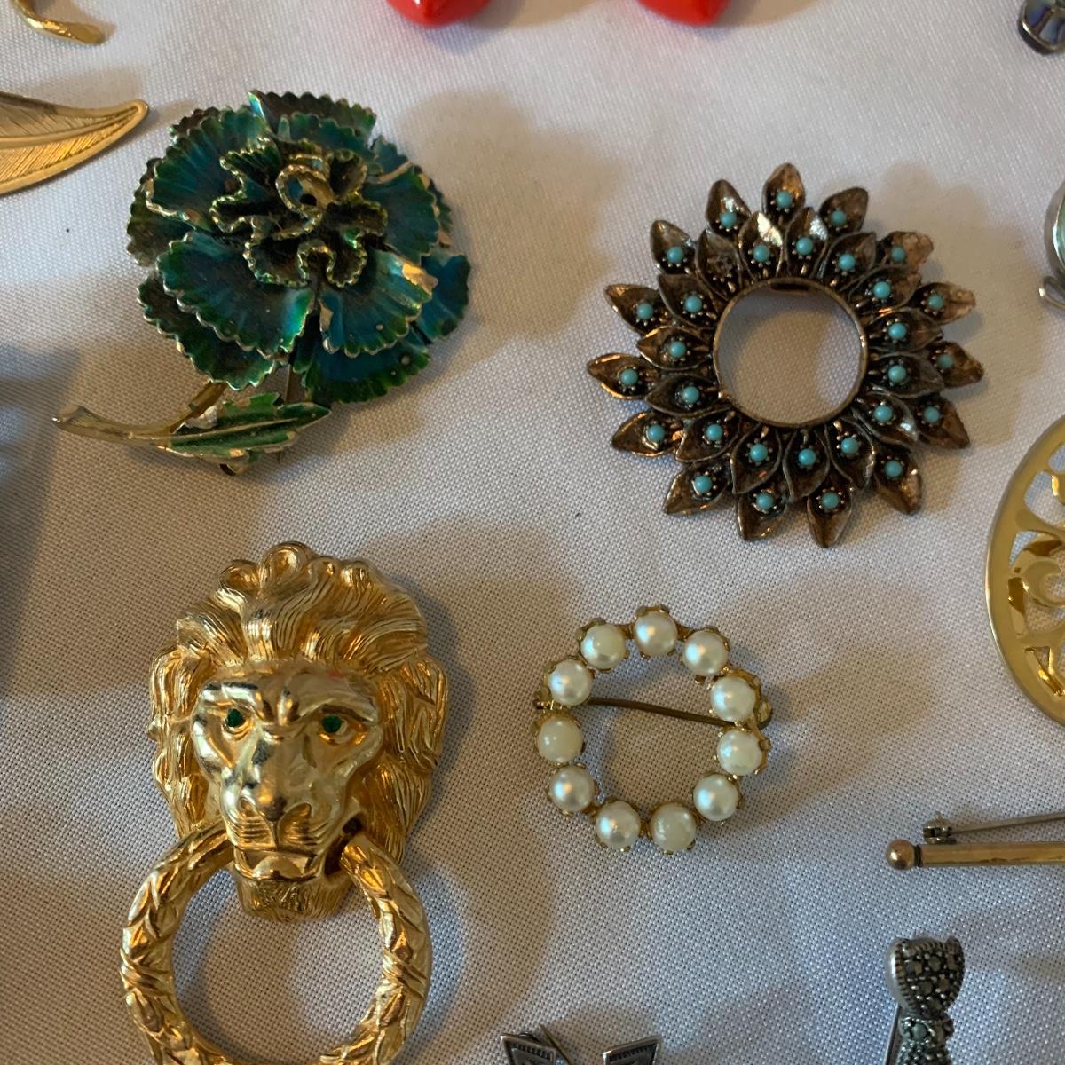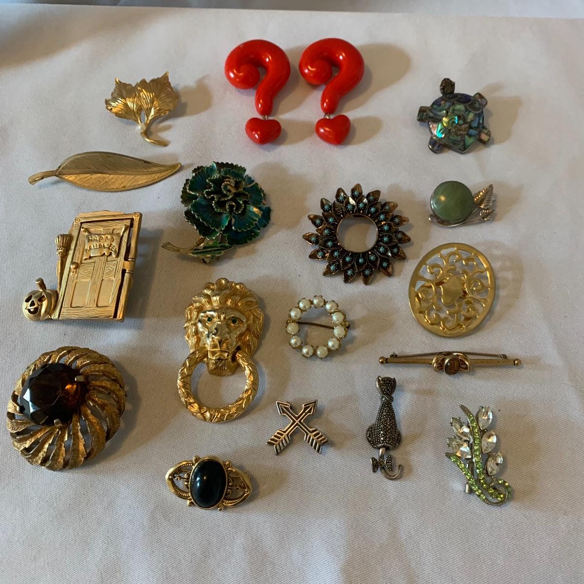Eighteen pieces in this lot of mostly pins with one gold colored scarf slide. Three Sterling/925 pins (pix together with turtle), a few signed pieces and two 1982 Hallmark pins. Shipping available.