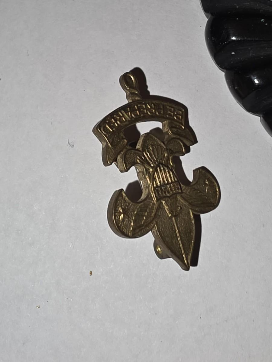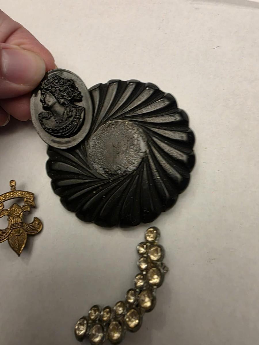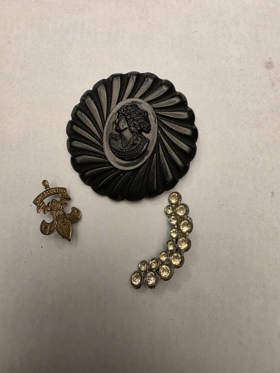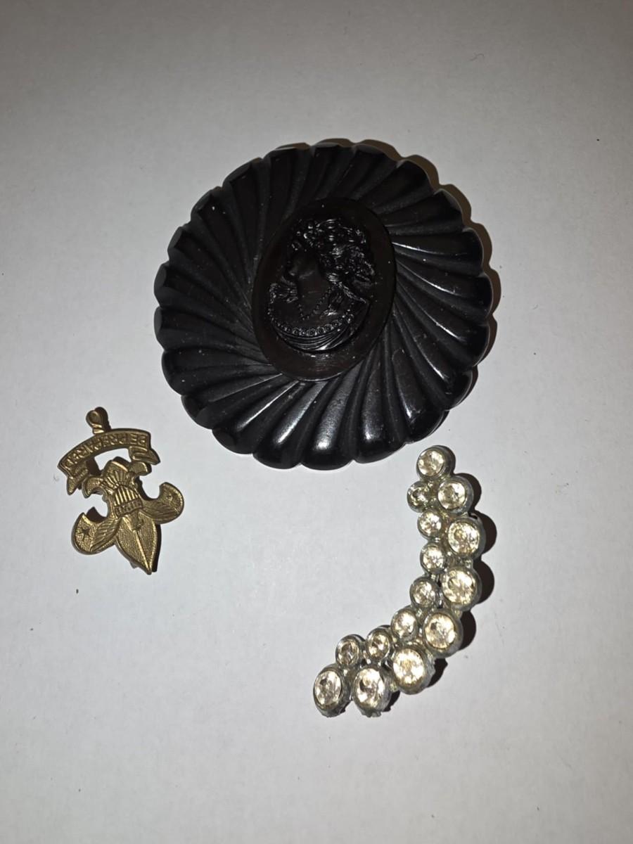 The black pin is heavy plastic with cameo. The cameo is broken off but could be repaired. It is about 3 inches. The Rhinestone pin is about two inches and small gold tone pin