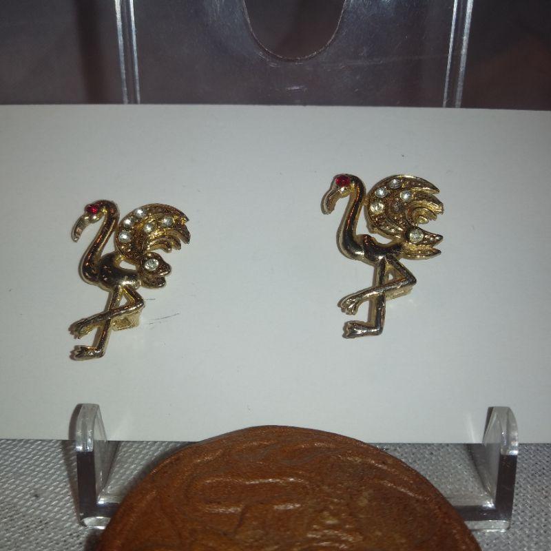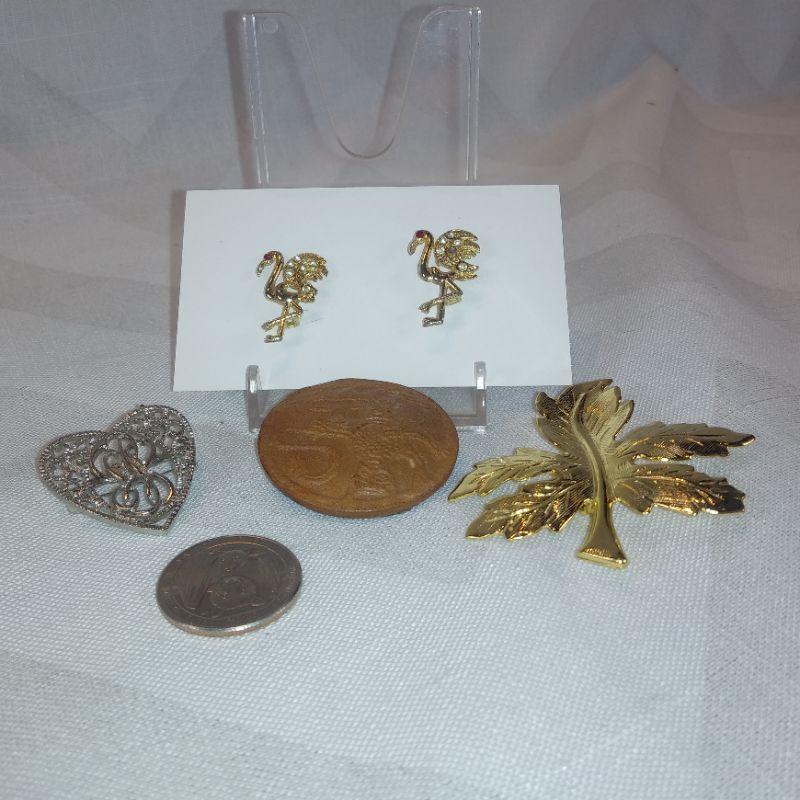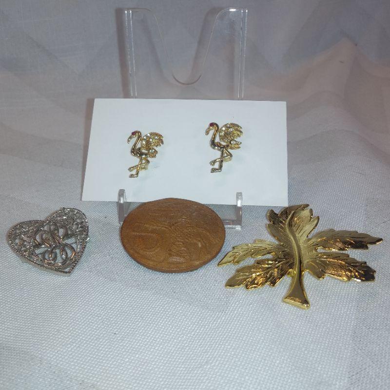This auction lot is for a Quintet of Pins/Broaches. The grouping includes 2 Flamingo Stick Pins and a Leather-stylized Leopard, a Silver-toned Heart and a gold-toned Leaf Broach . All are in very good condition and ready to wear.