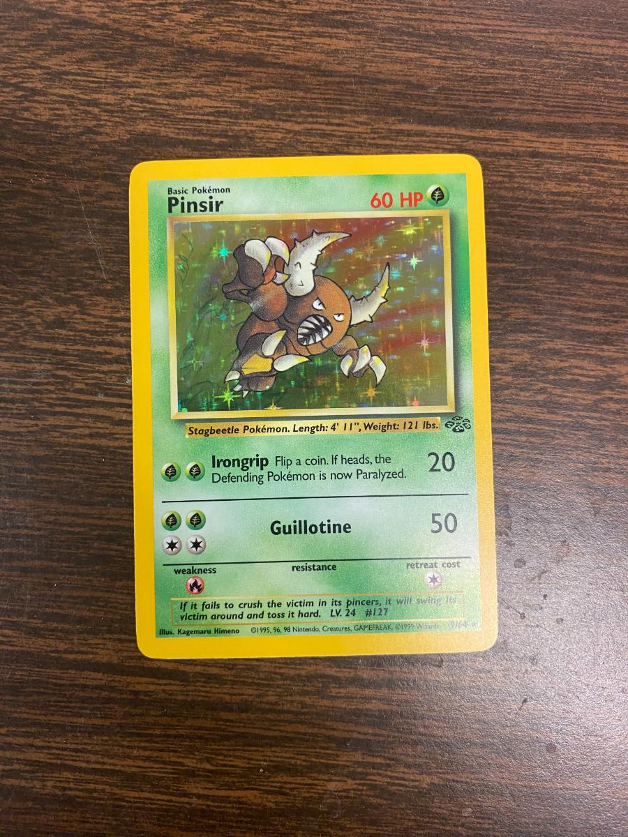 Pinsir holographic Pokemon card from the Base Set. Card has 60 HP and features the Iron Grip and Guillotine moves. Condition is noted as light play, with minor surface wear visible. This card is an official Pokemon TCG product and notable for its Base Set origin.