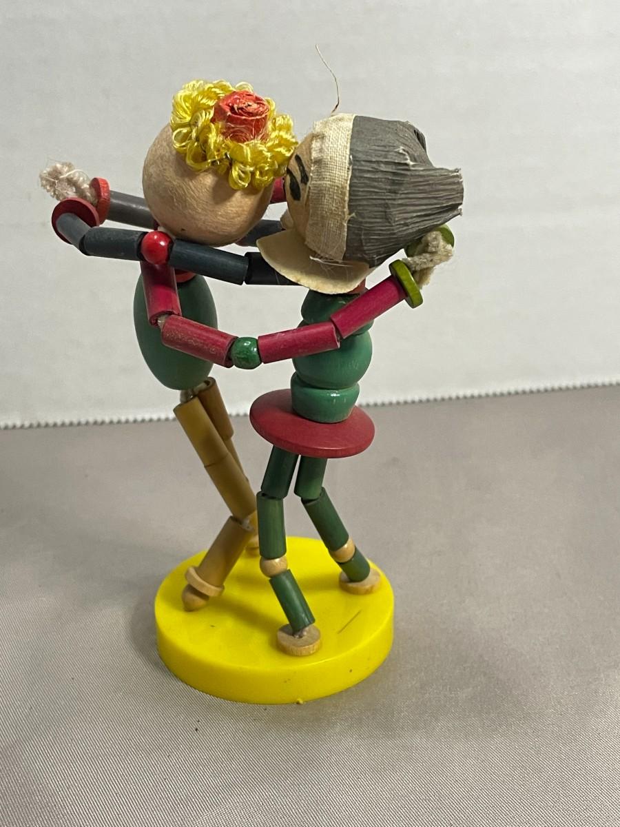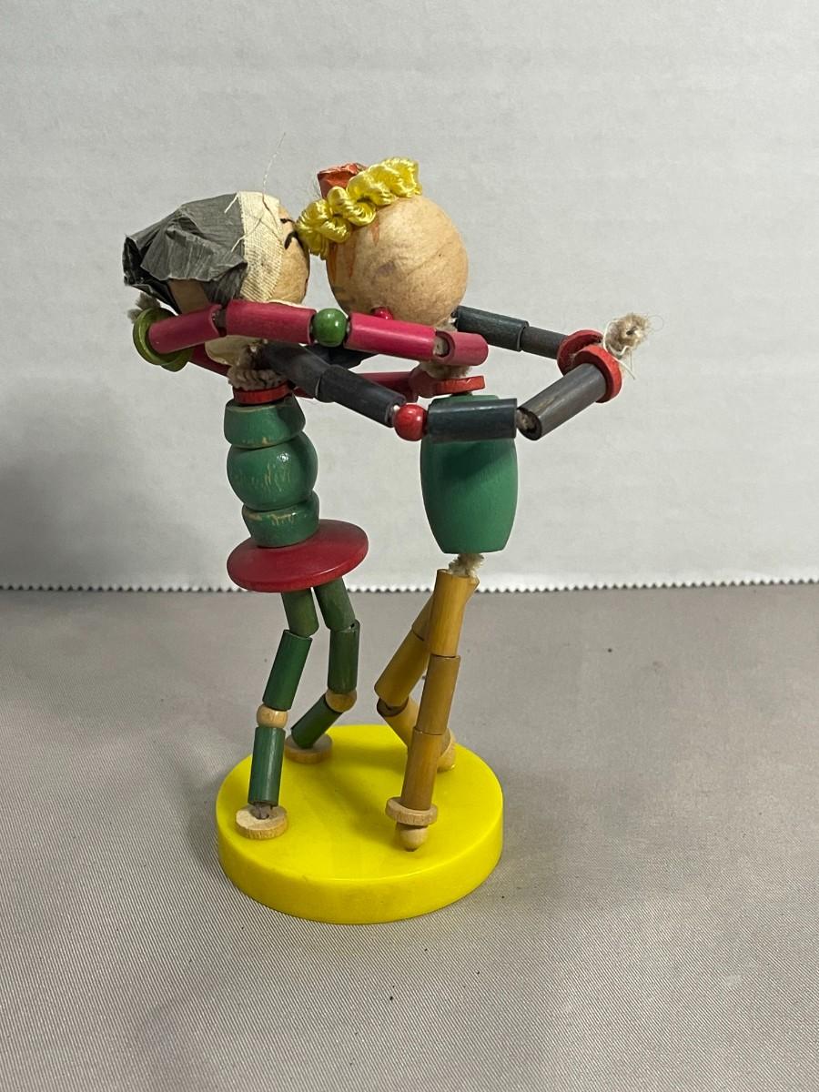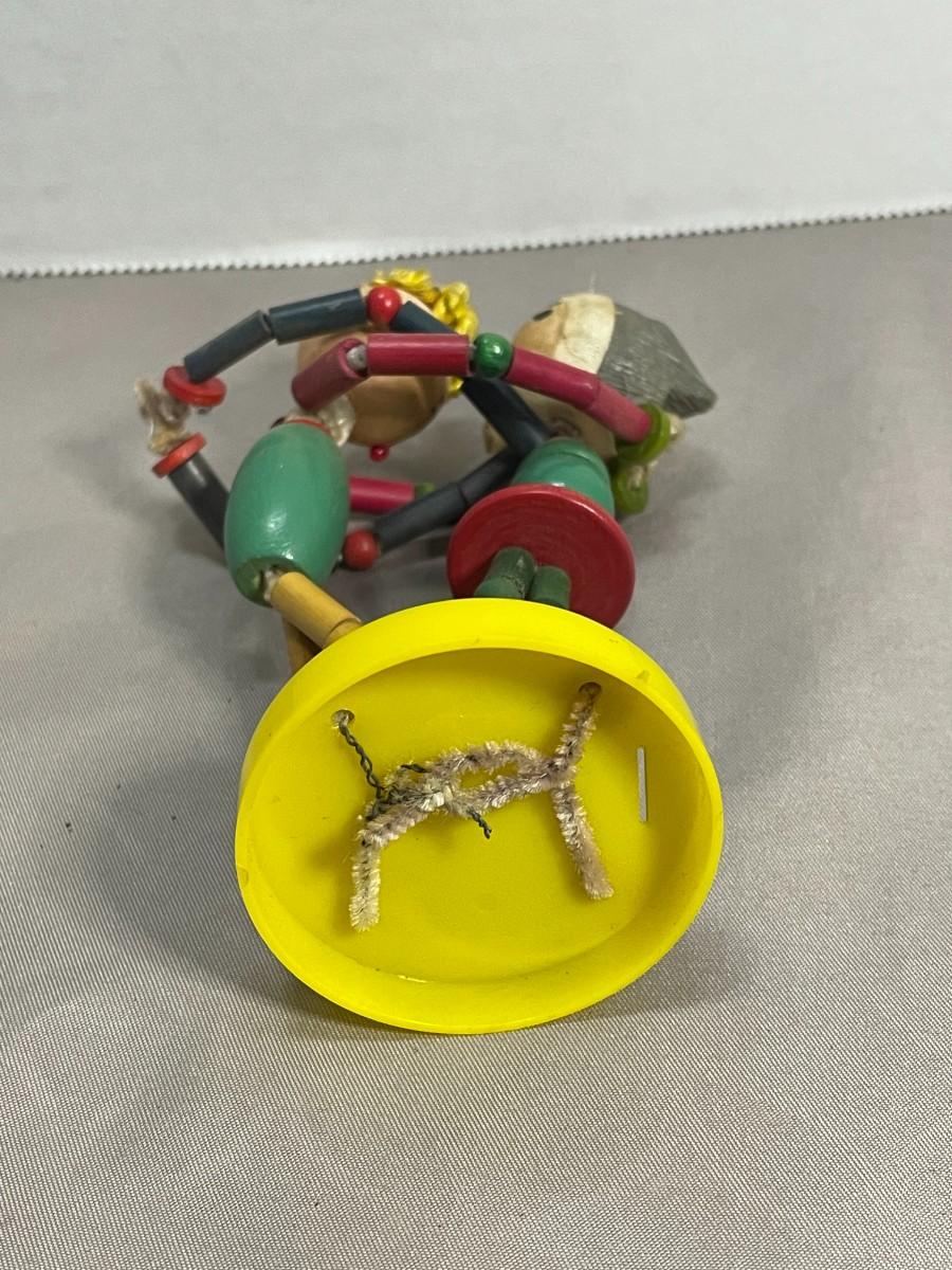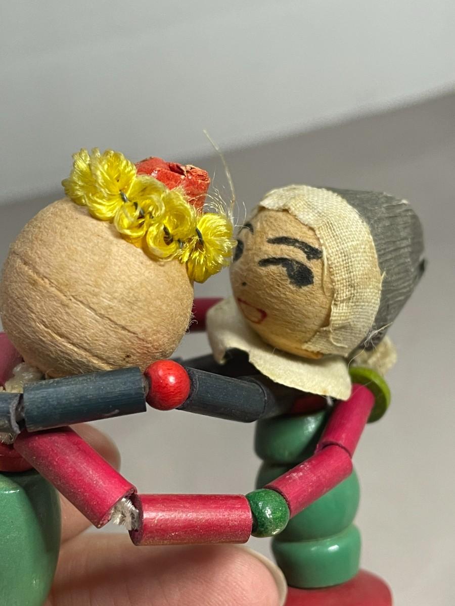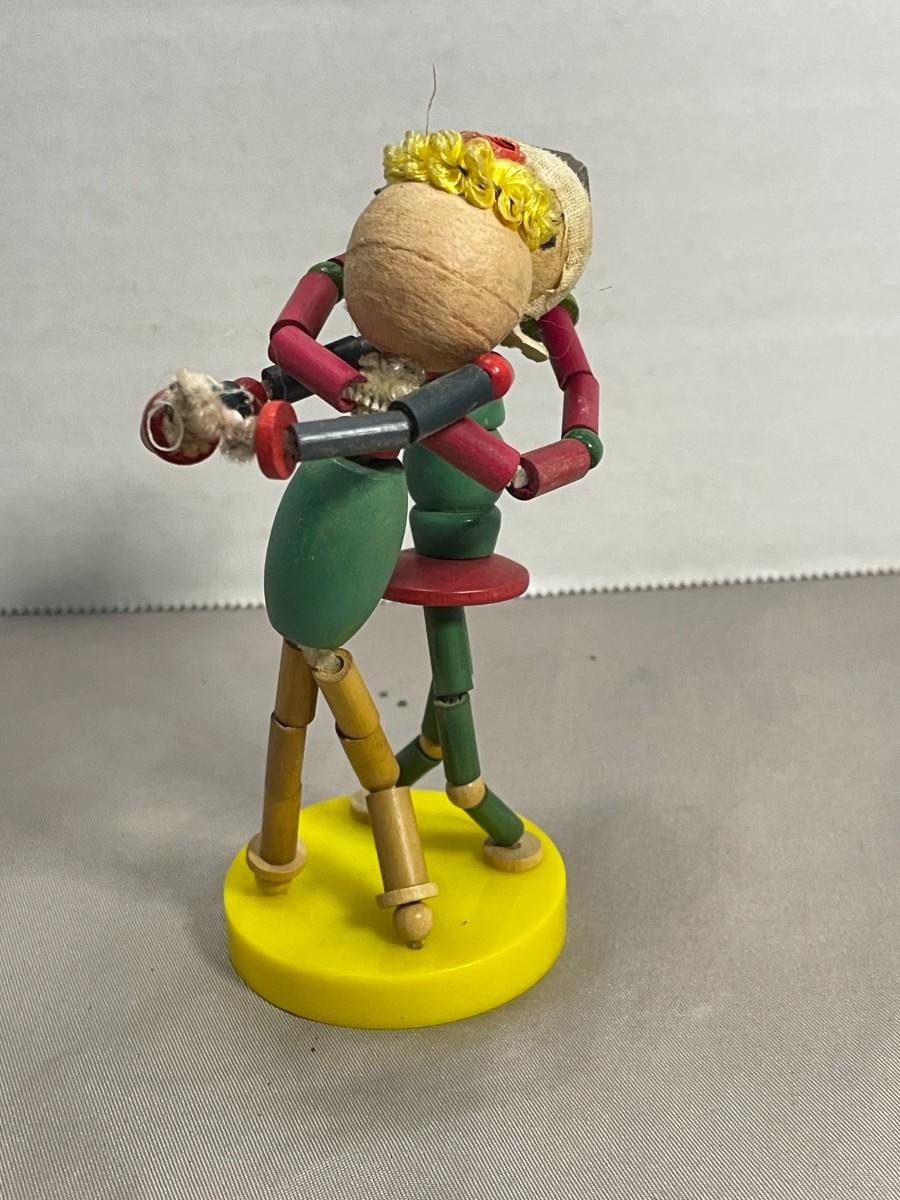 This piece of folk art is about 4 inches tall and made of wood beads on pipe cleaners.