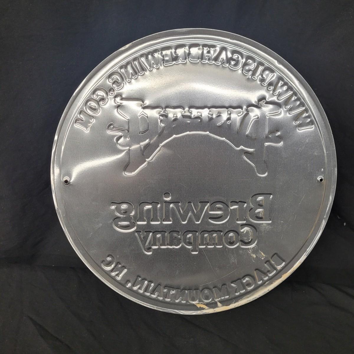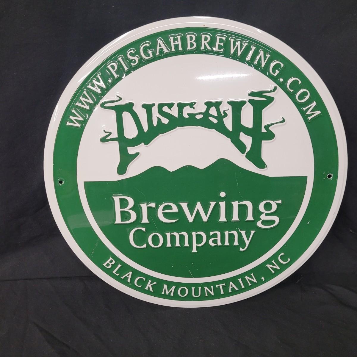 Pisgah Brewing circular metal sign. Normal wear and tear (see pictures). Measures approximately 16"DIA. Shipping available.