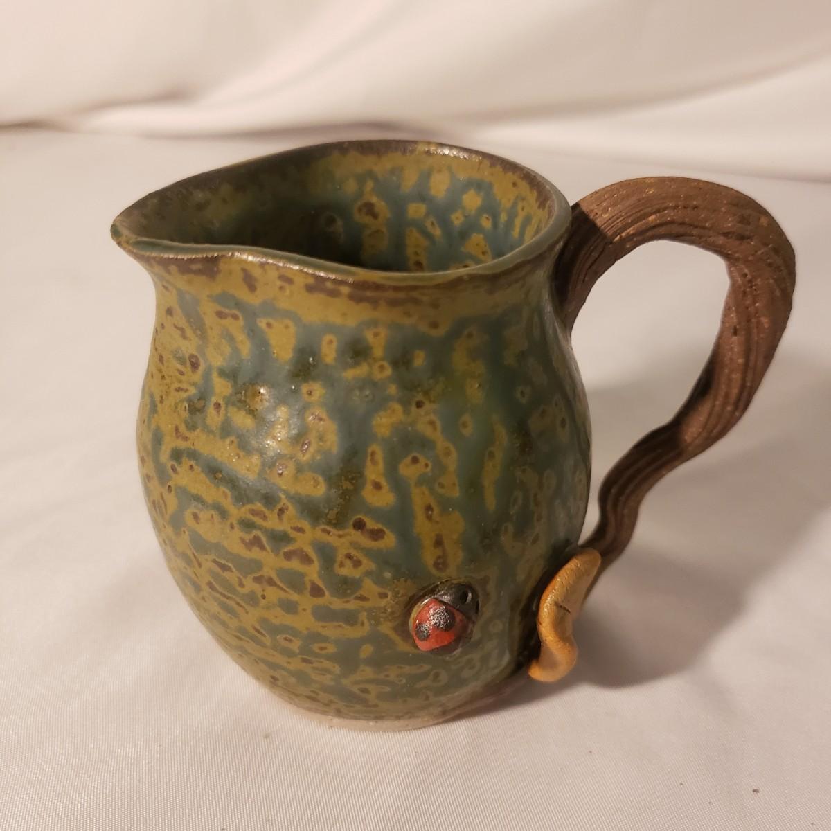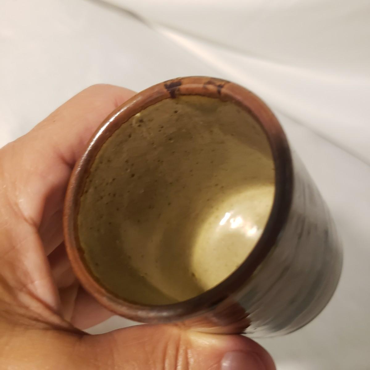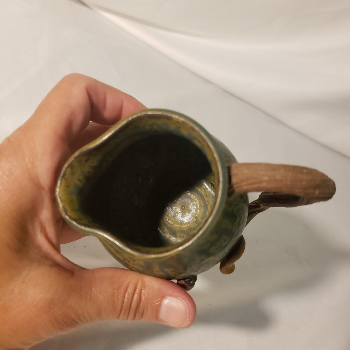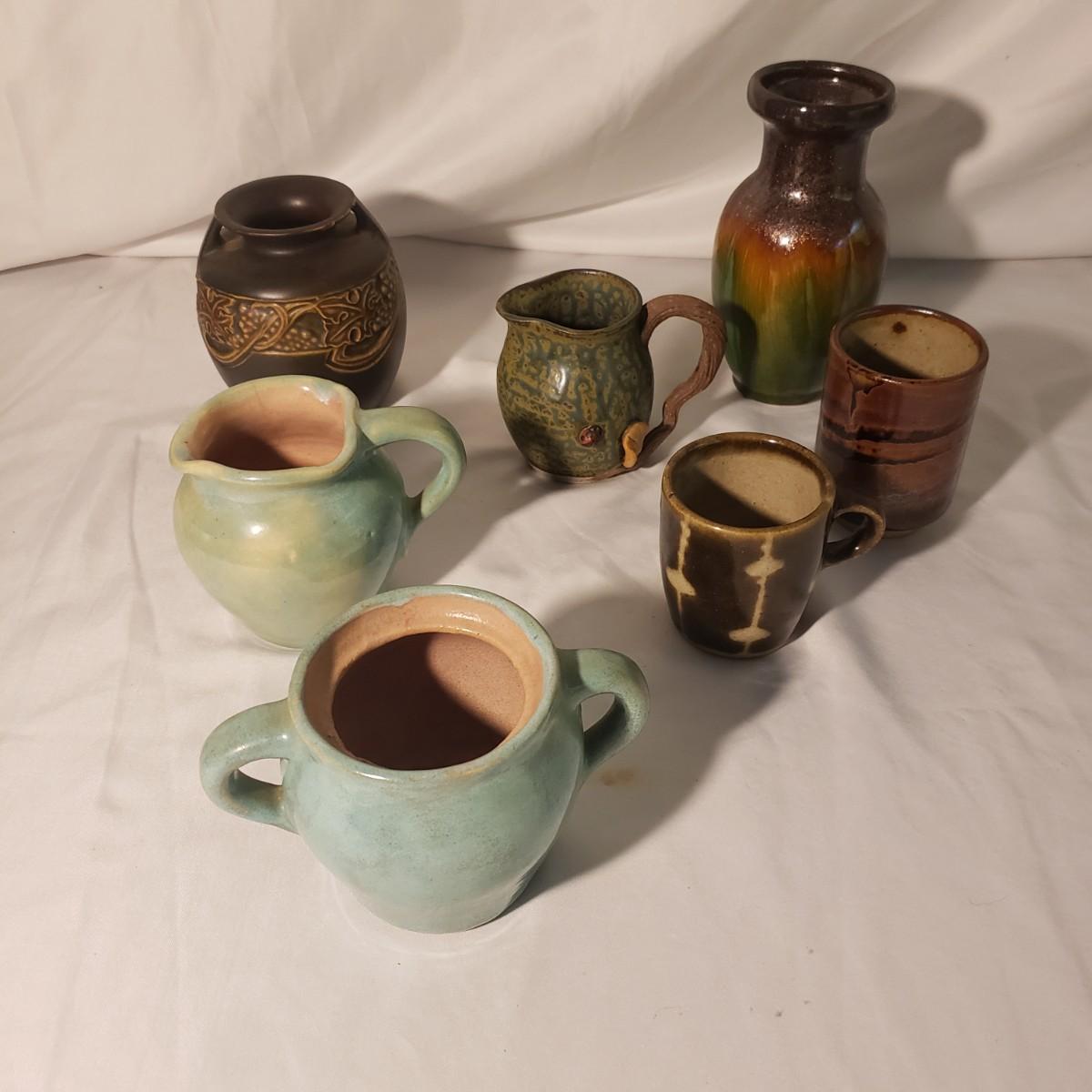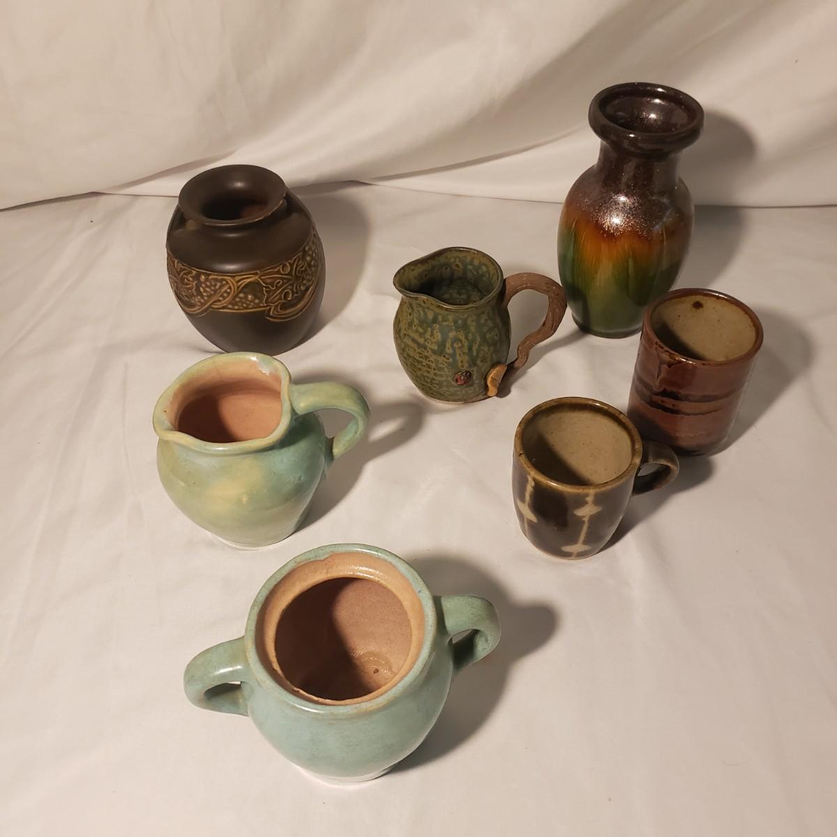 2 pieces of Pisgah Pottery-a pitcher ( 4"x4"x4") and a bowl measuring 5"x3"x3". Both appear to be in good condition. The small brown mug with hourglass like glaze in the negative measures 3"x2"x3". The small cup colored in browns and black measures 2"x3". The sweet picture with a branch like handle and a tiny ladybug measures 4"x4"x3". The urn with what looks like Celtic designs around the middle measures 4"x4" and has a few chips on the top rim as seen in the pictures. The vase with browns, reds and greens glaze measures 2.5"x3"x6".