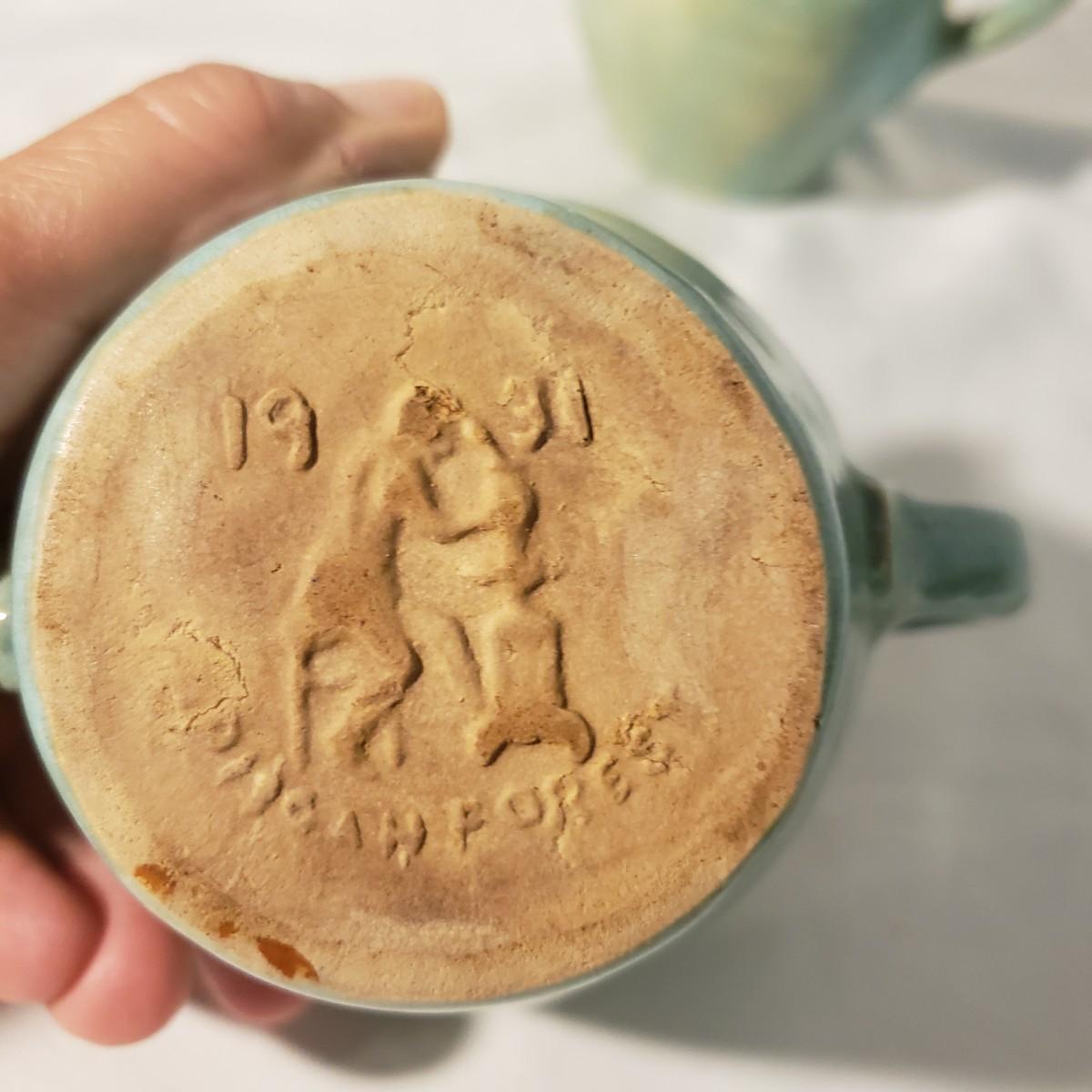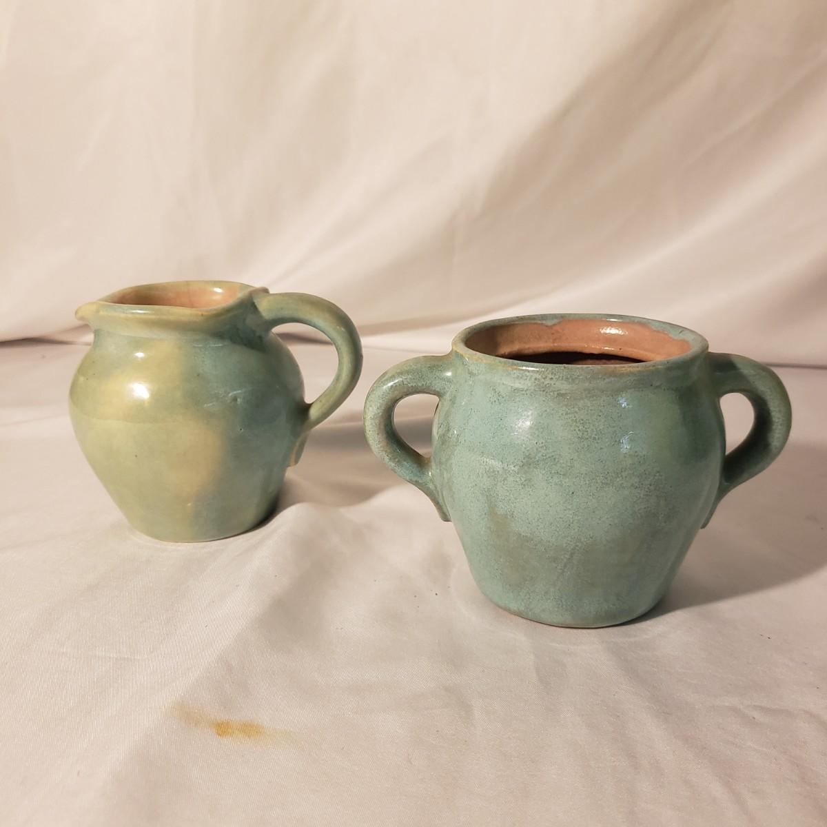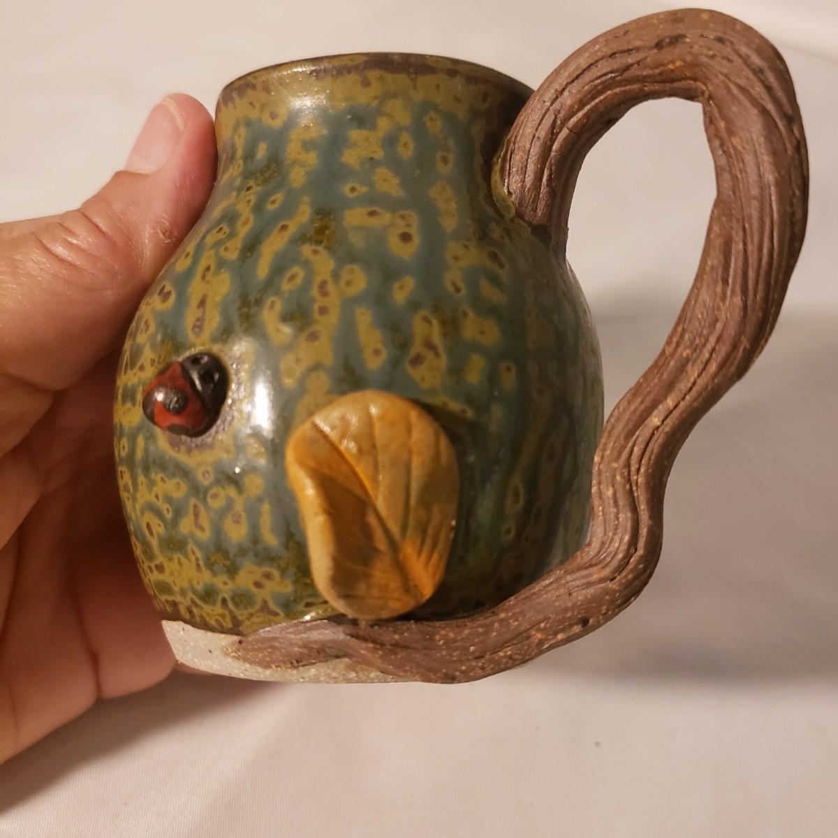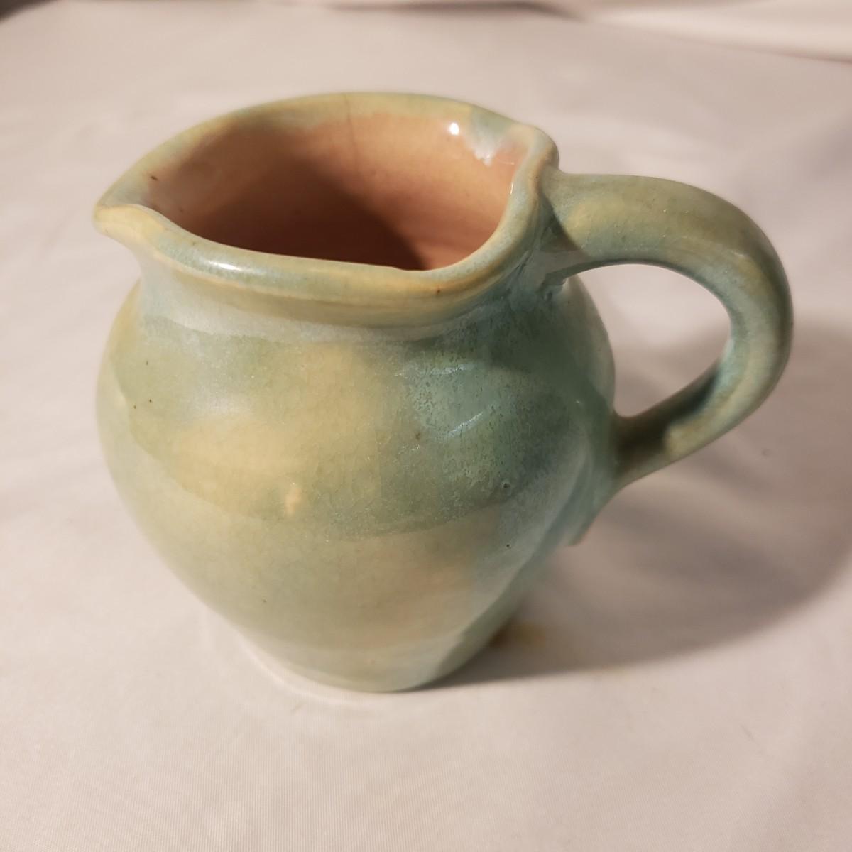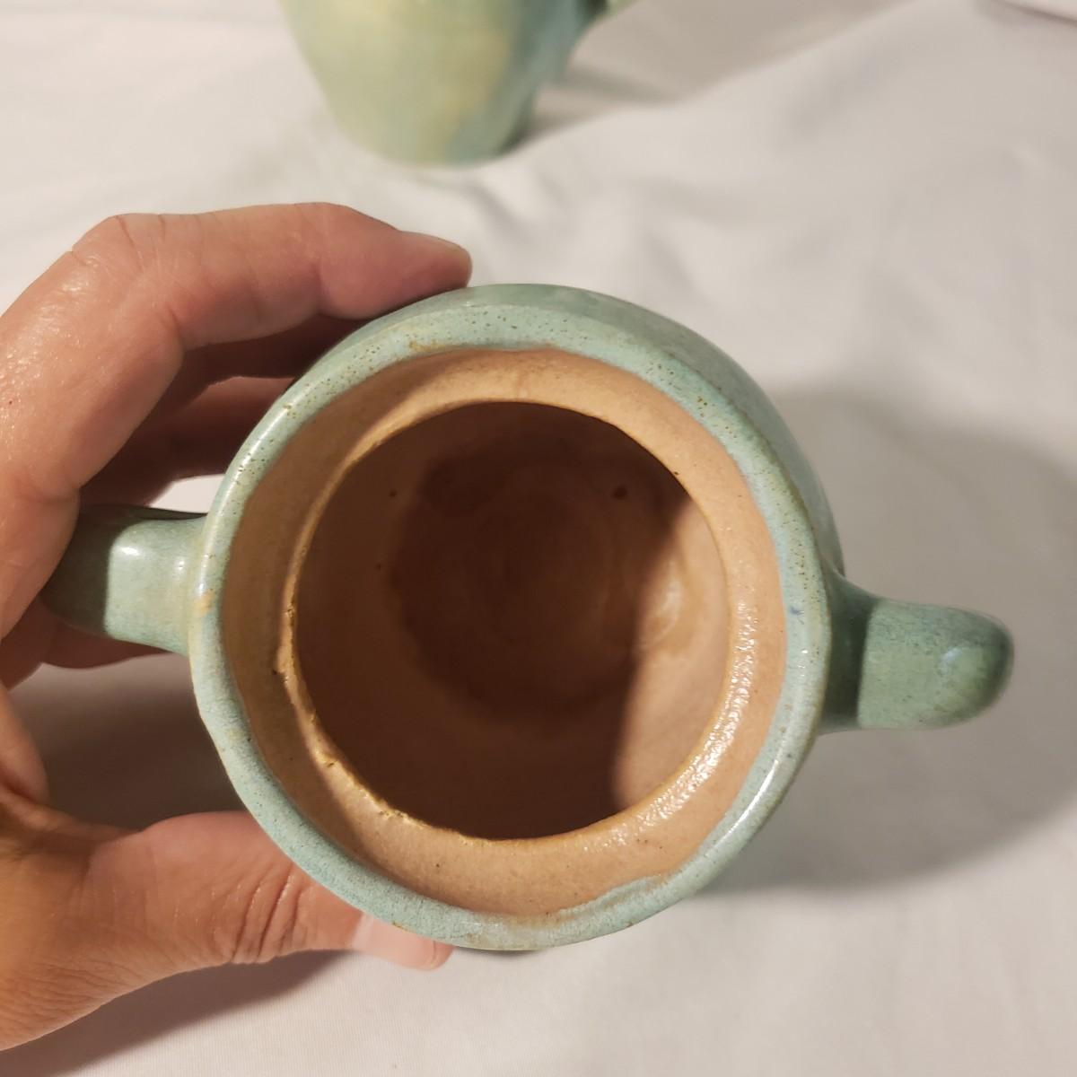 2 pieces of Pisgah Pottery-a pitcher ( 4"x4"x4") and a bowl measuring 5"x3"x3". Both appear to be in good condition. The small brown mug with hourglass like glaze in the negative measures 3"x2"x3". The small cup colored in browns and black measures 2"x3". The sweet picture with a branch like handle and a tiny ladybug measures 4"x4"x3". The urn with what looks like Celtic designs around the middle measures 4"x4" and has a few chips on the top rim as seen in the pictures. The vase with browns, reds and greens glaze measures 2.5"x3"x6".