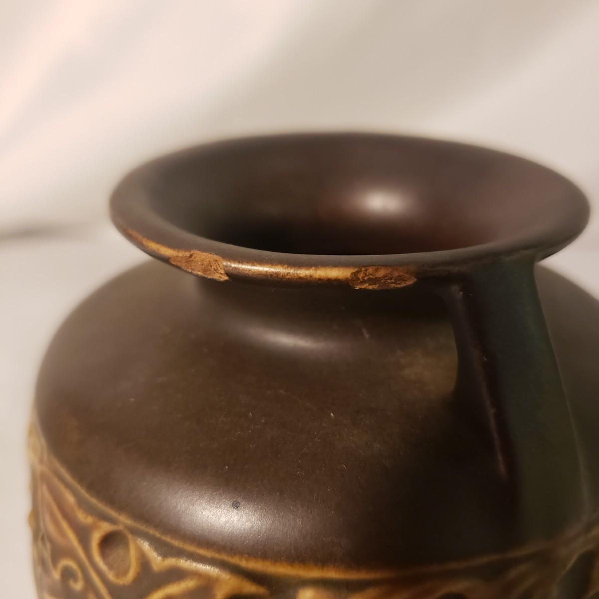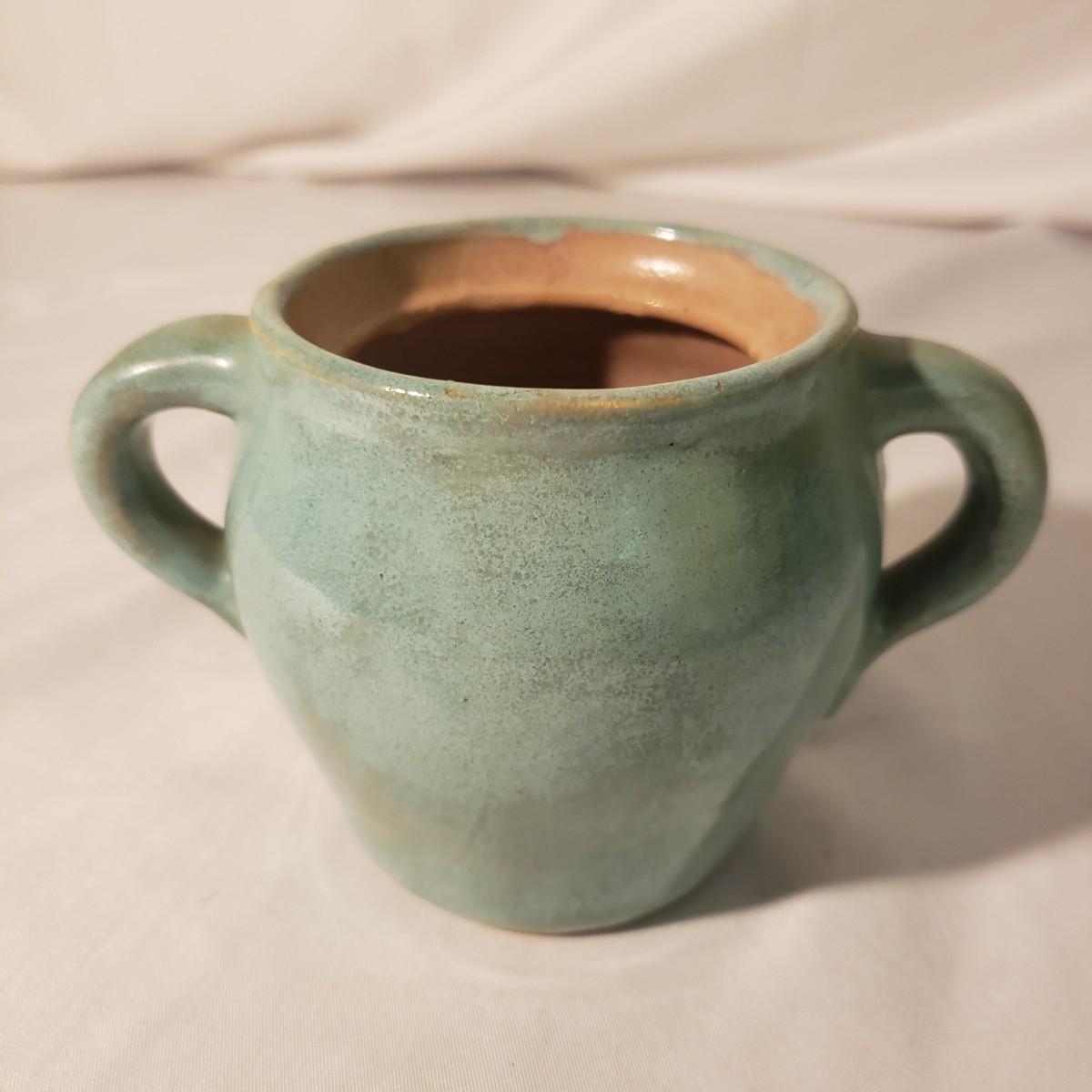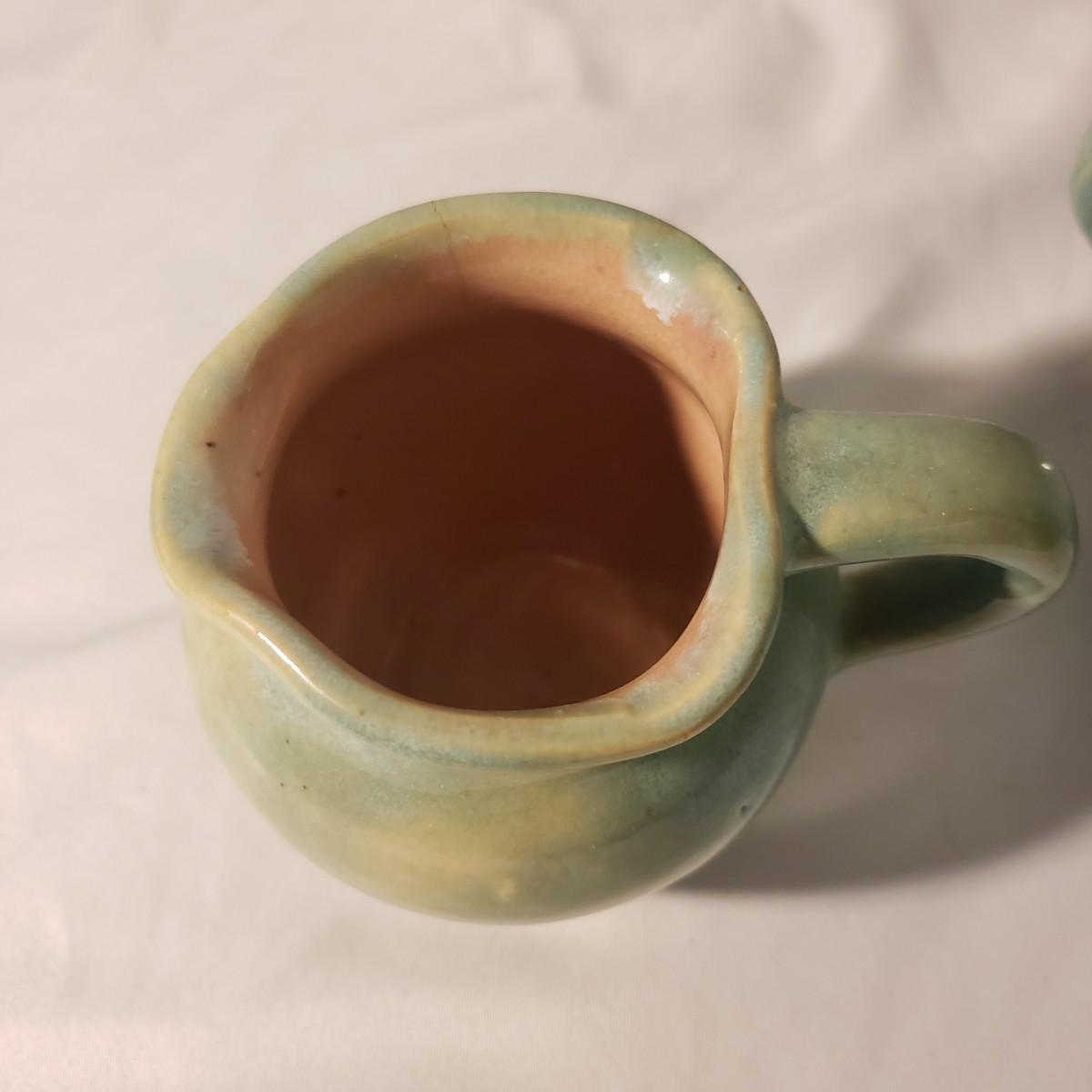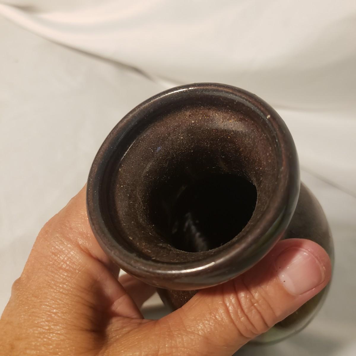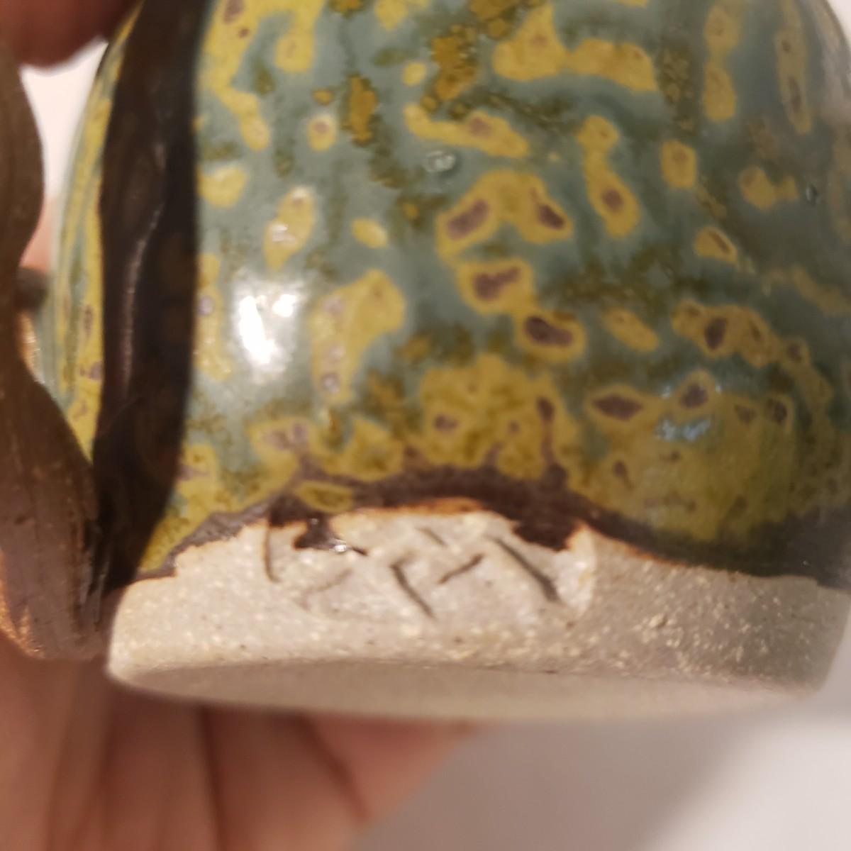 2 pieces of Pisgah Pottery-a pitcher ( 4"x4"x4") and a bowl measuring 5"x3"x3". Both appear to be in good condition. The small brown mug with hourglass like glaze in the negative measures 3"x2"x3". The small cup colored in browns and black measures 2"x3". The sweet picture with a branch like handle and a tiny ladybug measures 4"x4"x3". The urn with what looks like Celtic designs around the middle measures 4"x4" and has a few chips on the top rim as seen in the pictures. The vase with browns, reds and greens glaze measures 2.5"x3"x6".