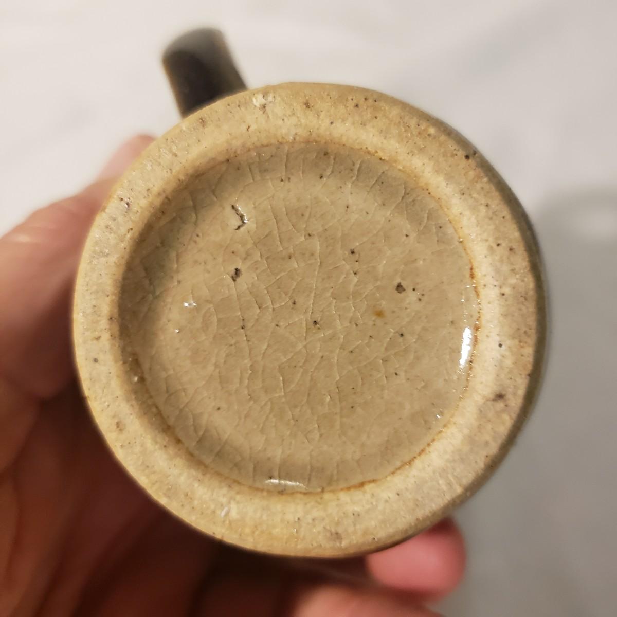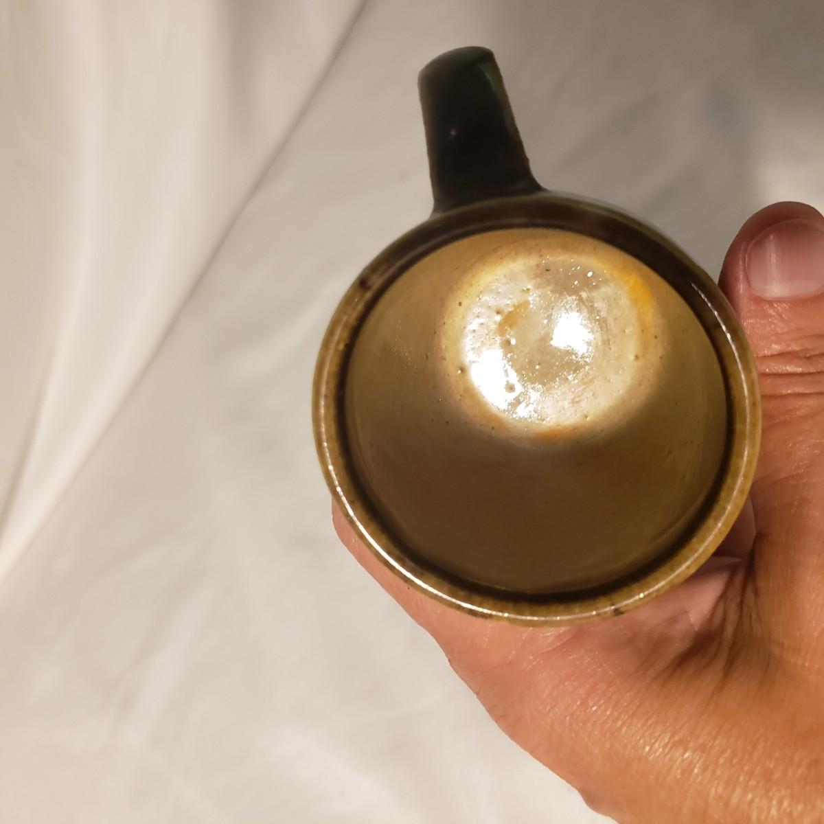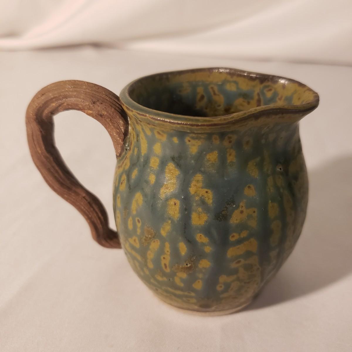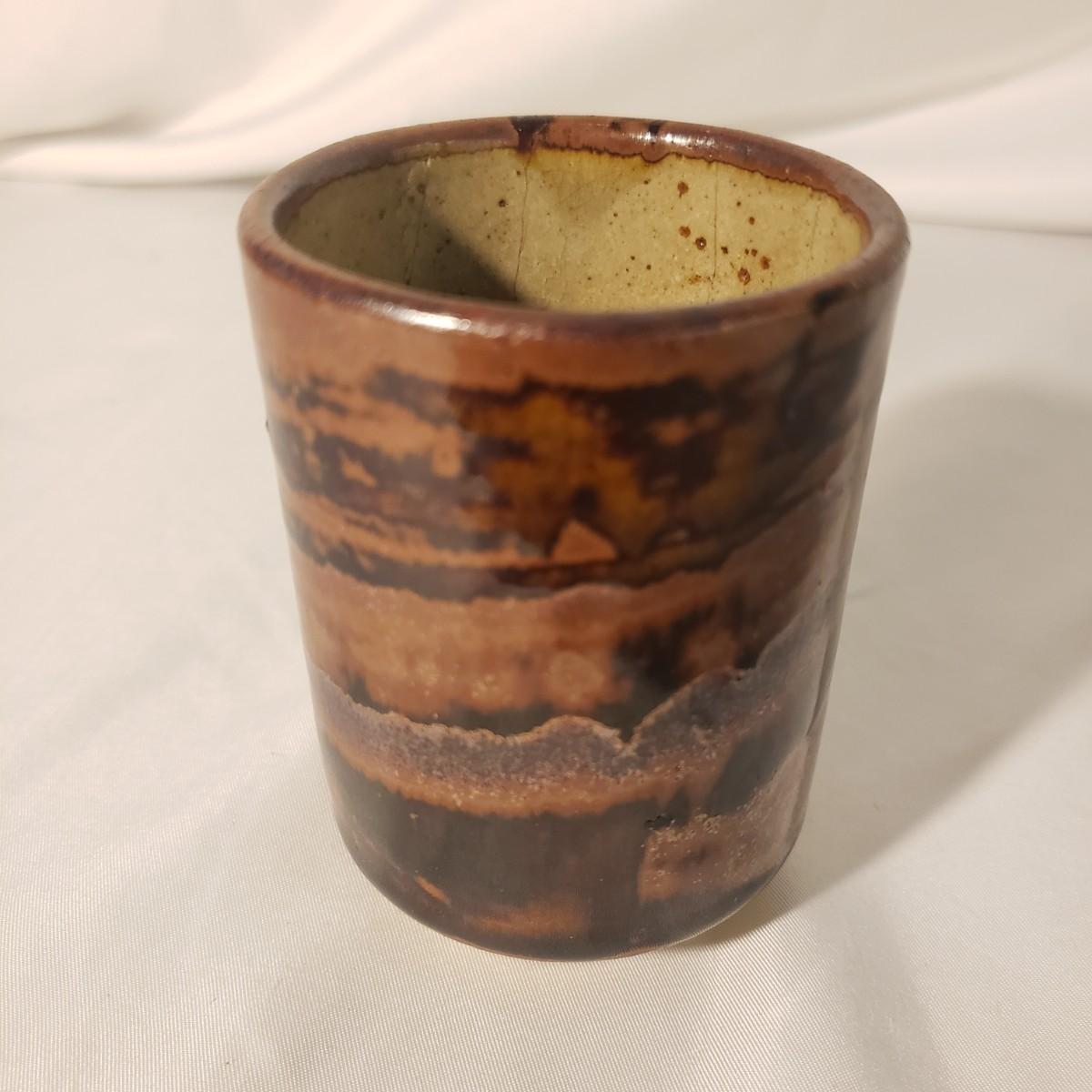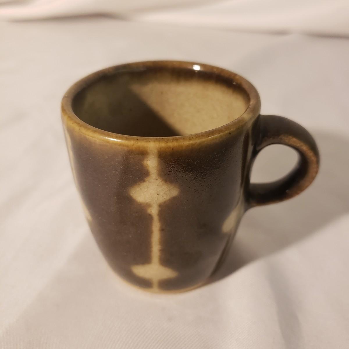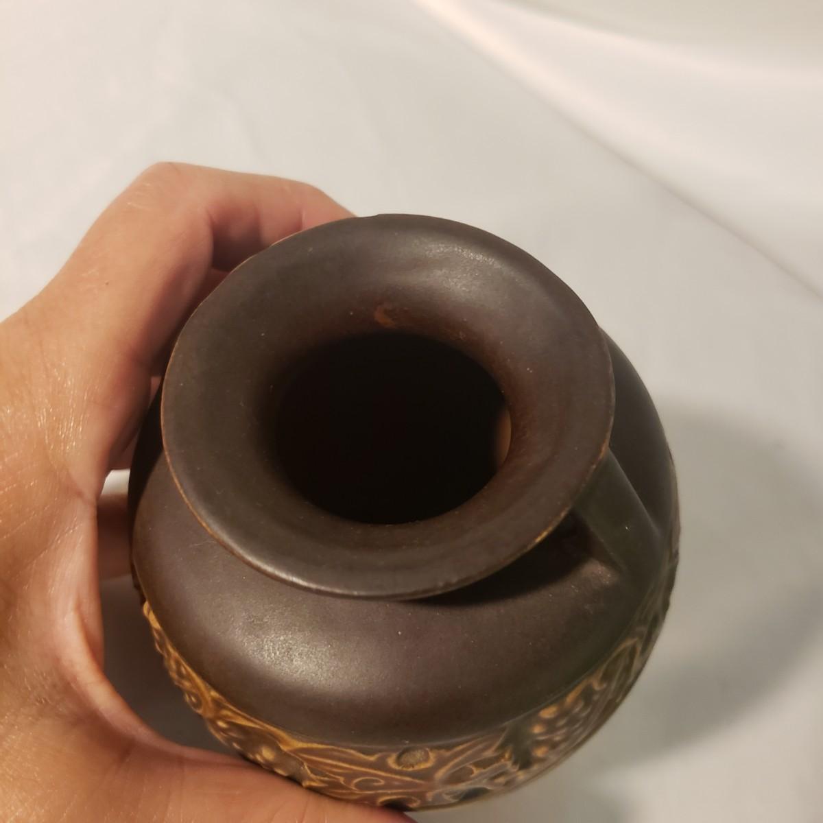 2 pieces of Pisgah Pottery-a pitcher ( 4"x4"x4") and a bowl measuring 5"x3"x3". Both appear to be in good condition. The small brown mug with hourglass like glaze in the negative measures 3"x2"x3". The small cup colored in browns and black measures 2"x3". The sweet picture with a branch like handle and a tiny ladybug measures 4"x4"x3". The urn with what looks like Celtic designs around the middle measures 4"x4" and has a few chips on the top rim as seen in the pictures. The vase with browns, reds and greens glaze measures 2.5"x3"x6".