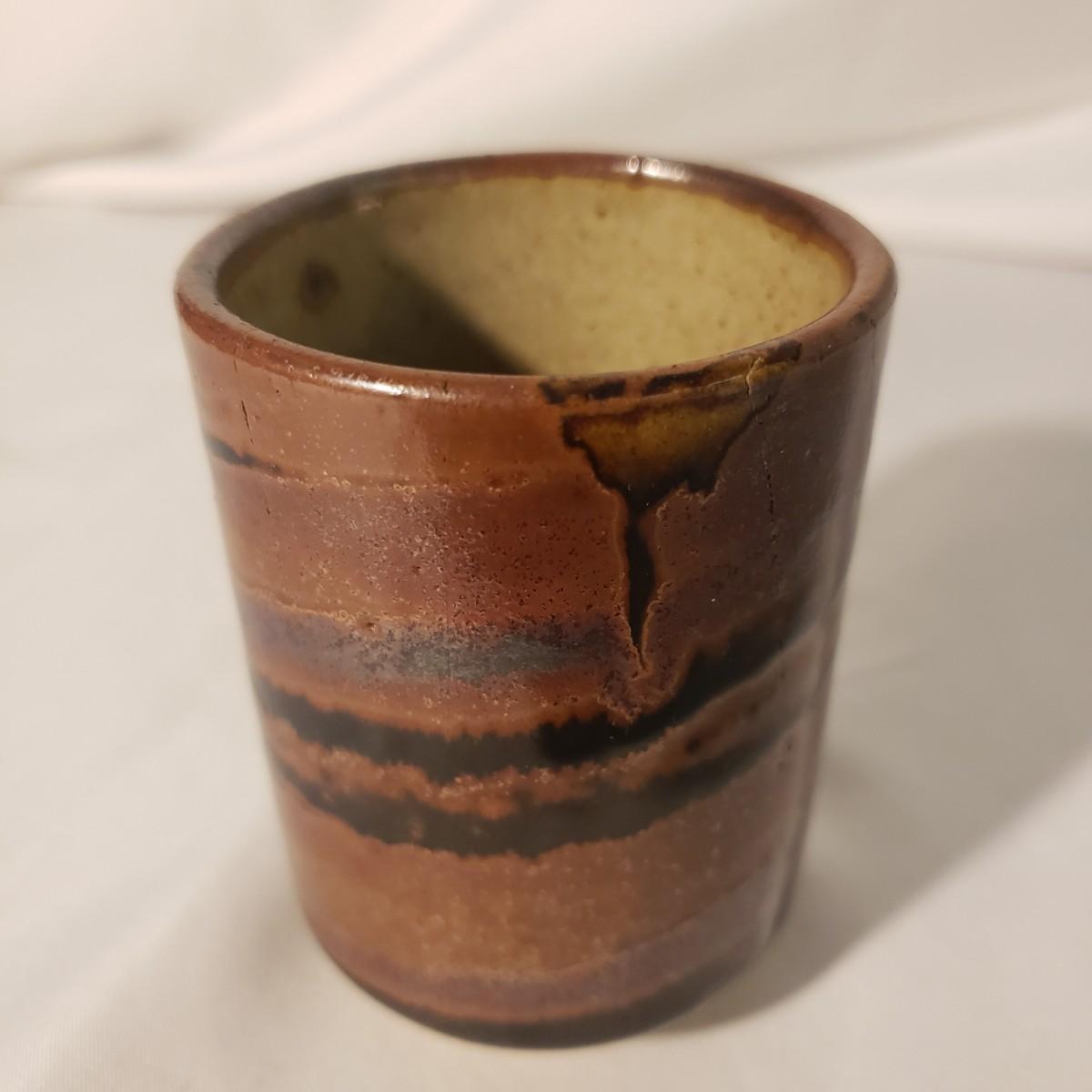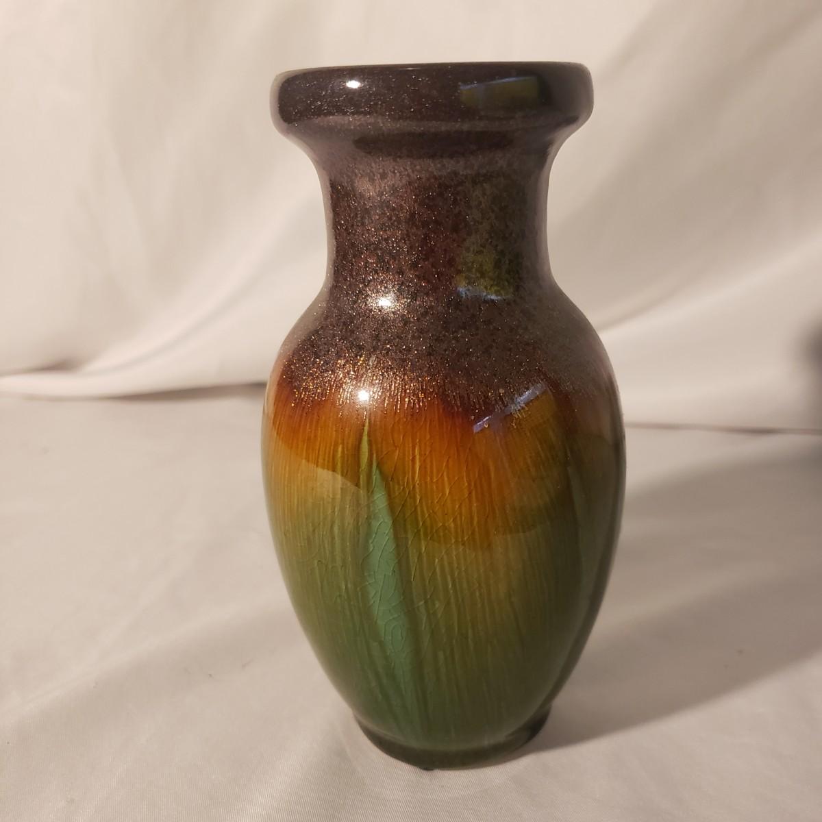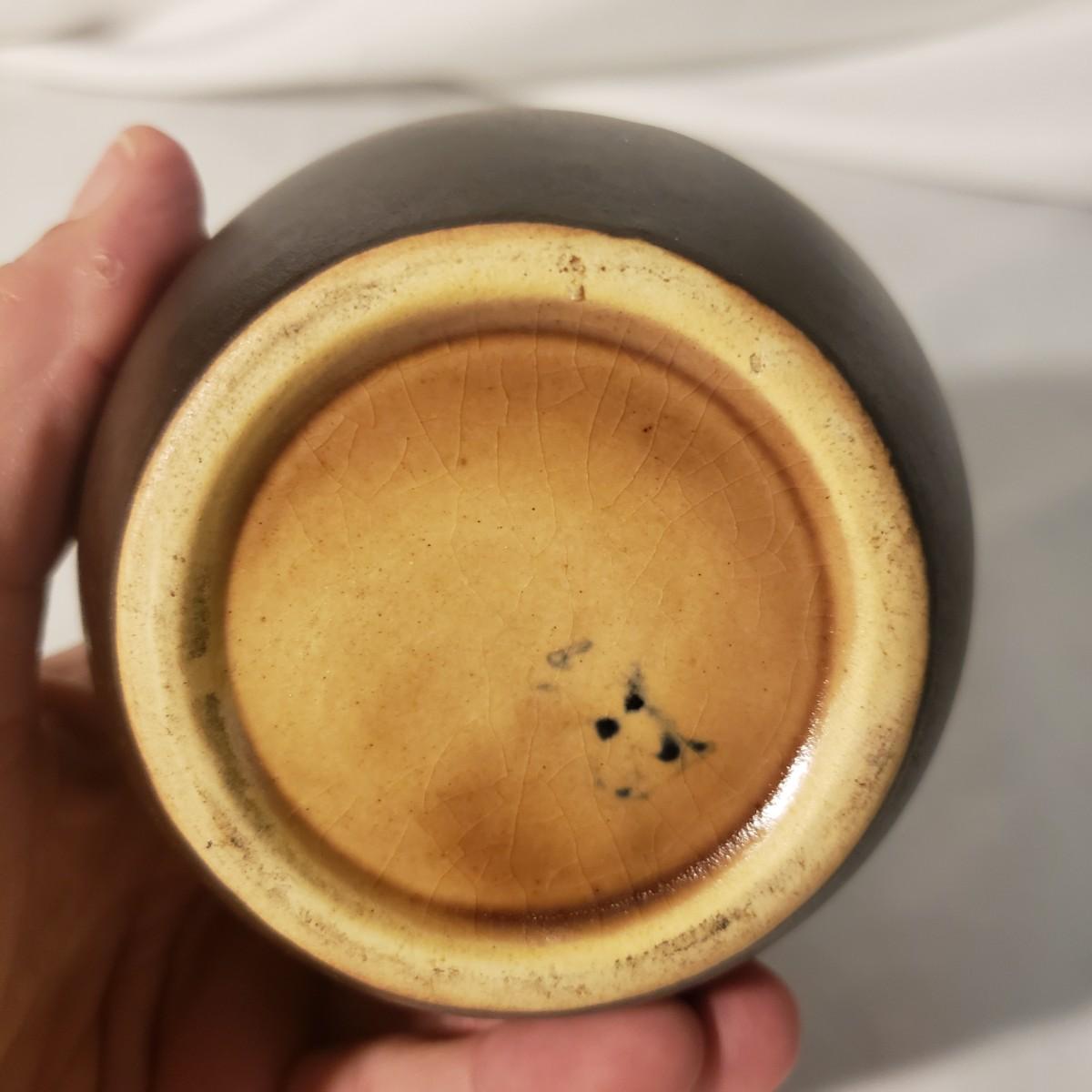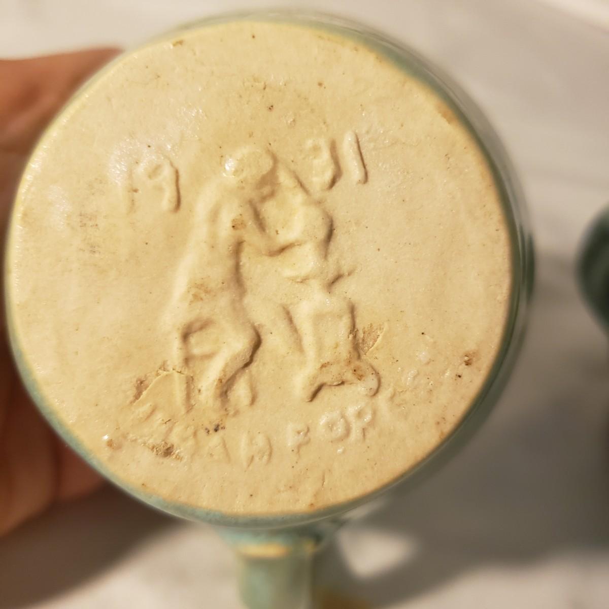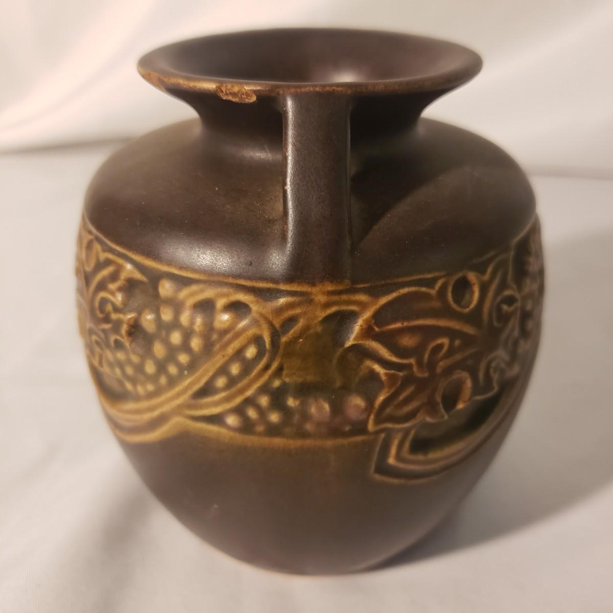 2 pieces of Pisgah Pottery-a pitcher ( 4"x4"x4") and a bowl measuring 5"x3"x3". Both appear to be in good condition. The small brown mug with hourglass like glaze in the negative measures 3"x2"x3". The small cup colored in browns and black measures 2"x3". The sweet picture with a branch like handle and a tiny ladybug measures 4"x4"x3". The urn with what looks like Celtic designs around the middle measures 4"x4" and has a few chips on the top rim as seen in the pictures. The vase with browns, reds and greens glaze measures 2.5"x3"x6".