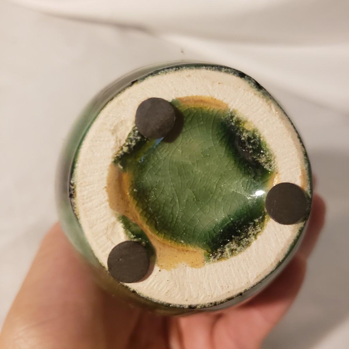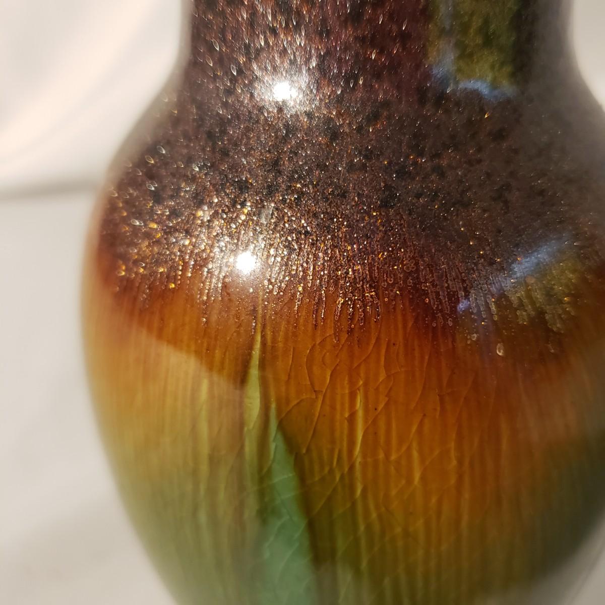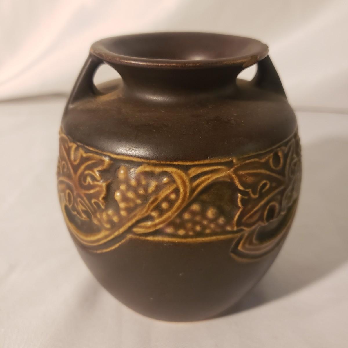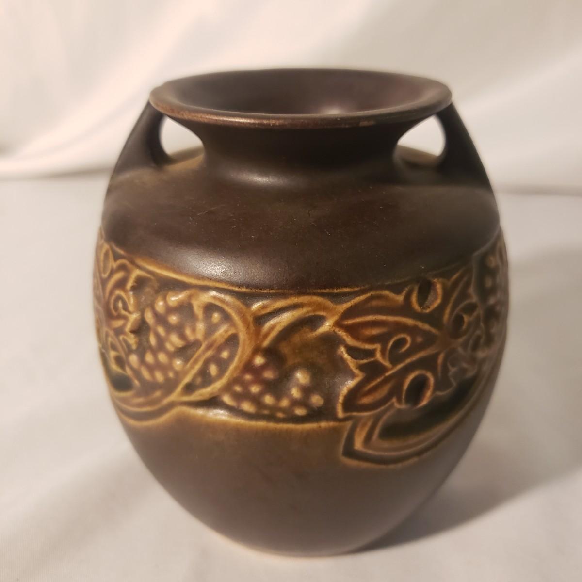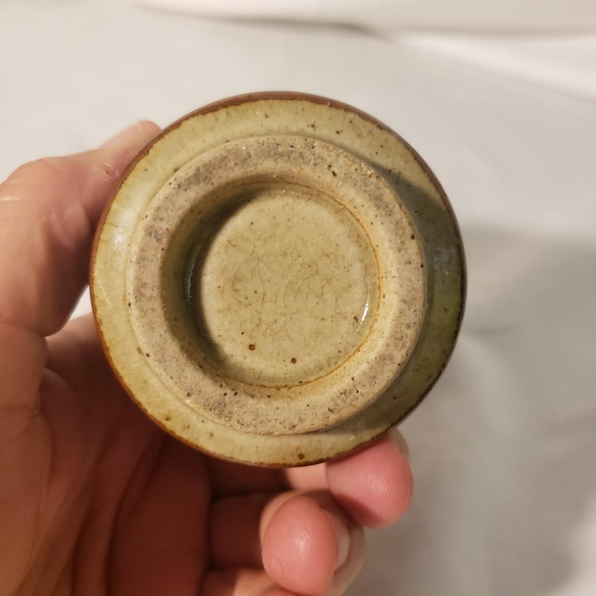 2 pieces of Pisgah Pottery-a pitcher ( 4"x4"x4") and a bowl measuring 5"x3"x3". Both appear to be in good condition. The small brown mug with hourglass like glaze in the negative measures 3"x2"x3". The small cup colored in browns and black measures 2"x3". The sweet picture with a branch like handle and a tiny ladybug measures 4"x4"x3". The urn with what looks like Celtic designs around the middle measures 4"x4" and has a few chips on the top rim as seen in the pictures. The vase with browns, reds and greens glaze measures 2.5"x3"x6".