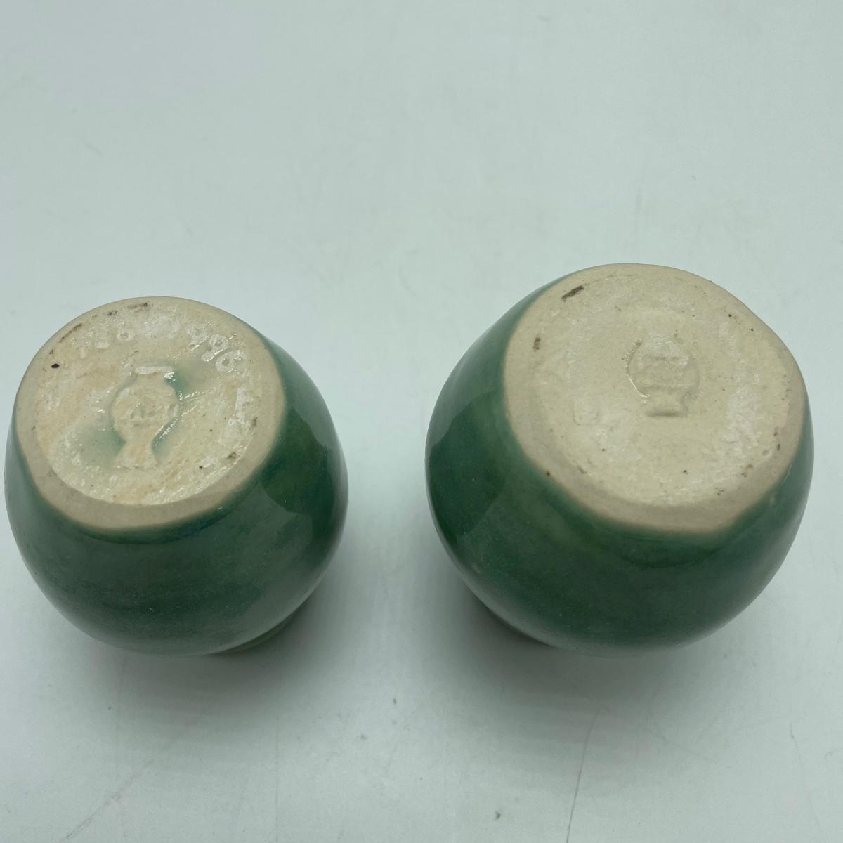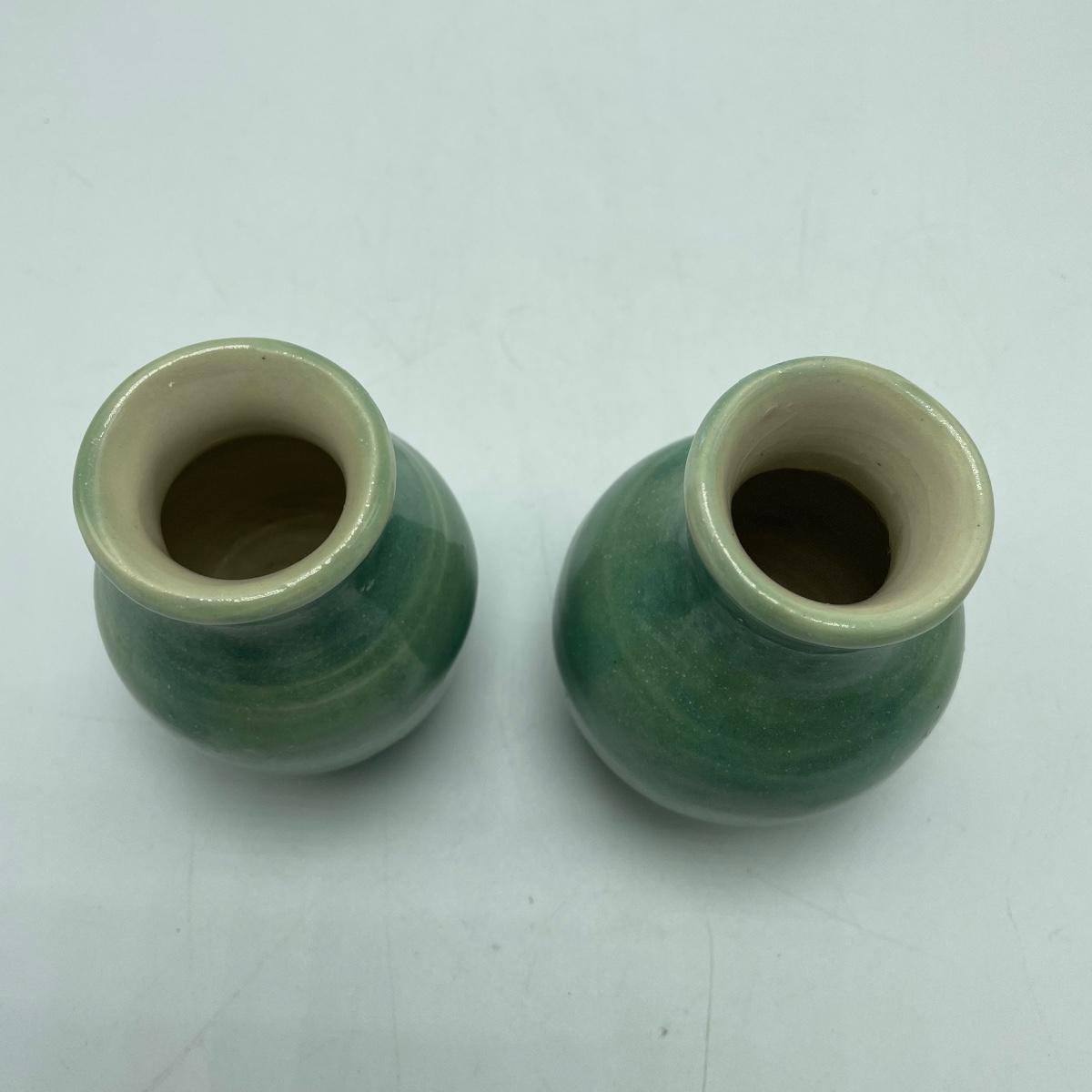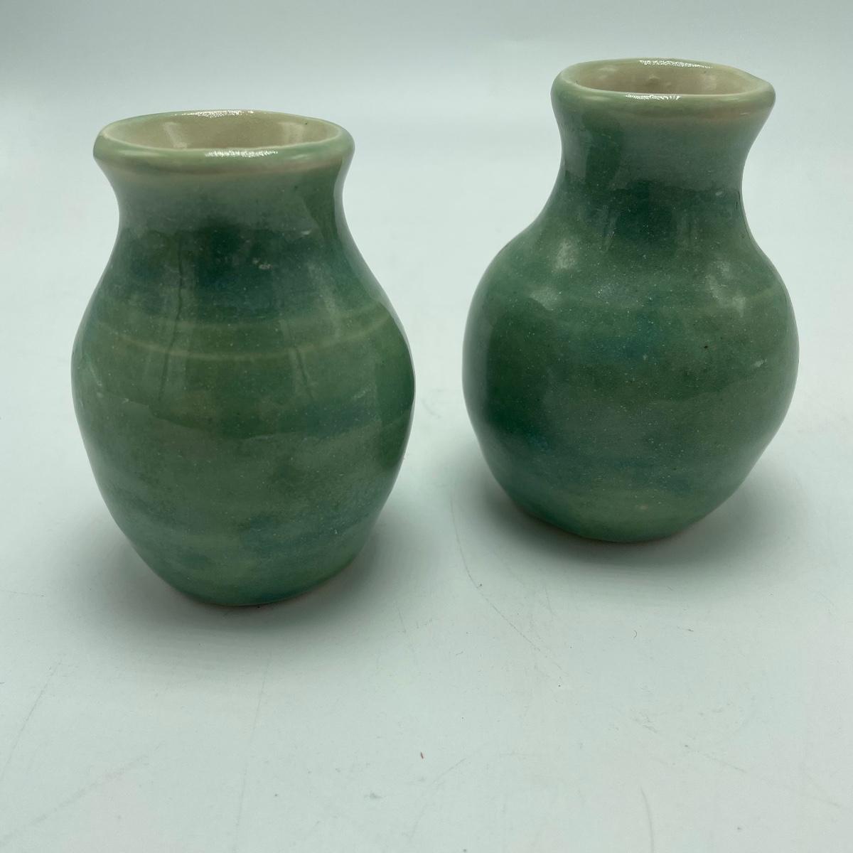 This pair of Pisgah pottery small vases are almost identical with a slight difference in height. Both have the signature Pisgah turquoise glaze.