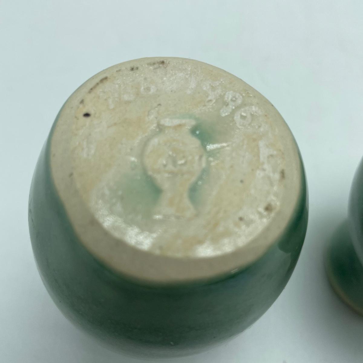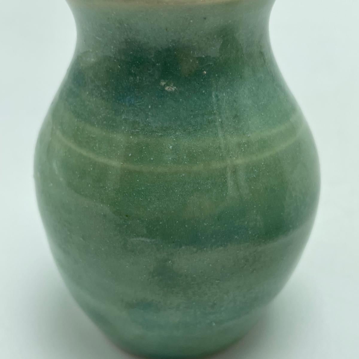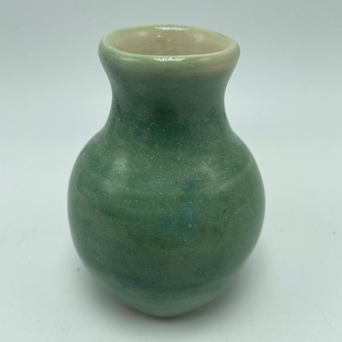 This pair of Pisgah pottery small vases are almost identical with a slight difference in height. Both have the signature Pisgah turquoise glaze.
