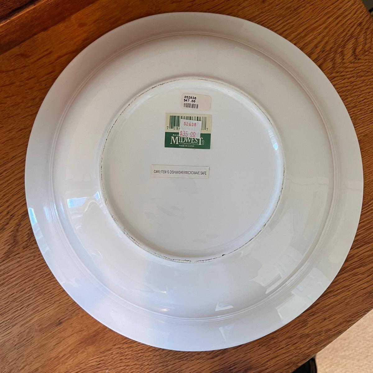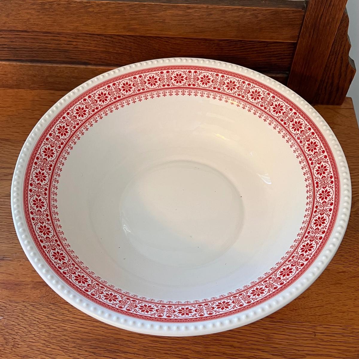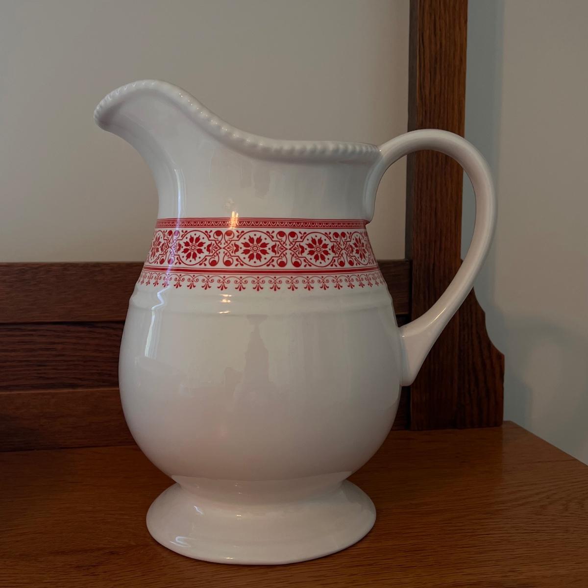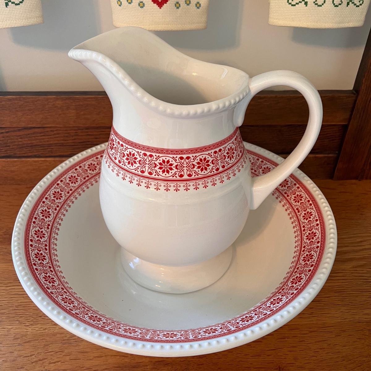 This lot includes one pitcher, one basin, and three hand-stitched towels. The basin and pitcher both appear to be from Midwest of Cannon Falls. The largest item is the basin that measures 14"D x 3.5"H. Shipping available. Shipping can be costly. We suggest contacting our preferred local shipping provider, Postage Express, with dimensions and getting an estimate before bidding: (828) 255-9250 or shipping@postageexpressnc.com.