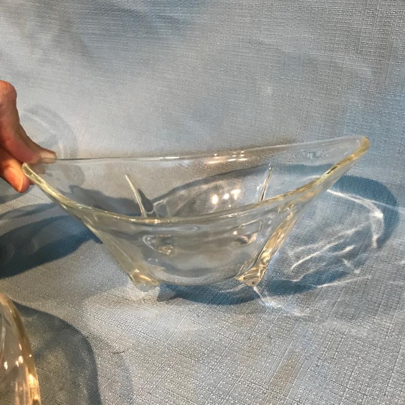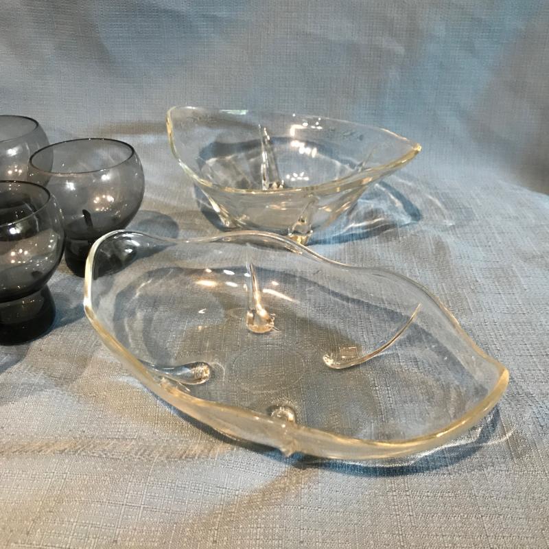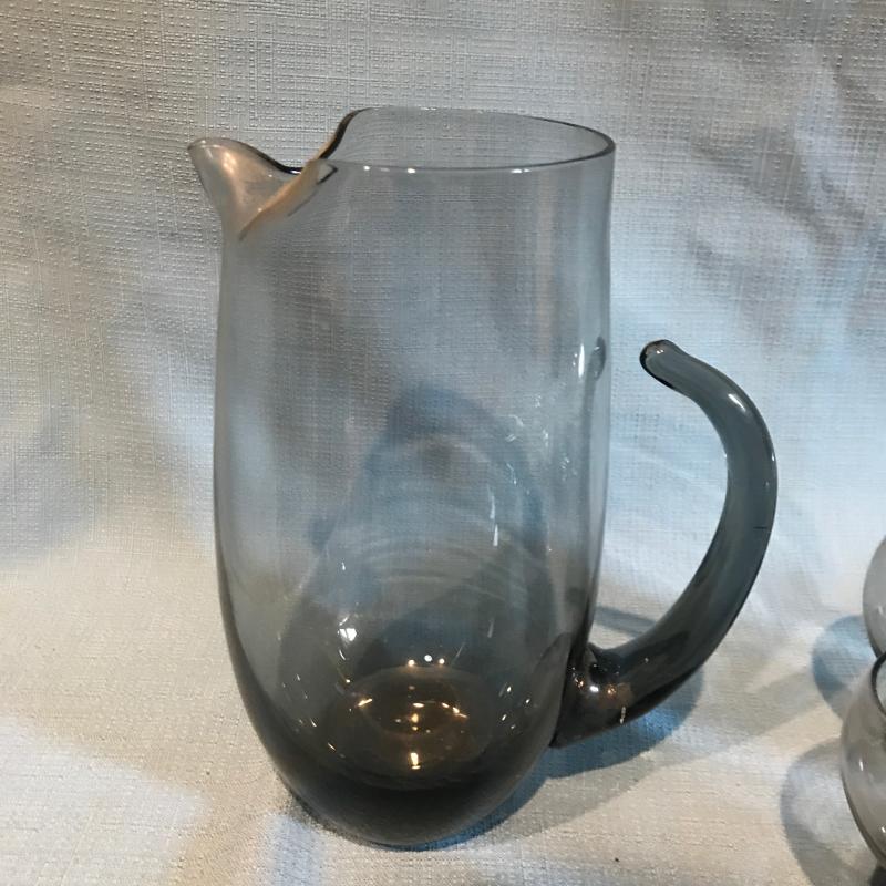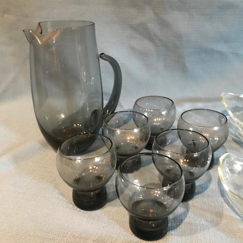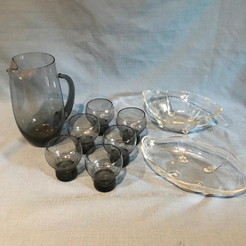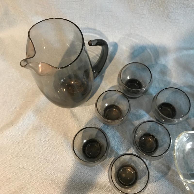 Lot includes glass pitcher with six small matching glasses, and two glass bowls. Pitcher is approx. 8” tall. Local pickup only in Hendersonville, NC.