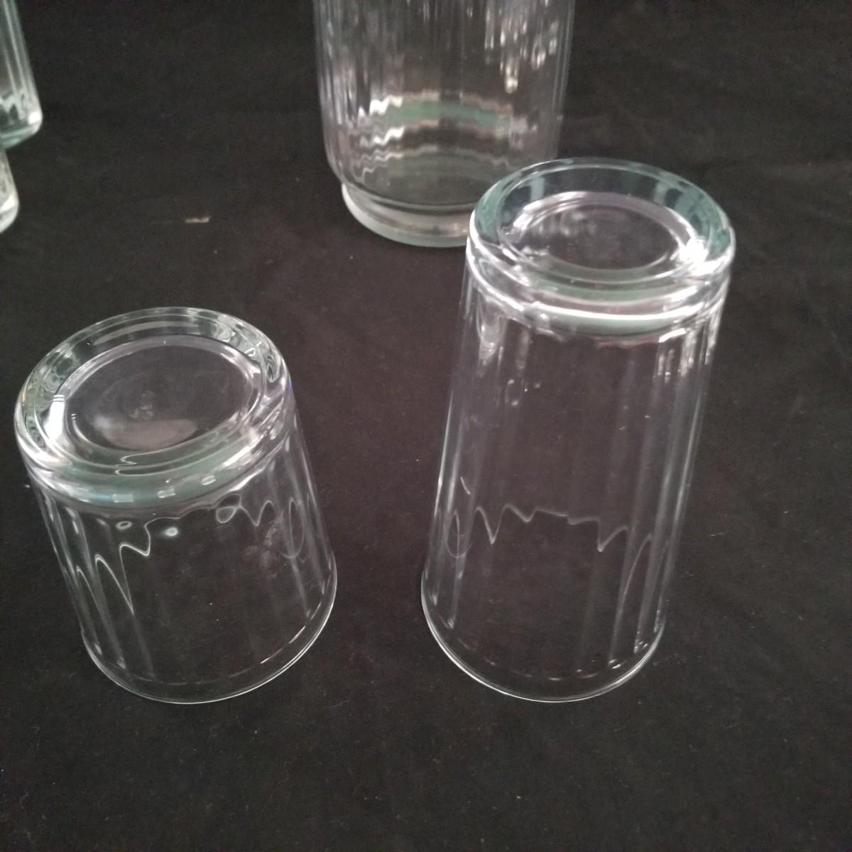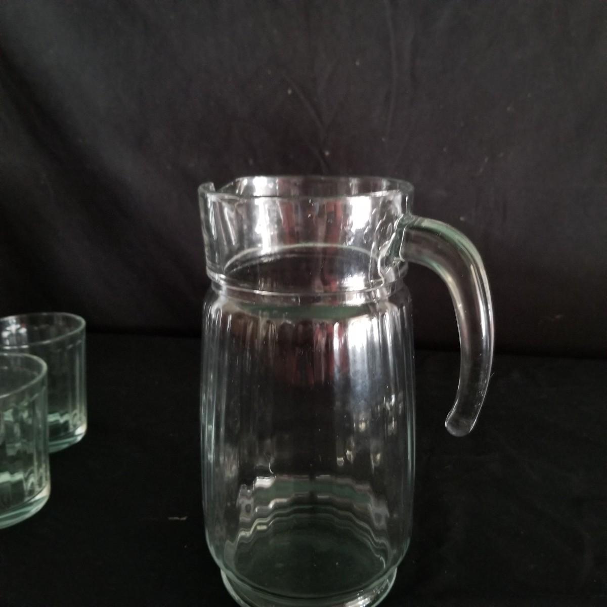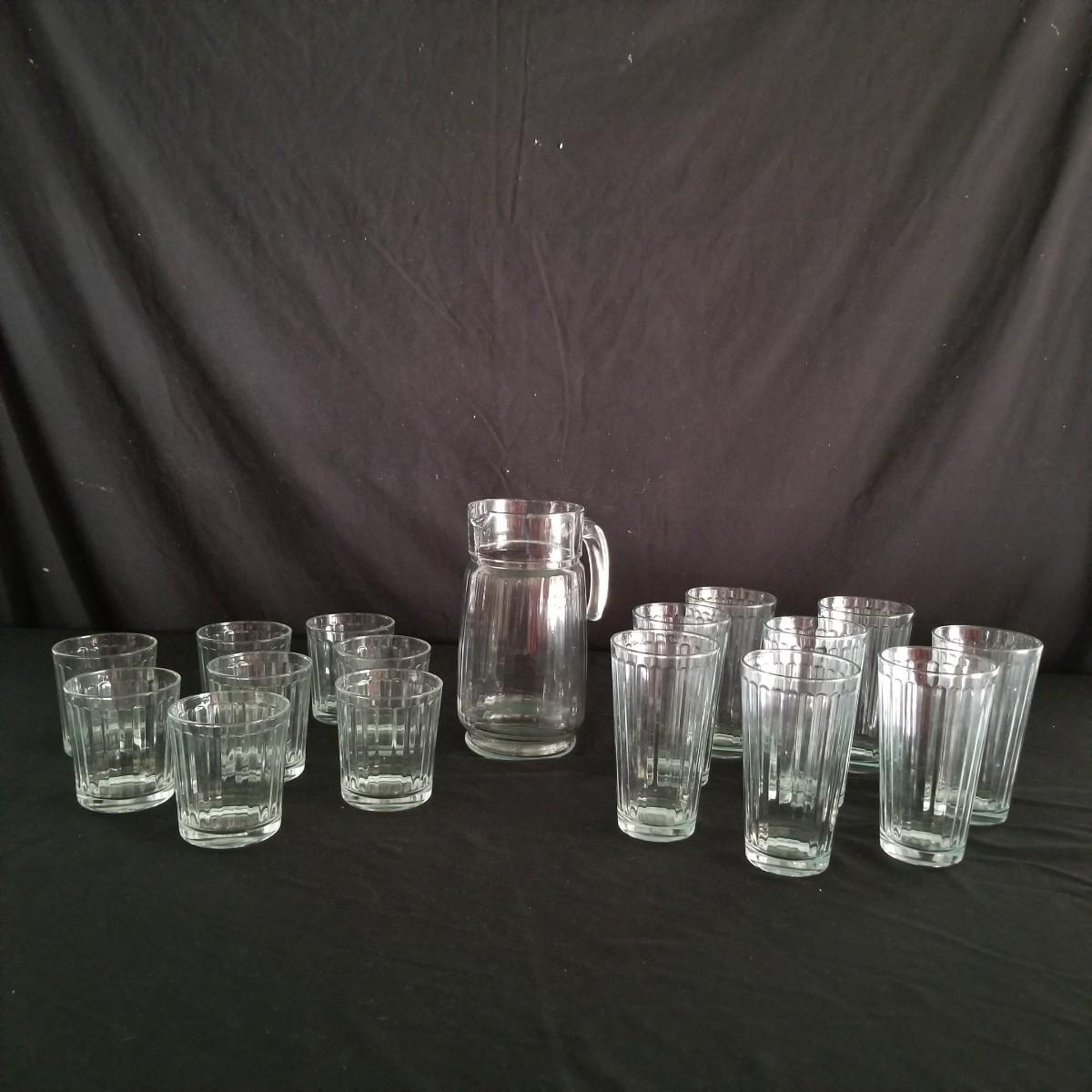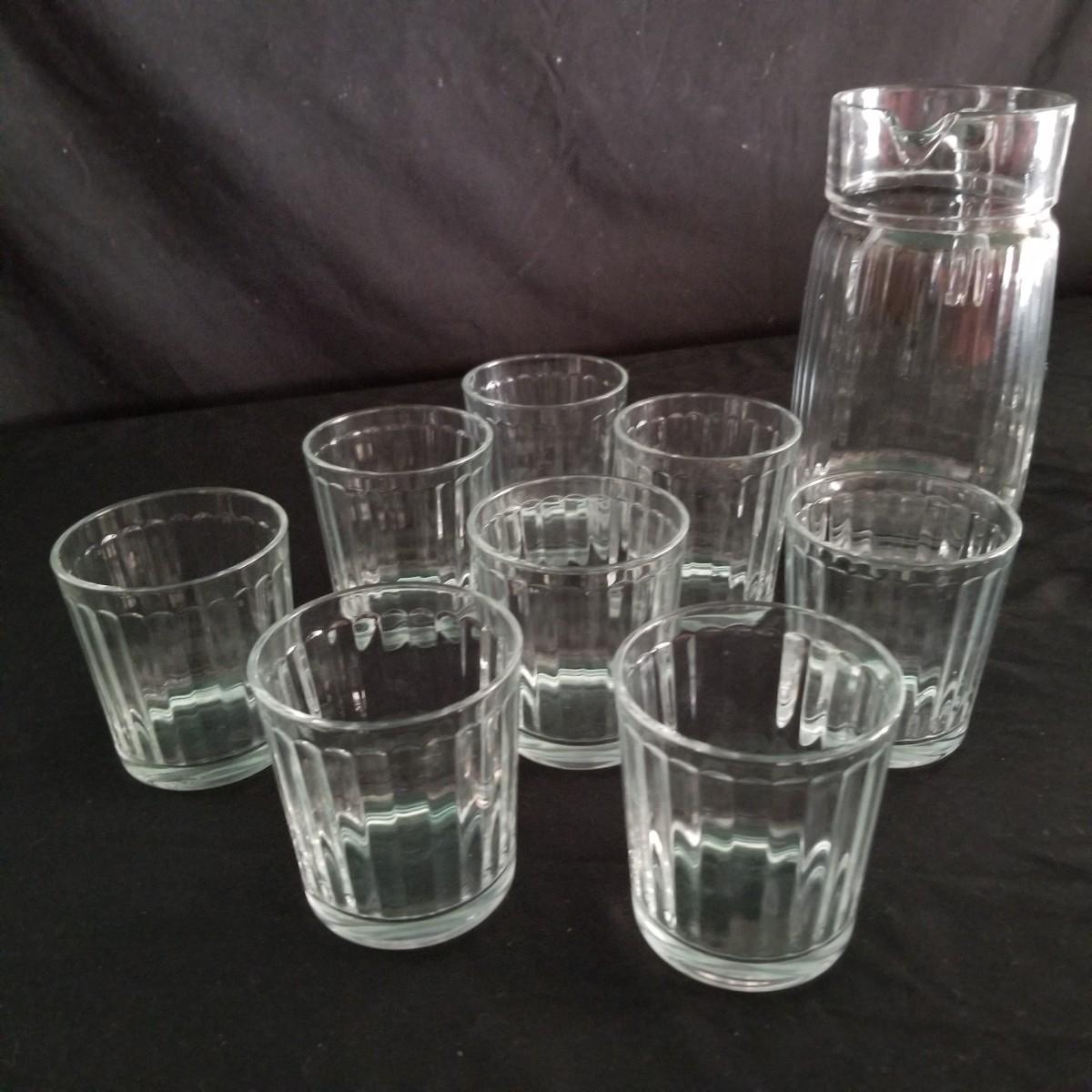 Clear glass handled pitcher and sixteen glasses, eight juice and eight water glasses. No nicks or chips. Pitcher 9 1/4"H. Shipping available.