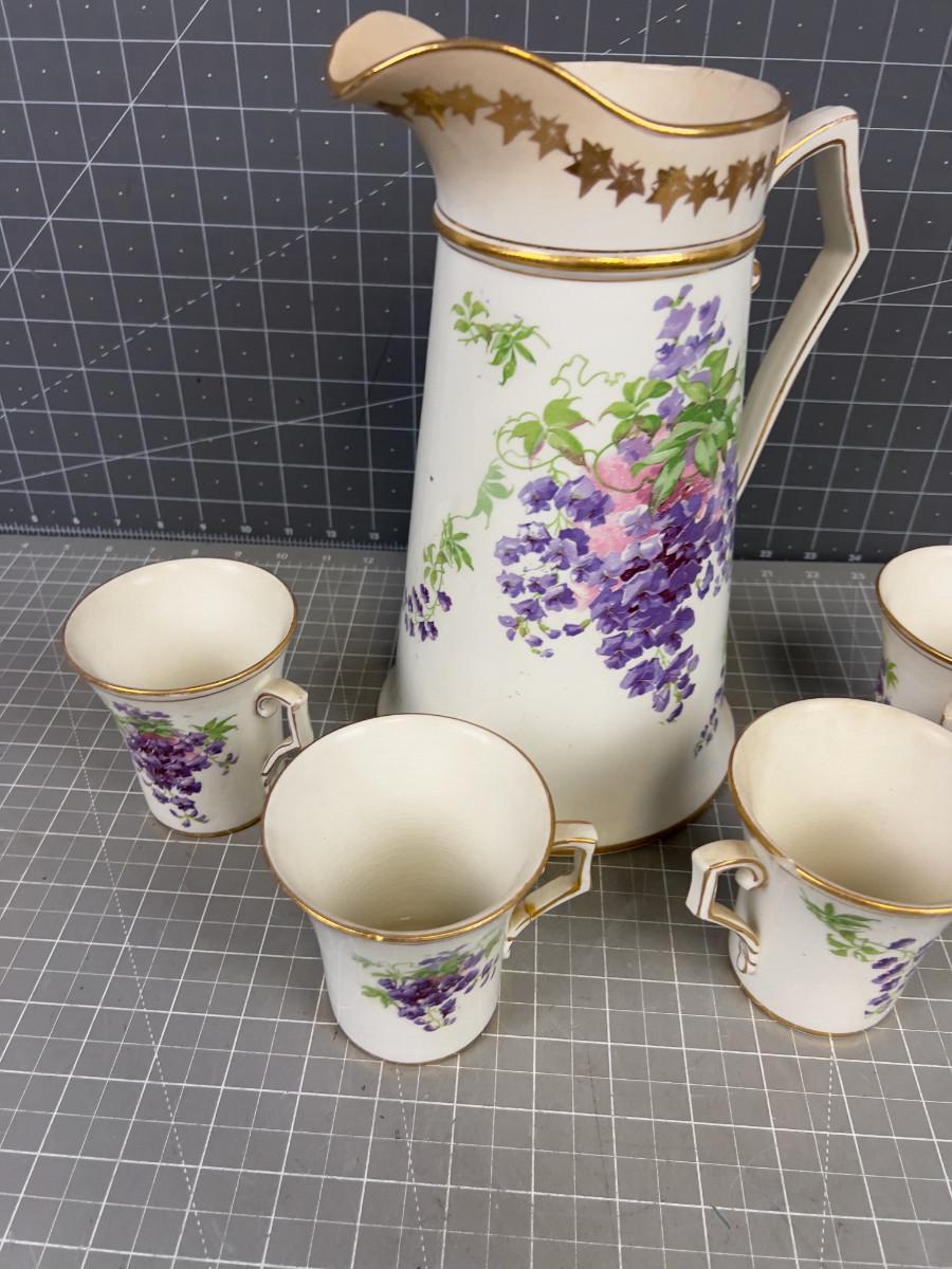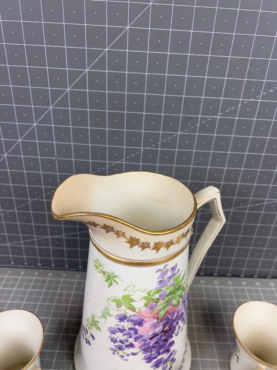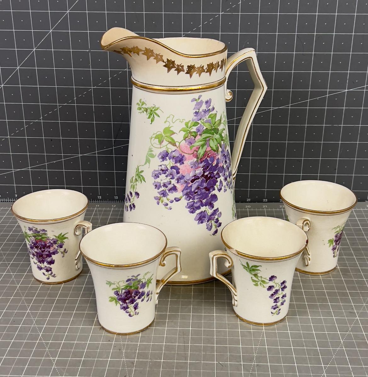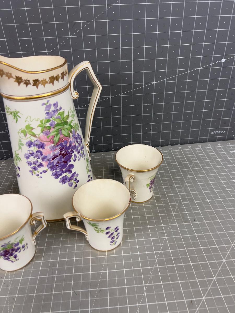 Pitcher with 4 Cups Circa 1920's Purple Flower