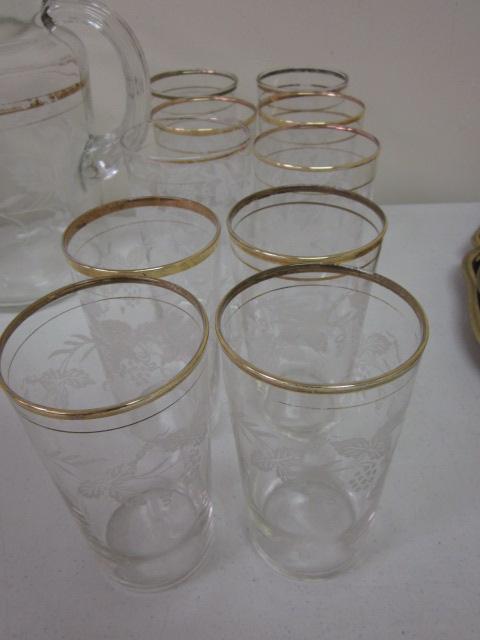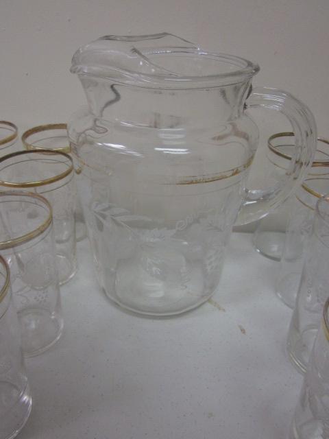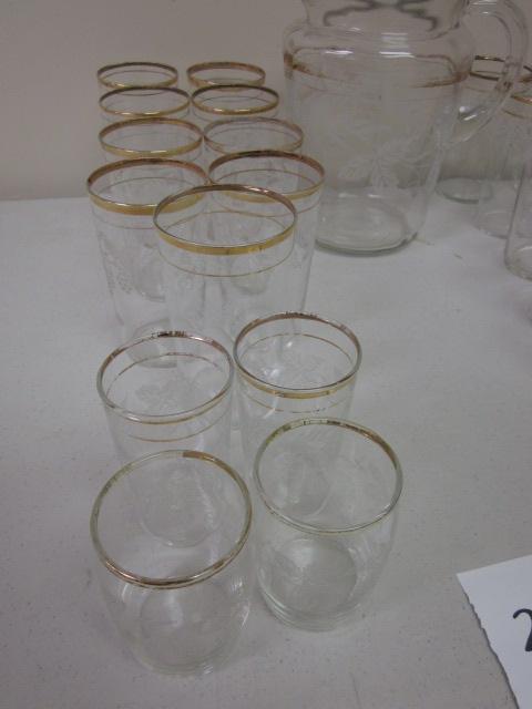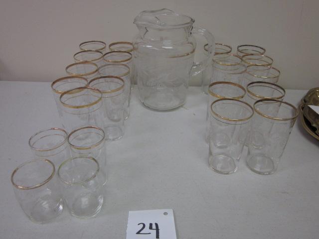 Pitcher With Glasses, Glass Floral Design, Gold Rimmed Glasses, 24 pcs