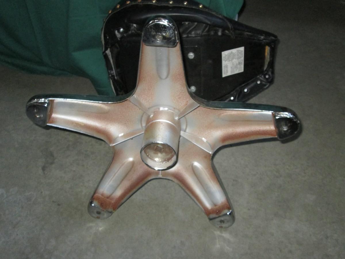 In good condition. Leather does not have any tears. There is some rust on the pole and underneath.