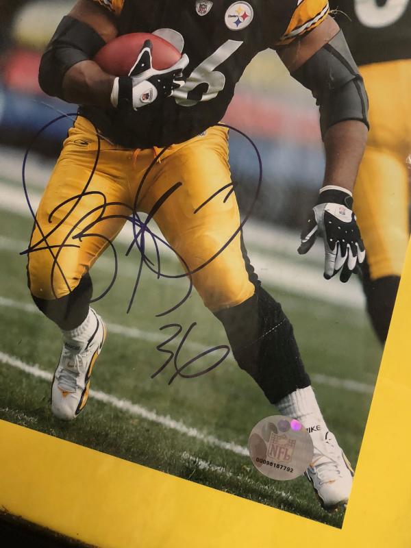 With a COA here is a framed autographed color photo of Pittsburgh Steelers Halfback Jerome Bettis in action...