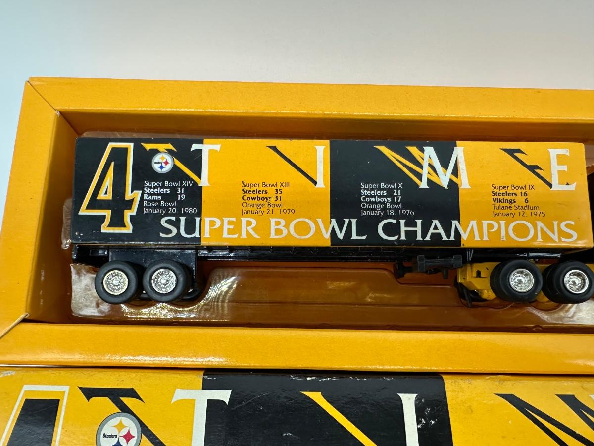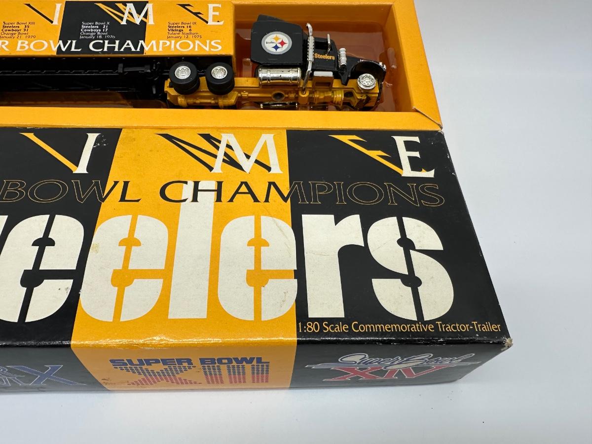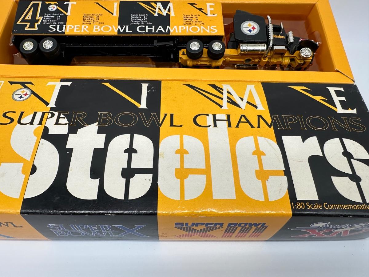 Limited-edition Pittsburgh Steelers commemorative diecast tractor-trailer truck, celebrating the team’s first four Super Bowl championships.