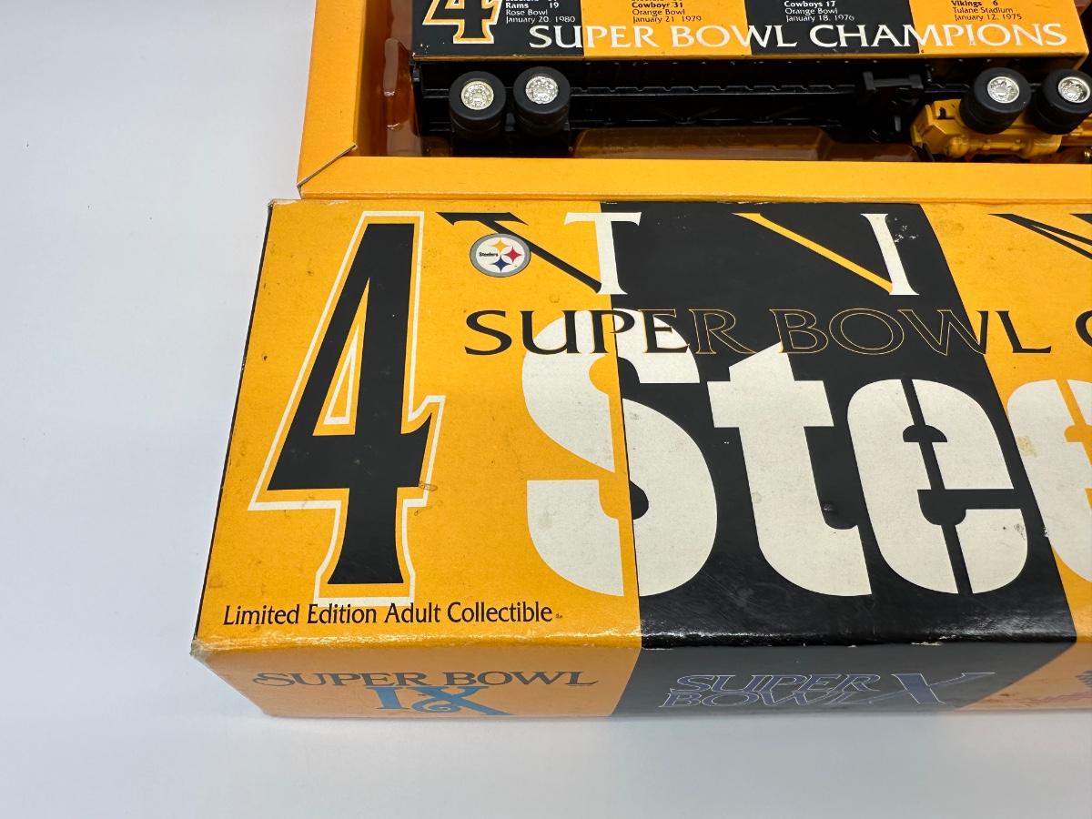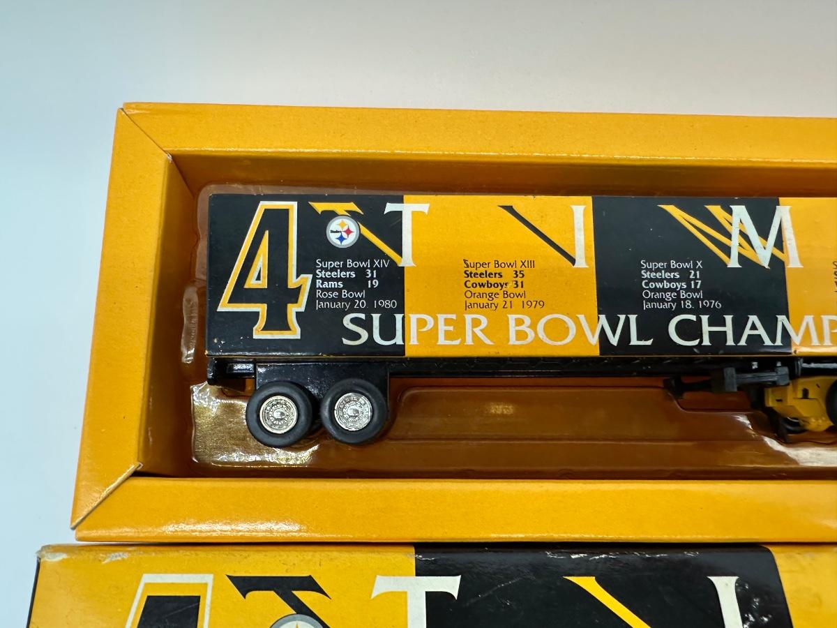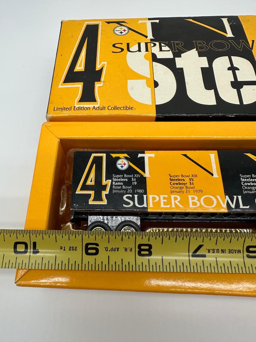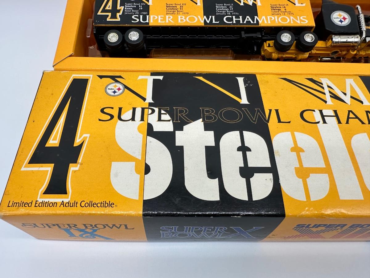 Limited-edition Pittsburgh Steelers commemorative diecast tractor-trailer truck, celebrating the team’s first four Super Bowl championships.