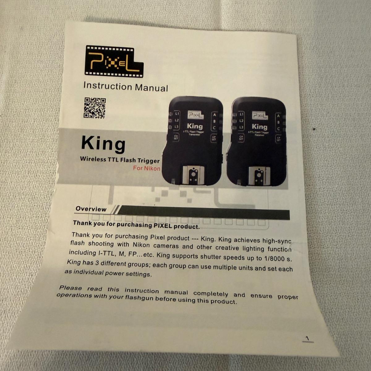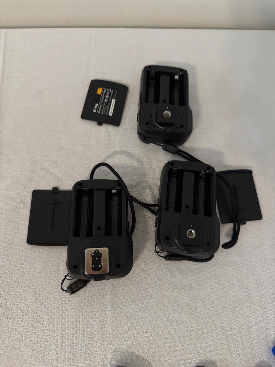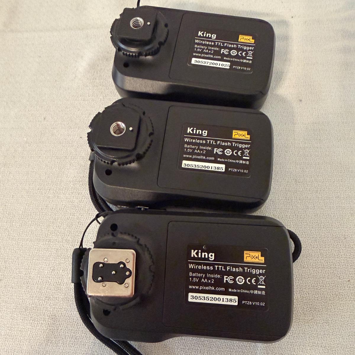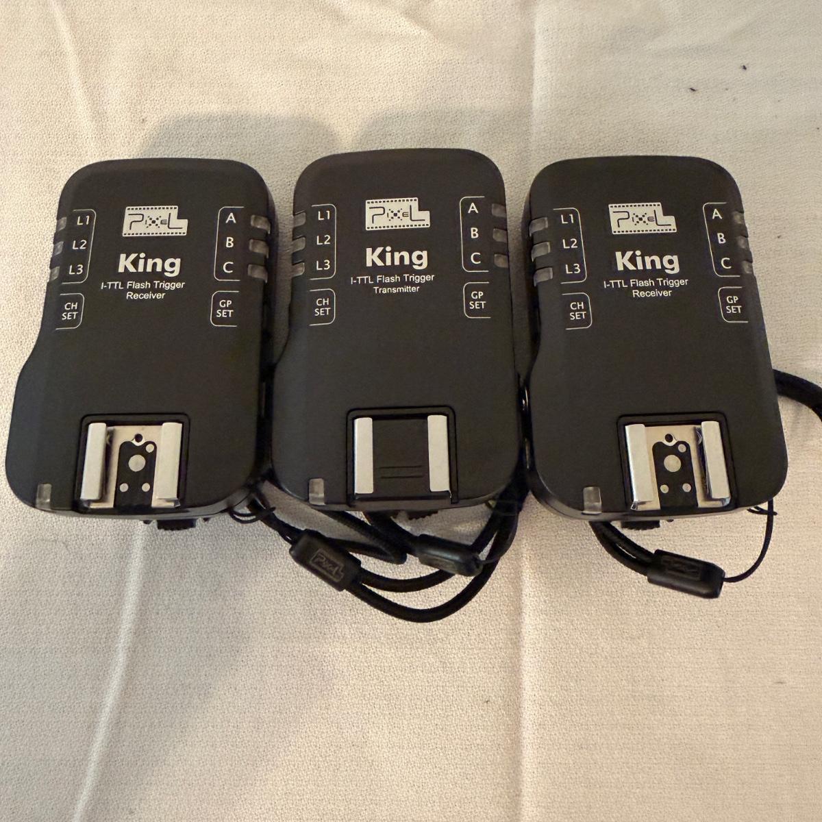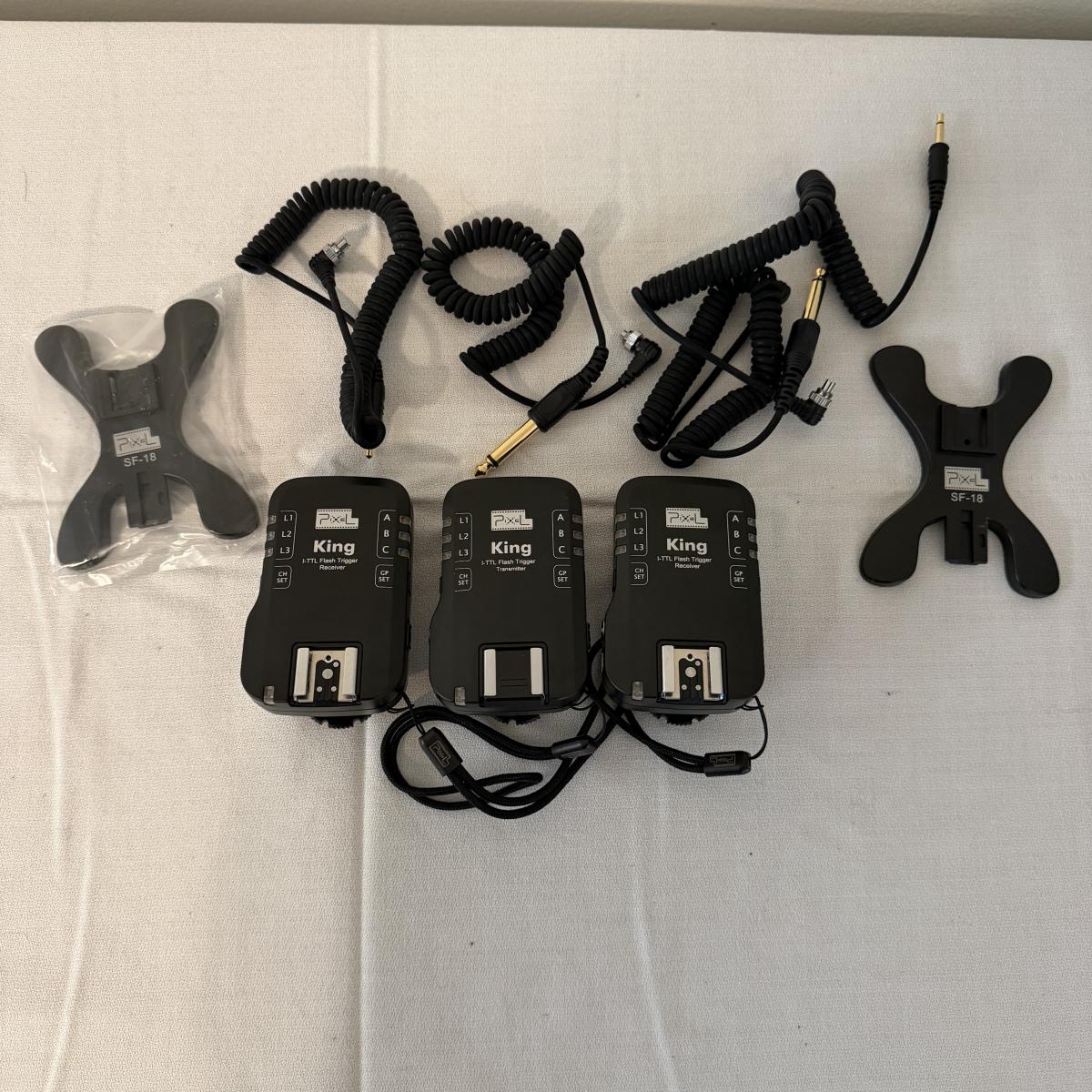 Lot includes three Pixel King wireless flash triggers. Also includes cases and cables. Items were not tested as they need batteries