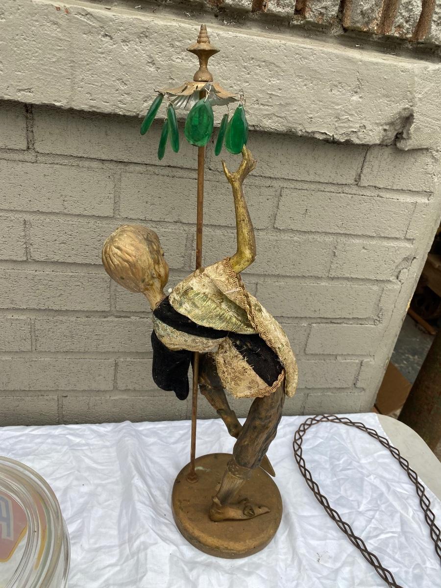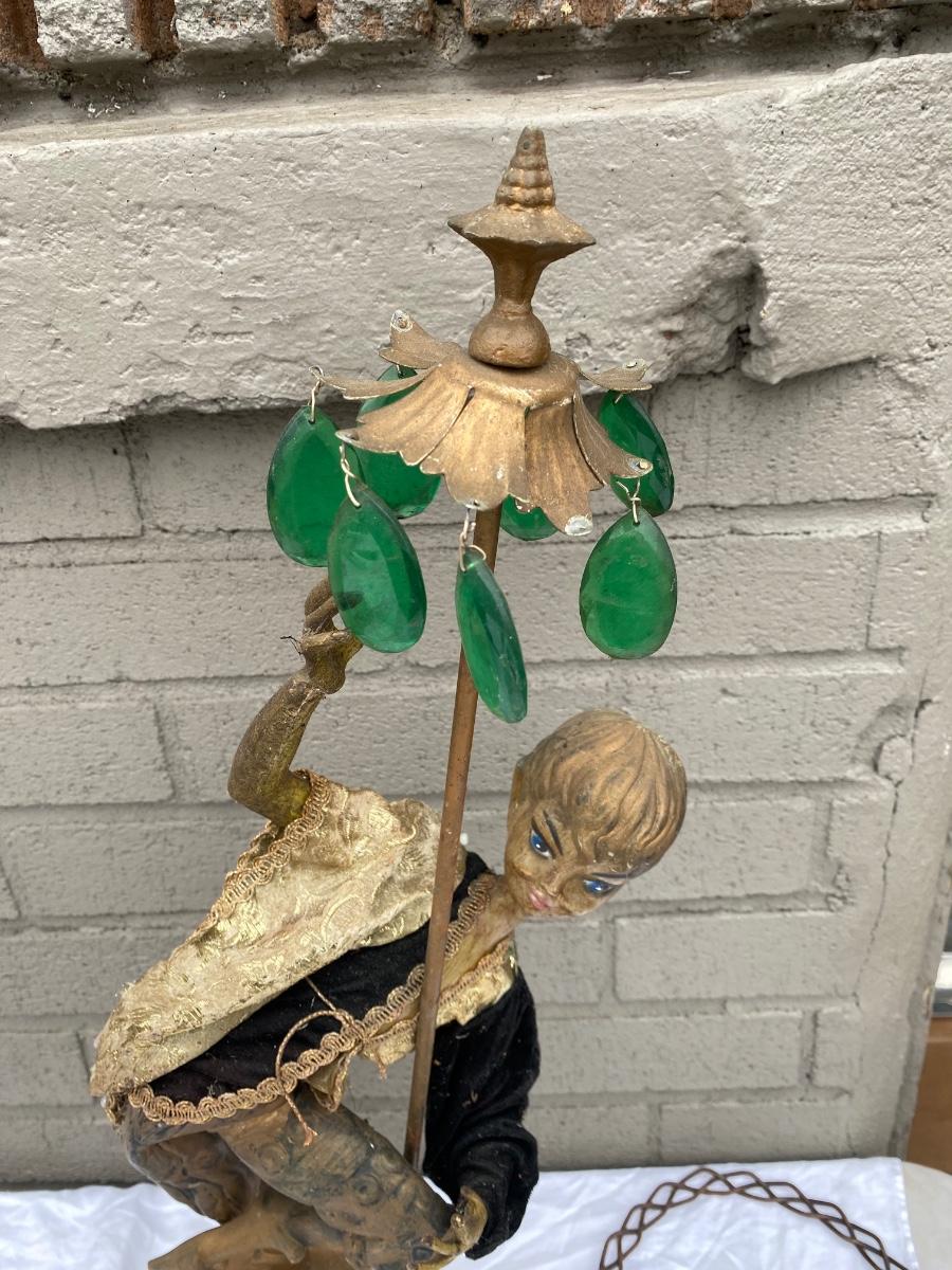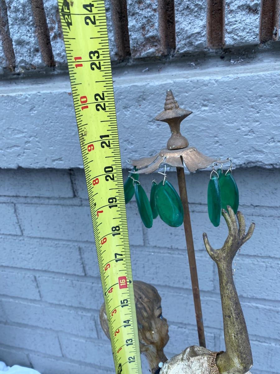 Pixie figure on pole, has glass beads, one is missing. Clothing is worn on back, but structuraly sound. 22" high