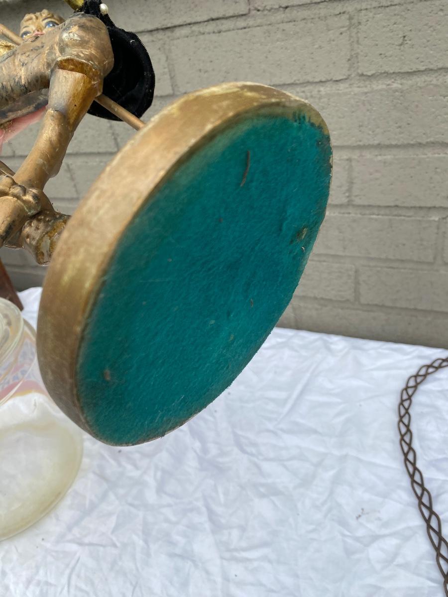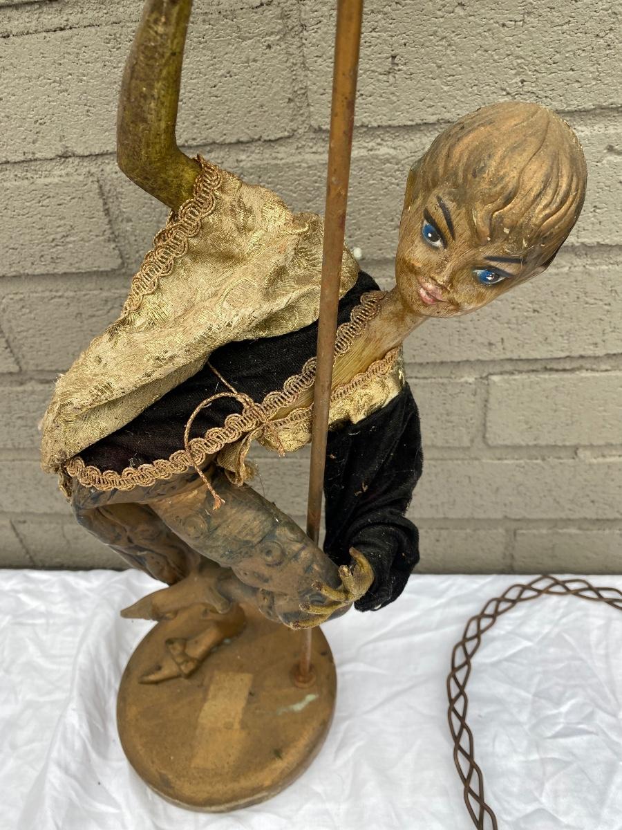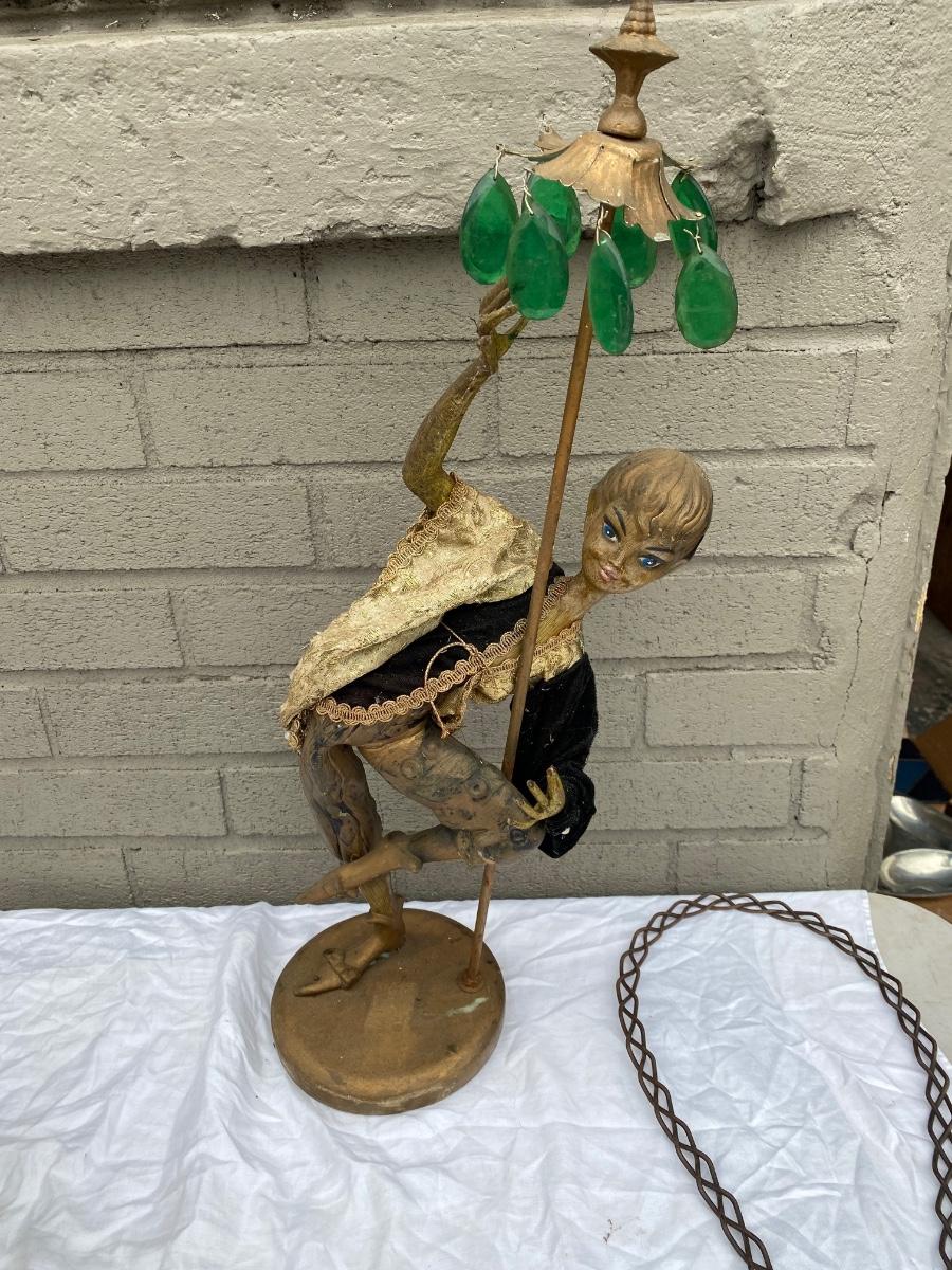 Pixie figure on pole, has glass beads, one is missing. Clothing is worn on back, but structuraly sound. 22" high