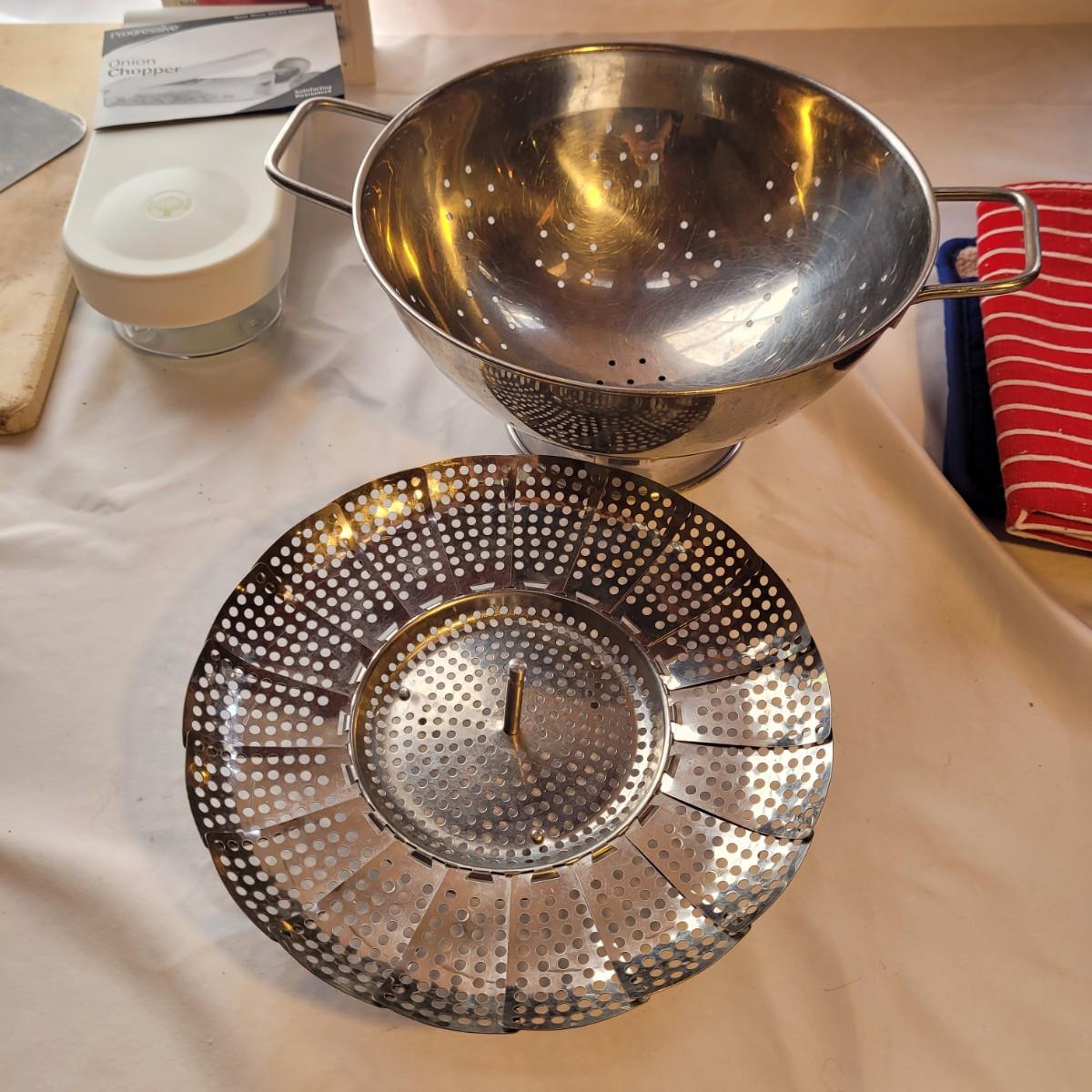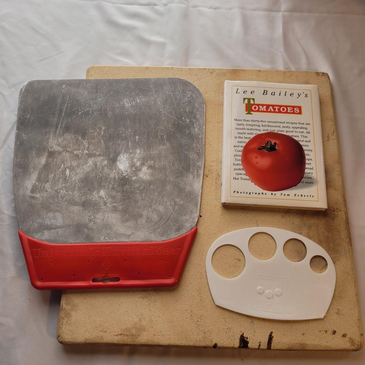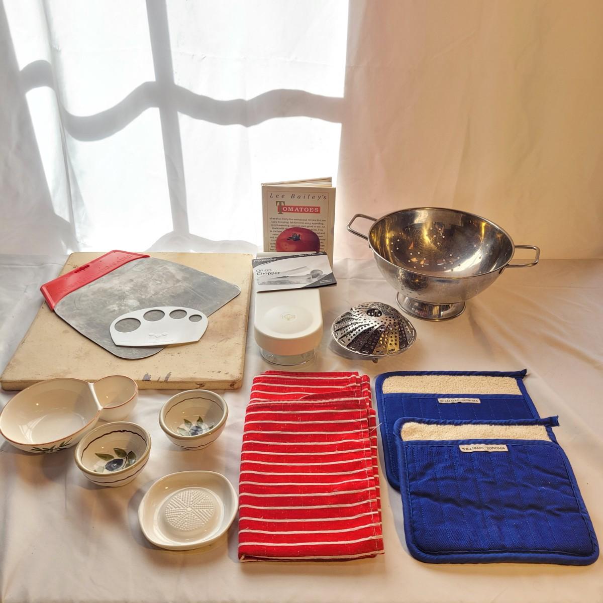 This fun lot has a variety of items for Italian themed cooking, including a pizza stone and peel, pasta measuring tool, onion chopper, garlic grater, olive bowls and more. Pizza stone measures approximately 14” x 15.” Shipping available.