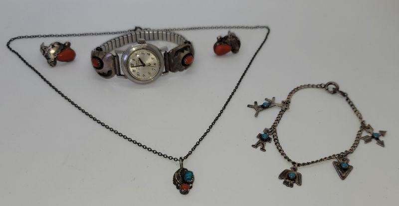 Signed silver Simpligio earrings. Necklace unmarked. Watchband sterling, signed P. White. Watch does not work. Bracelet is marked and several of the chains.