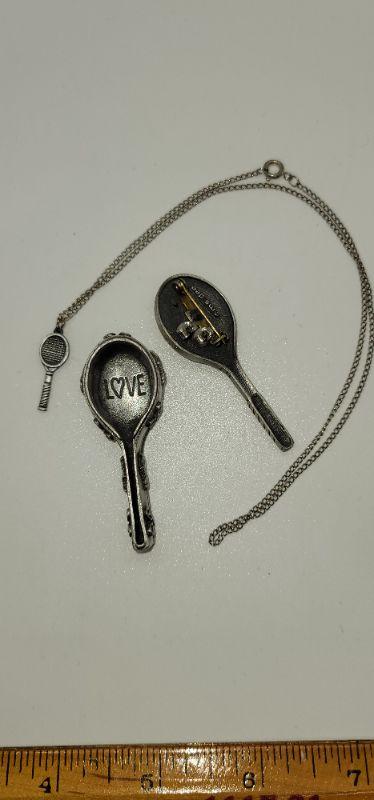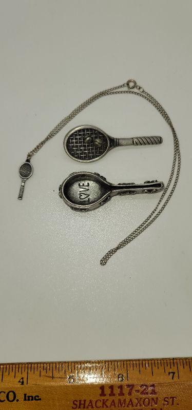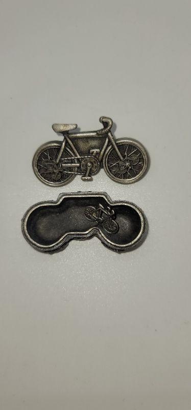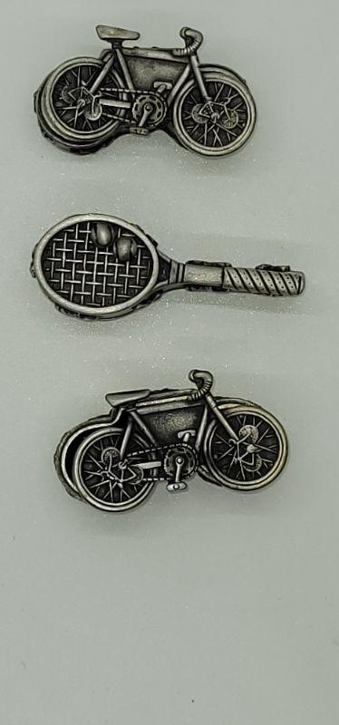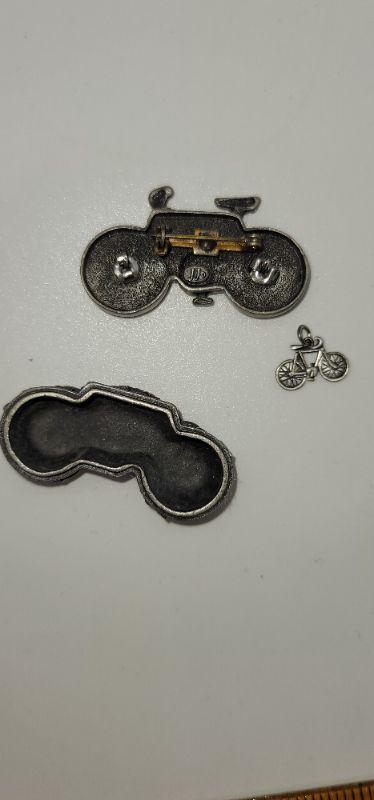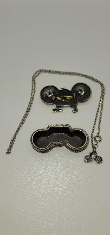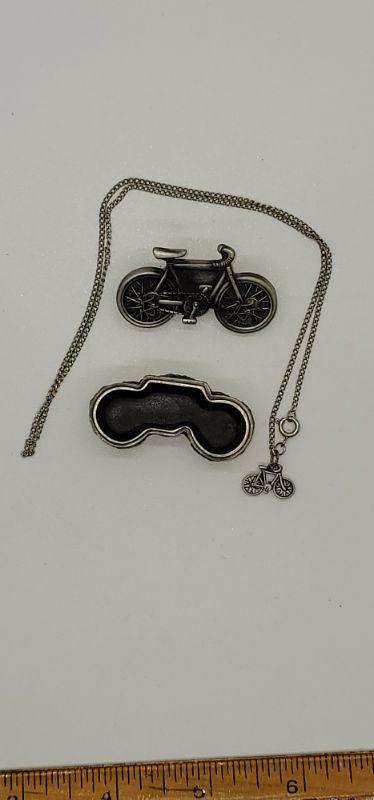 Each trinket Box holds a necklace , a pair of earrings and the top of the Box is a brooch. The bike and tennis racket are signed Ms. Dee, genuine pewter. One bike is marked JJ and it only has the pendant, it is missing the chain. Measurements are pictured.